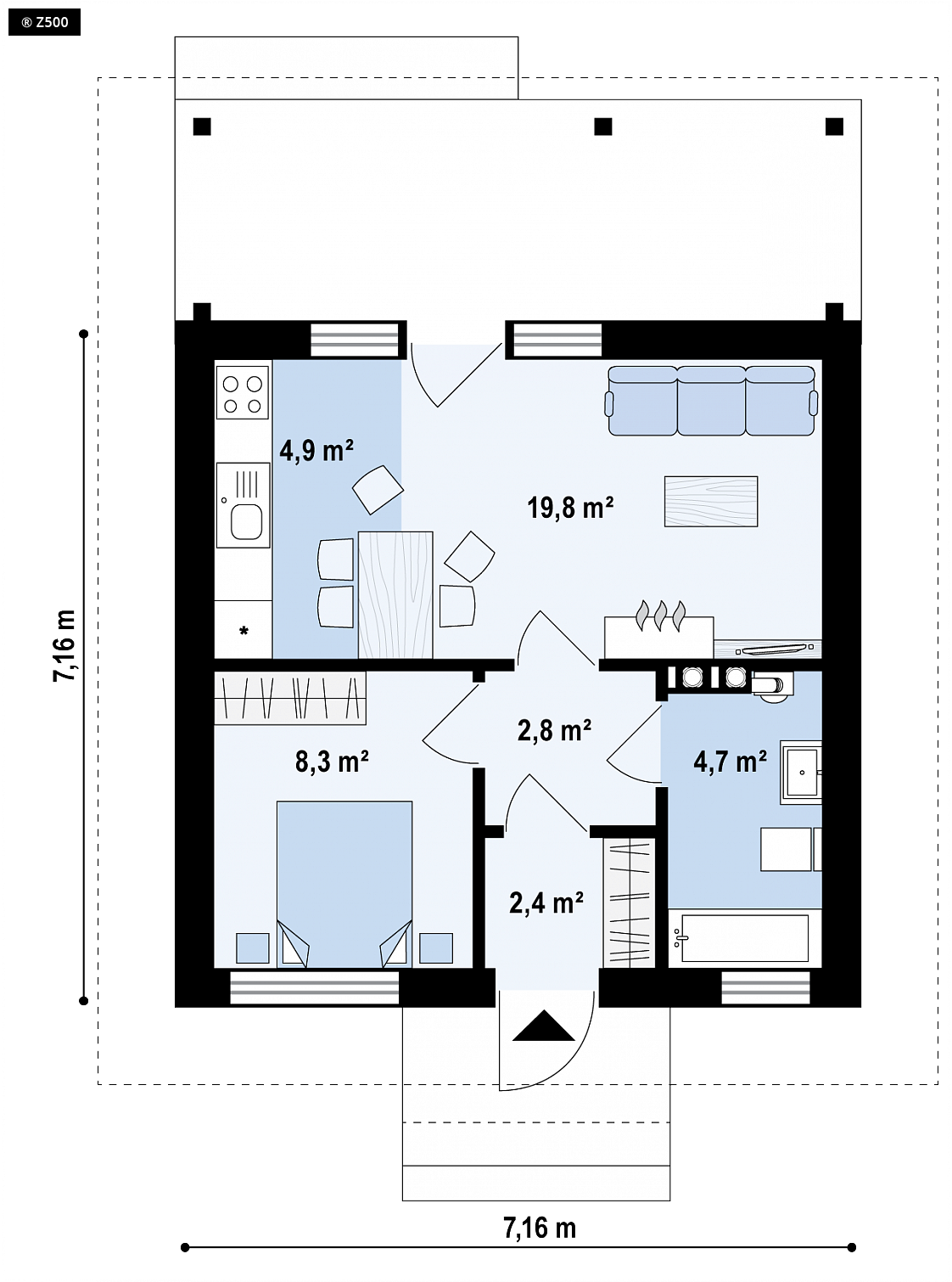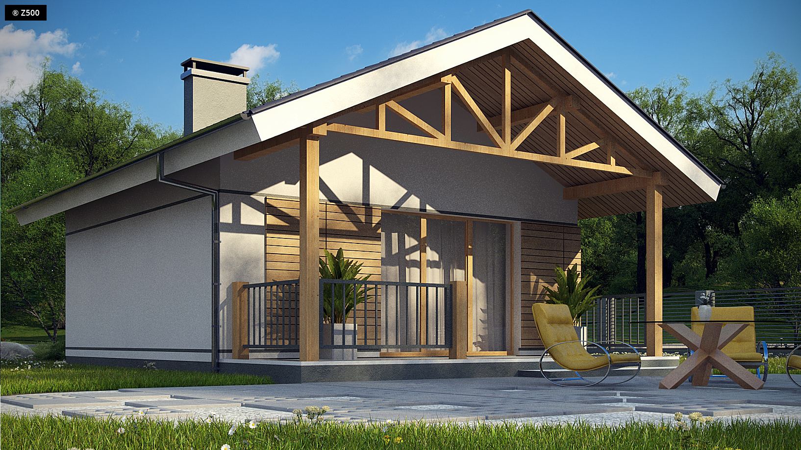 Z361 to bardzo mały dom o powierzchni użytkowej 43 m2. Może być przeznaczony dla osób starszych, lub jako domek letniskowy dla pracusiów zmęczonych zgiełkiem miejskiej codzienności. Pozwoli on wypocząć nad jeziorem, w górach, w lesie osobom zmęczonym jednostajnym rytmem życia. Czas spędzany na werandzie oraz aromatyczna filiżanka kawy z koniakiem o zachodzie słońca, pomogą zapomnieć o kłopotach i troskach dnia codziennego. Nieduże wymiary domu to dodatkowy atut, ponieważ dzięki temu domek jest szybki i tani w budowie oraz mieści się praktycznie na każdej działce.