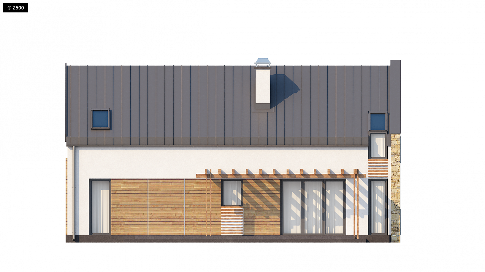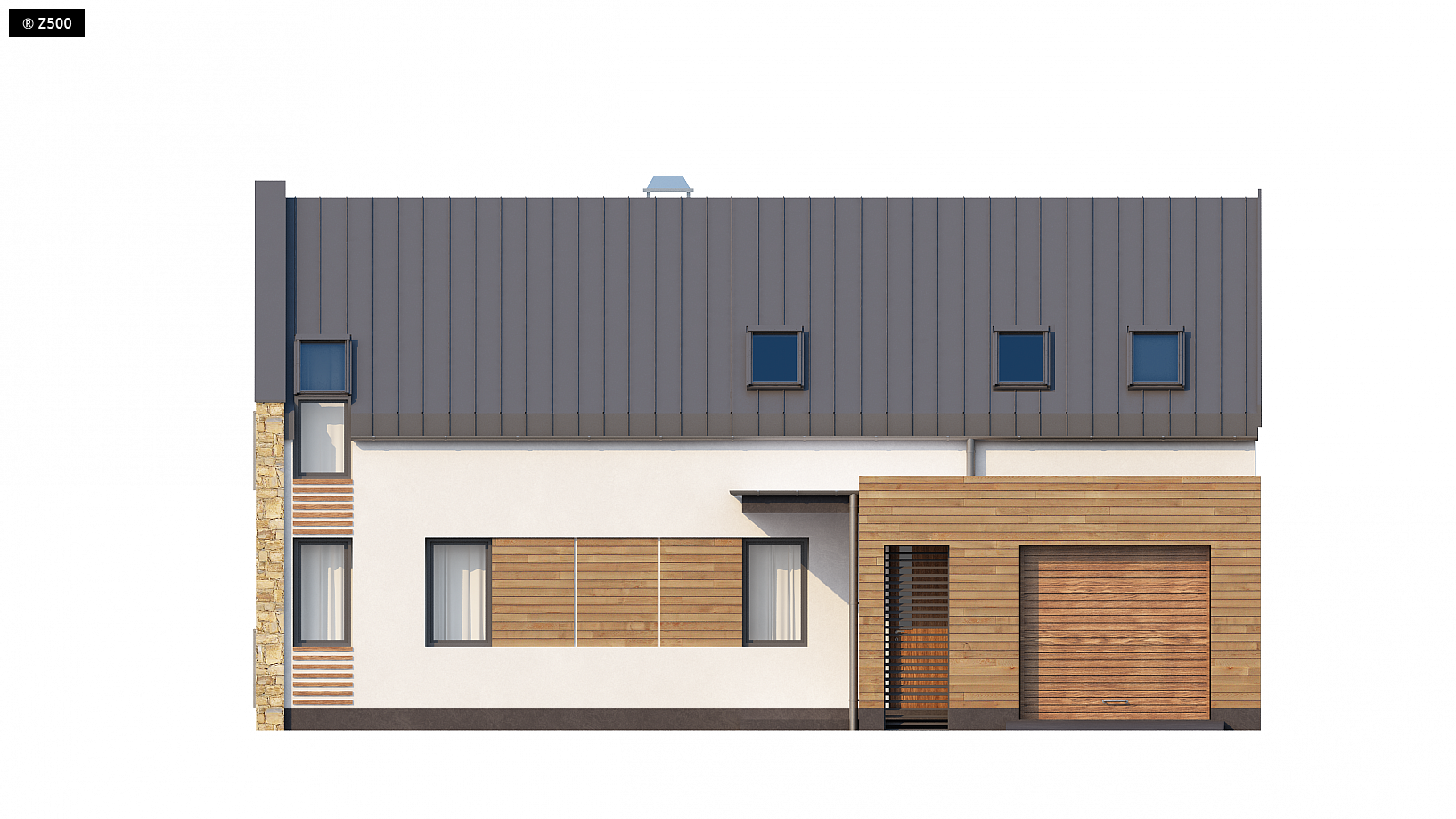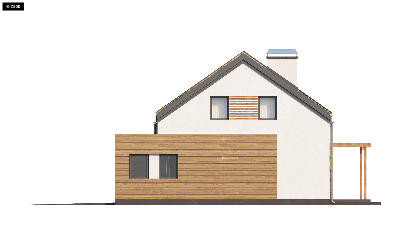 Zx38 to dom o zgrabnej formie. Ciekawe zestawienie różnych materiałów na elewacjach oraz rezygnacja z tradycyjnej formy dachu z okapem podkreślają nowoczesny charakter tego projektu. Wysunięty przed bryłę domu garaż z ciekawą formą zadaszenia tworzą atrakcyjną strefę wejściową. Część dzienna na parterze skupiona jest wokół centralnie umieszczonego kominka. Tworzą ją: salon z jadalnią oraz otwarta kuchnia z długim blatem roboczym oraz spiżarnią. Z holu dostępna jest łazienka z prysznicem, obszerne pomieszczenie gospodarcze oraz dodatkowy pokój. Może on, w zależności od potrzeb, pełnić funkcję sypialni, gabinetu lub pokoju dla gości. Program parteru uzupełnia jednostanowiskowy garaż dostępny z sieni. Na poddaszu mieszczą się 4 wygodne sypialnie oraz duża łazienka i garderoba. W dwóch sypialniach zaprojektowano nowoczesne okna dachowe z pionowym naświetlem. Zx38 to dom o prostej, zwartej bryle. Dach dwuspadowy oraz jeden komin czynią go energooszczędnym i tanim w budowie.