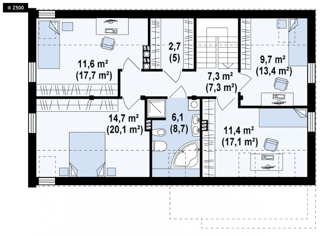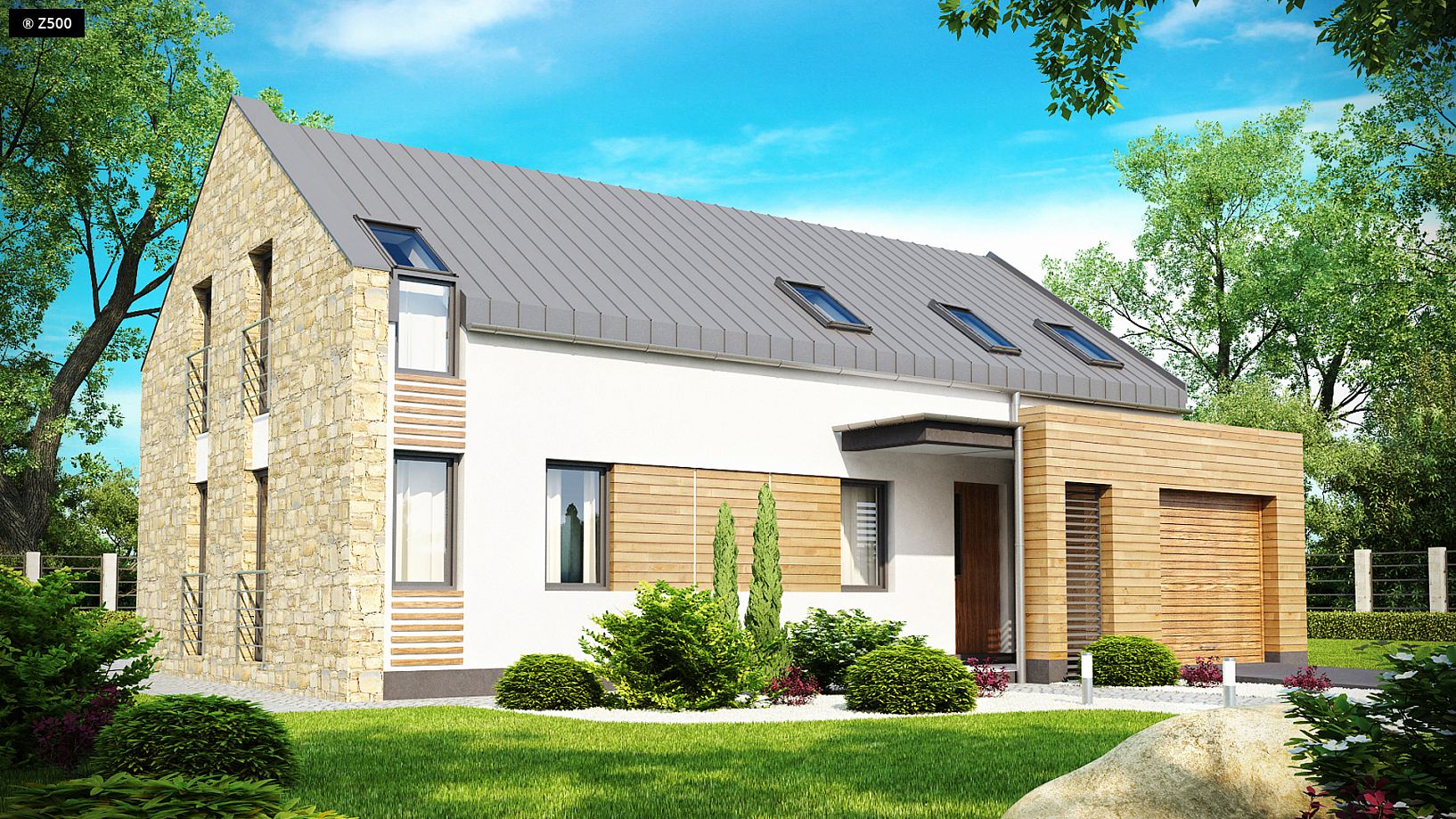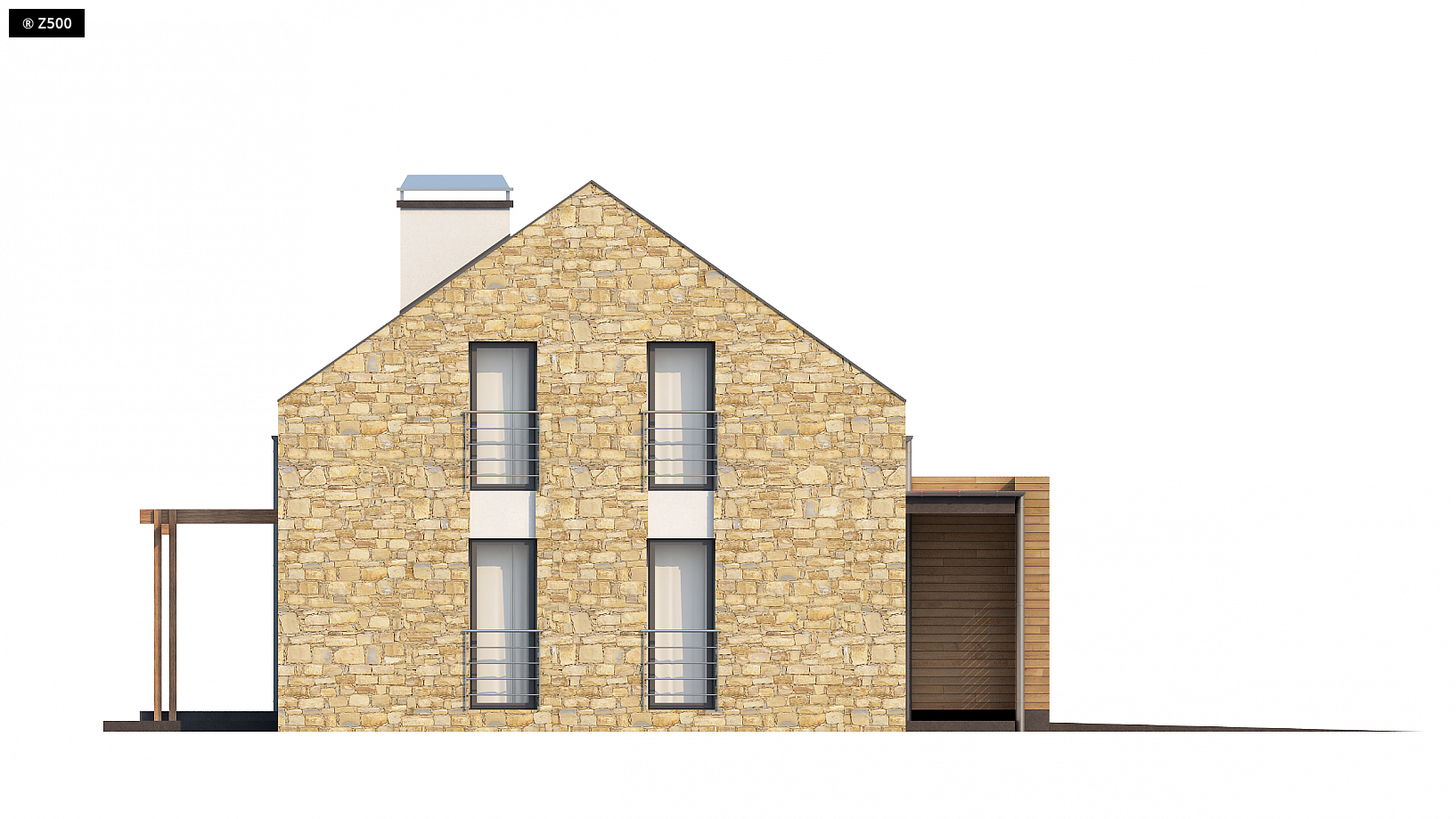 Zx38 to dom o zgrabnej formie. Ciekawe zestawienie różnych materiałów na elewacjach oraz rezygnacja z tradycyjnej formy dachu z okapem podkreślają nowoczesny charakter tego projektu. Wysunięty przed bryłę domu garaż z ciekawą formą zadaszenia tworzą atrakcyjną strefę wejściową. Część dzienna na parterze skupiona jest wokół centralnie umieszczonego kominka. Tworzą ją: salon z jadalnią oraz otwarta kuchnia z długim blatem roboczym oraz spiżarnią. Z holu dostępna jest łazienka z prysznicem, obszerne pomieszczenie gospodarcze oraz dodatkowy pokój. Może on, w zależności od potrzeb, pełnić funkcję sypialni, gabinetu lub pokoju dla gości. Program parteru uzupełnia jednostanowiskowy garaż dostępny z sieni. Na poddaszu mieszczą się 4 wygodne sypialnie oraz duża łazienka i garderoba. W dwóch sypialniach zaprojektowano nowoczesne okna dachowe z pionowym naświetlem. Zx38 to dom o prostej, zwartej bryle. Dach dwuspadowy oraz jeden komin czynią go energooszczędnym i tanim w budowie.
