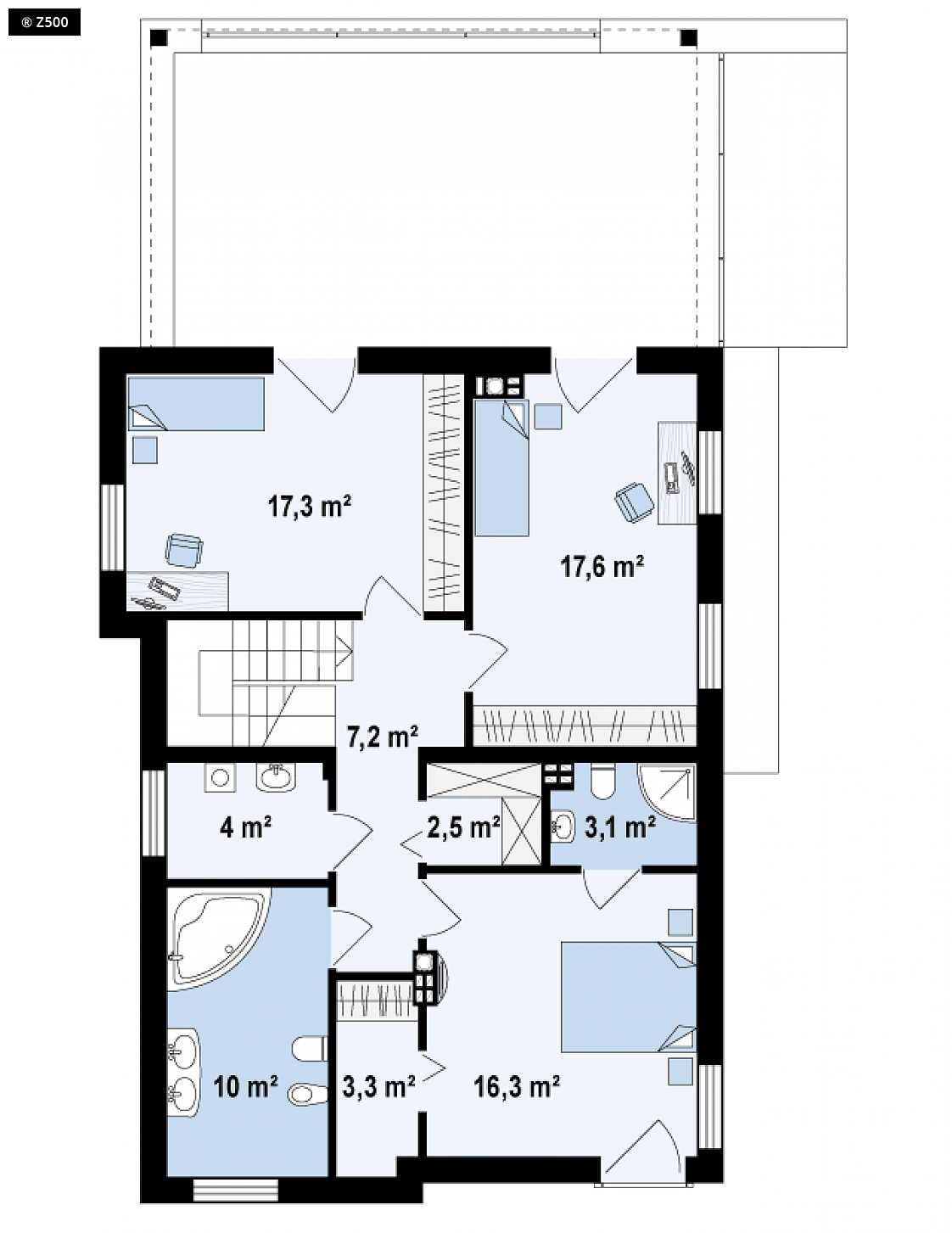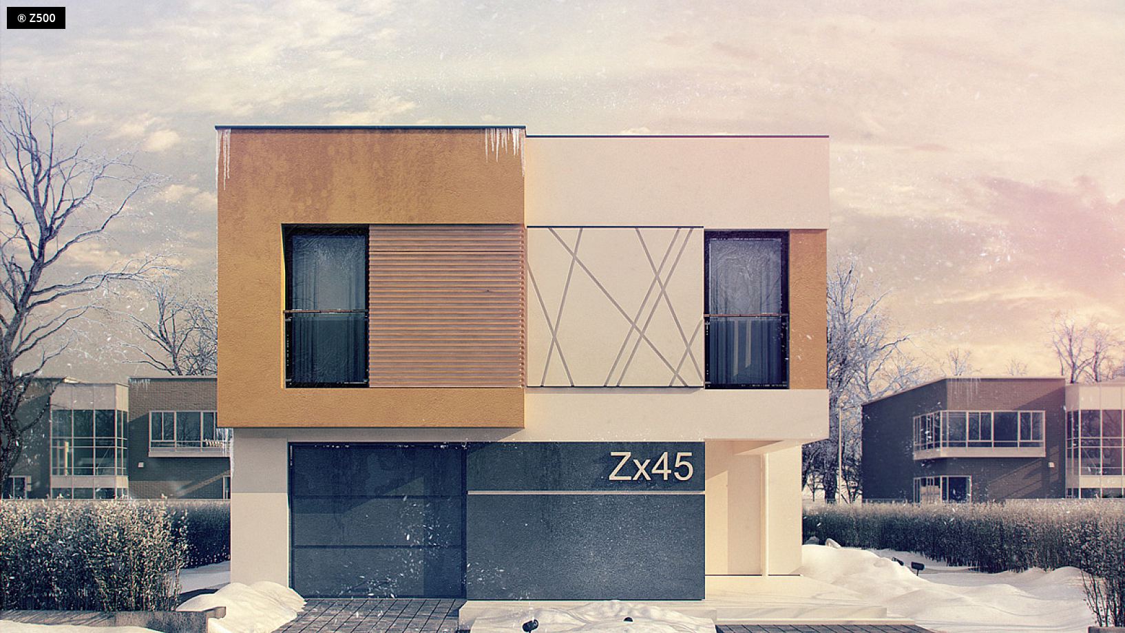 Zx45 to wyjątkowy piętrowy dom z garażem jednostanowiskowym w nowoczesnym stylu. Atrakcyjna bryła z płaskim dachem, funkcjonalne wnętrze oraz ciekawe elementy wykończenia elewacji nadają mu osobliwego uroku i wdzięku. Parter to komfortowa strefa dzienna z przestronnym salonem i dużą kuchnią. Program wzbogaca dodatkowo gabinet z wyjściem na taras, podręczna spiżarka oraz łazienka z prysznicem. W sieni znajduje się dużo miejsca na pojemną szafę. Piętro to prywatna strefa domowników. Tworzą ją trzy komfortowe sypialnie, każda z dużymi przeszkleniami. Master bedroom wyposażono we własną łazienkę oraz garderobę. Dodatkowo na tej kondygnacji znajduje się także duża, ogólnodostępna łazienka z oknem, pralnia oraz garderoba. Zx45 to projekt idealny dla ludzi ceniących nowoczesny styl.