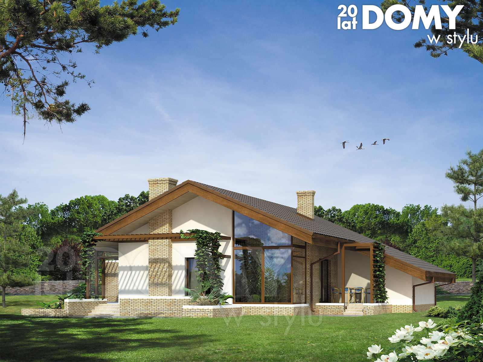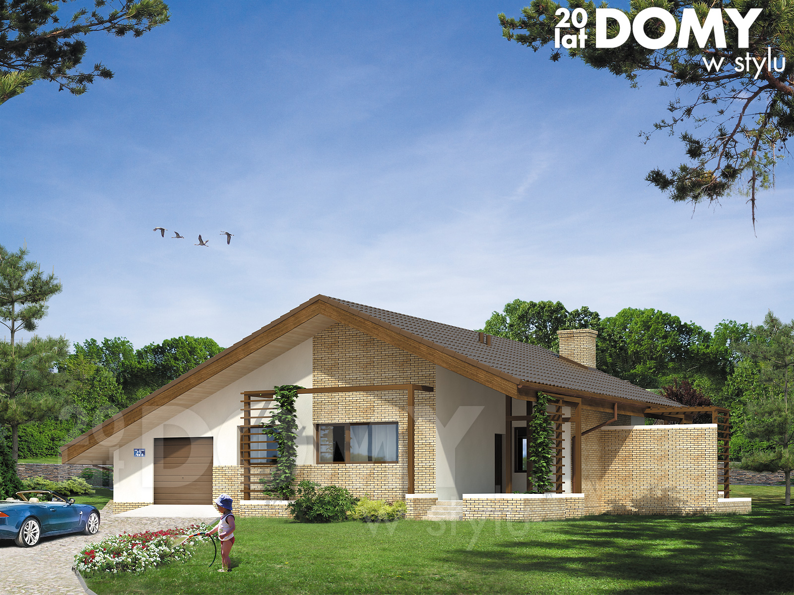 Niewielki, a jednocześnie nowoczesny dom parterowy z garażem w bryle budynku, charakteryzujący się bardzo ciekawą architekturą. Ten zaprojektowany z myślą o 4-osobowej rodzinie budynek zawiera w sobie kuchnię, salon, trzy wygodne sypialnie, łazienkę i toaletę. Elementami znacznie uatrakcyjniającymi architekturę budynku jest oranżeria, liczne tarasy, murki i pergole. Dzięki tym zabiegom dom zgrabnie przenika się z otaczającą go przestrzenią.