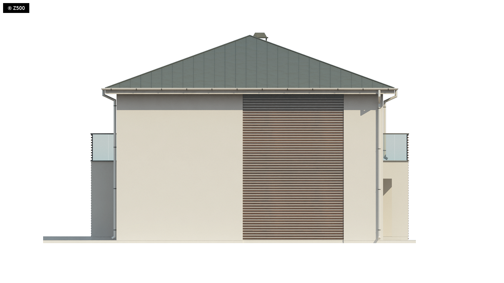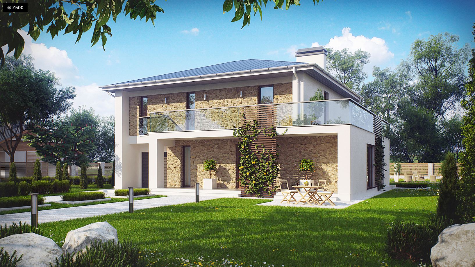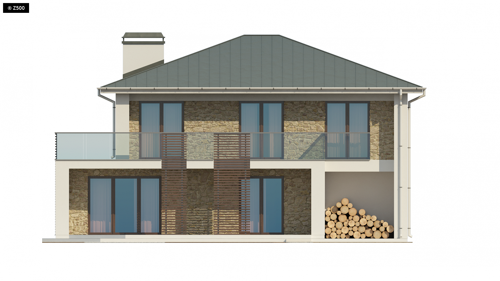 Zx55 to nowoczesny i funkcjonalny dom o eleganckiej formie architektonicznej i efektownie ukształtowanej przestrzeni wewnętrznej. Cechą wyróżniającą projekt jest obszerny taras na piętrze, który stanowi jednocześnie zadaszenie wejścia oraz tarasu na parterze.Połączenie bieli oraz kamienia na elewacjach tworzy spójną całość o wysokiej estetyce. Na parterze znajduje się komfortowa strefa dzienna z salonem oraz częściowo wydzieloną jadalnią i kuchnią. Można się do niej także dostać z holu przez centralnie usytuowane pomieszczenie gospodarcze. Zaprojektowano tu również dodatkowy pokój i dużą łazienkę z wydzieloną strefą pralni. Piętro to część nocna z trzema pokojami, ogólnodostępną łazienką i garderobą. Główna sypialnia to wydzielony apartament z własną garderobę oraz łazienkę. Z większości pomieszczeń prowadzi wyjście na przestronny taras. Projekt Zx55 będzie domem wyróżniającym się w sąsiedztwie nie tylko detalem, ale i kubistyczną formą.