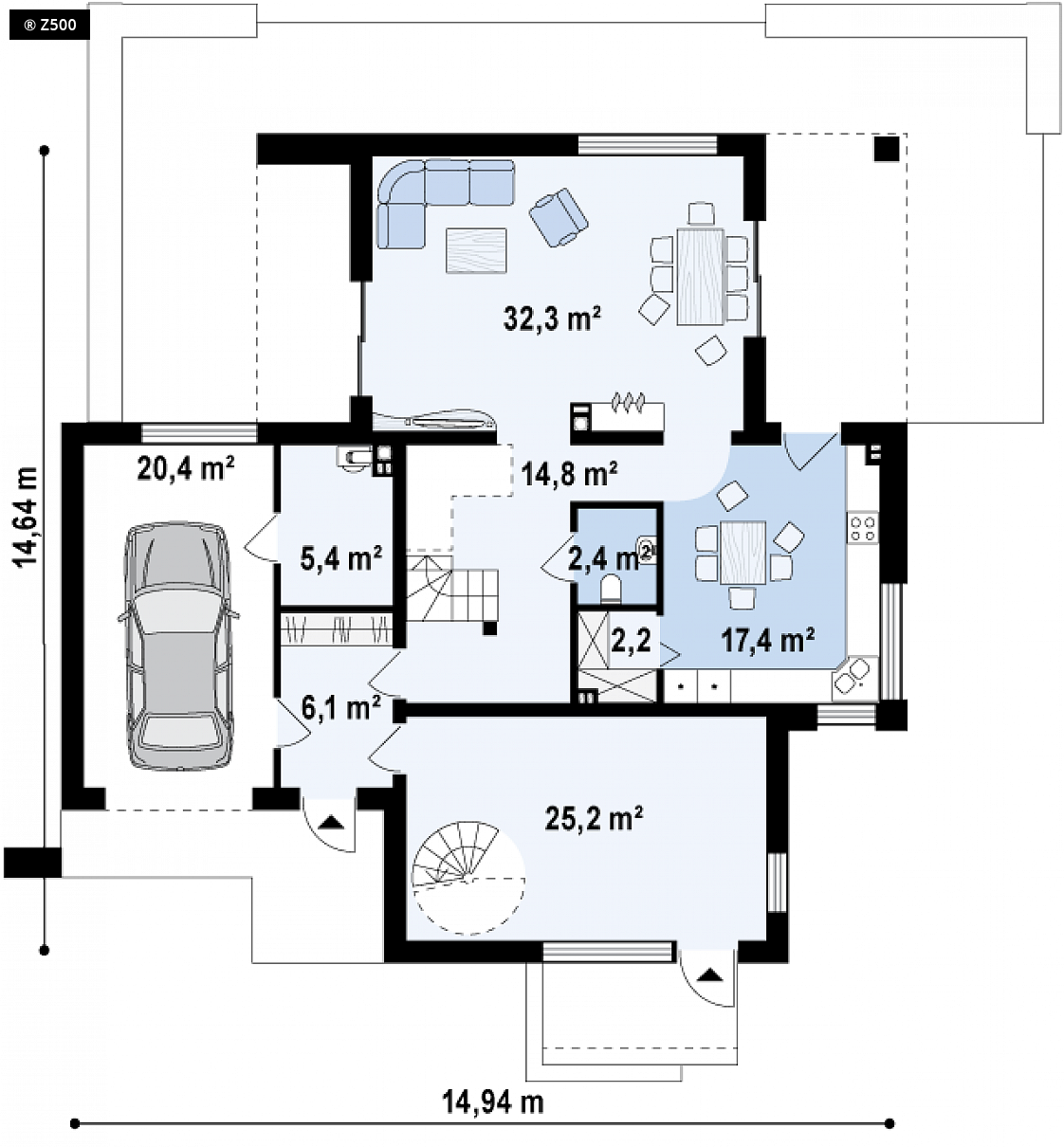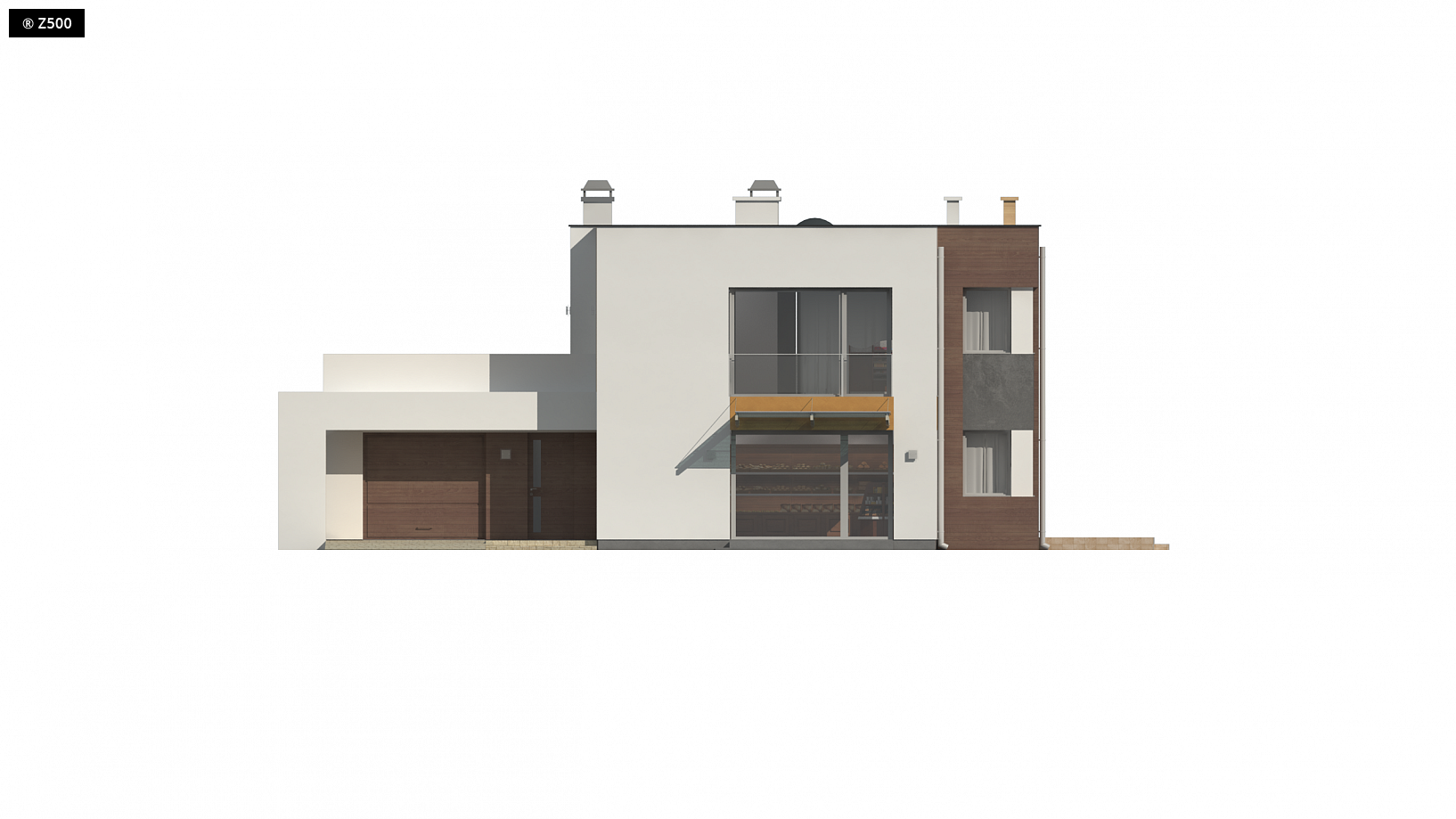 Zx64 to komfortowy dom jednorodzinny z garażem jednostanowiskowym. Płaski dach, ciekawa modernistyczna forma oraz duże przeszklenia i tarasy nadają mu wyjątkowego stylu. Zx64 to przestronny dom dla poszukujących nowoczesnych rozwiązań. Na parterze znajduje się obszerna strefa dzienna. Jej główne zalety to duża kuchnia z jadalnią i spiżarką. Idealnie doświetlony salon posiada duże przeszklenia oraz dwa zadaszone tarasy, które pozwolą cieszyć się otaczającą przyrodą. Wygodne schody prowadzą na piętro, gdzie zaprojektowano trzy podobnej wielkości sypialnie. Sypialnia rodziców to niemal prywatny apartament z własną garderobą, łazienką oraz wyjściem na taras. W projekcie zaplanowano od frontu wydzieloną dwukondygnacyjną część z osobnym wejściem. Dodatkową powierzchnię około 50 mkw można wykorzystać po adaptacji na biuro, sklep lub inne usługi. Można również zrezygnować ze schodów i na parterze urządzić wygodny gabinet oraz sypialnię na piętrze. Wtedy uzyskamy w sumie aż 5 pokoi.