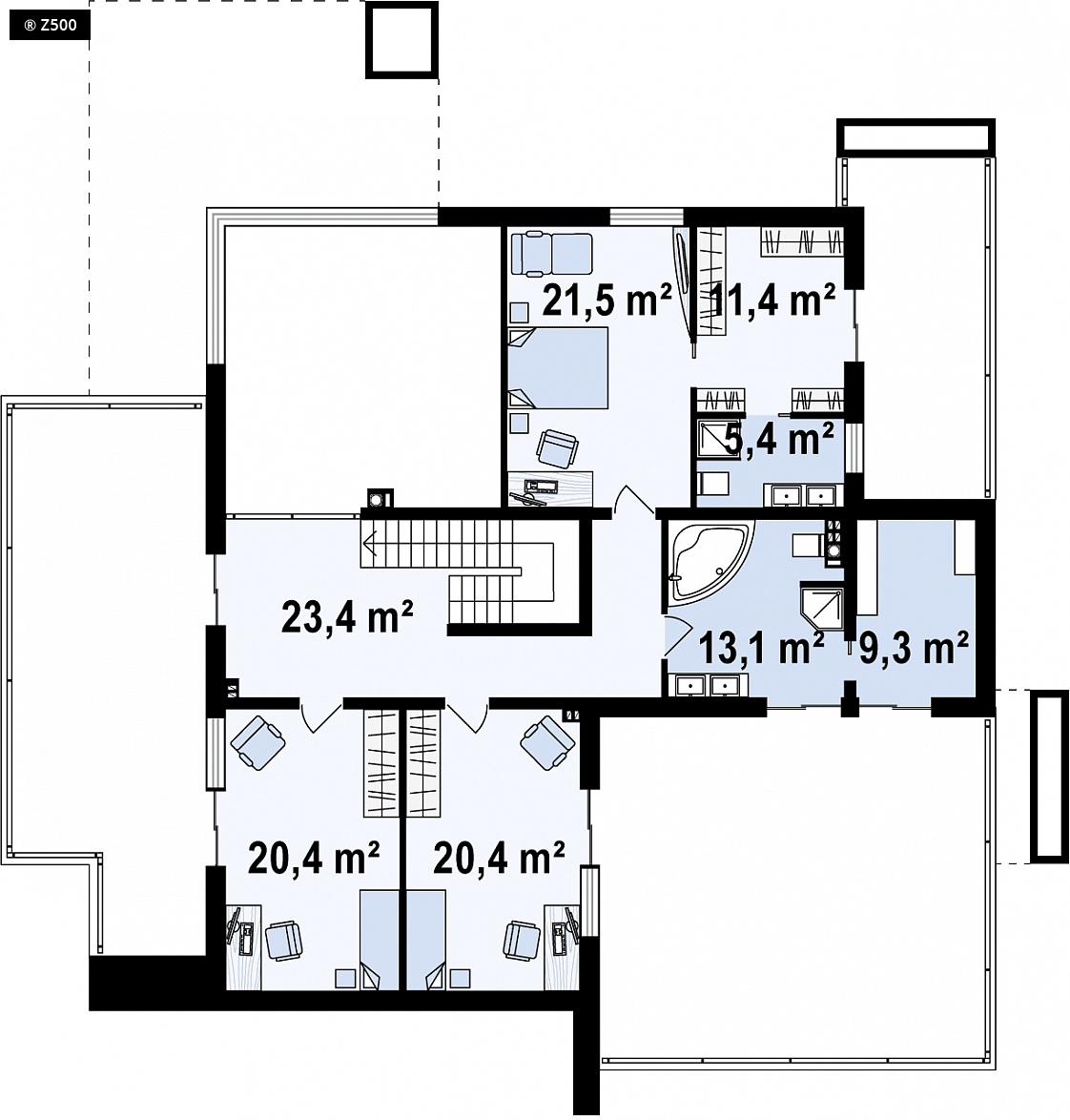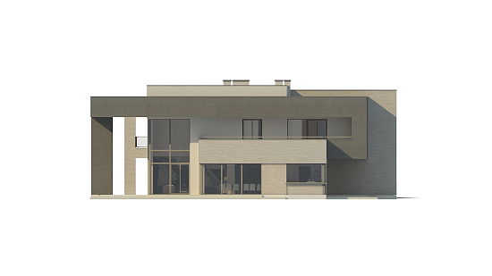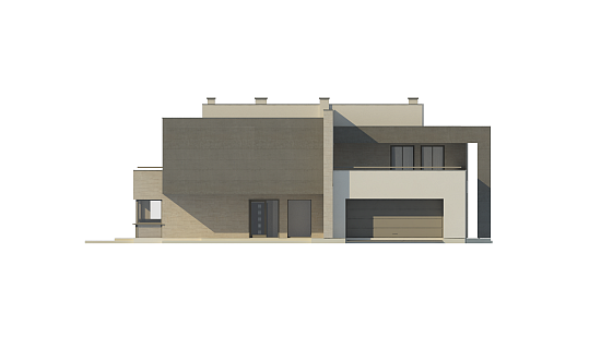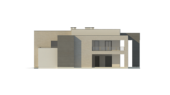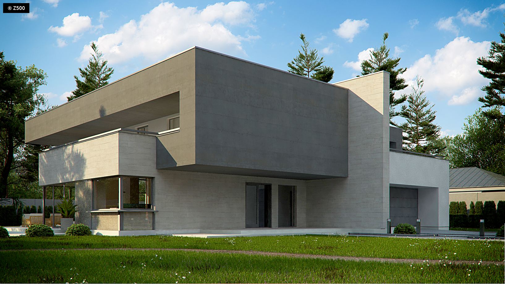 Zx127 jest projektem dużego, nowoczesnego, piętrowego domu, wywierającym ogromne wrażenie na każdym, kto gustuje w stylu modern. Proste, nakładające się na siebie geometryczne bryły, tworzą kilka oddzielnych warstw budynku, poprzeplatanych napawającymi ogromem powierzchni tarasami. Odcienie bieli i szarości możemy dobierać dowolnie, swobodnie dysponując tonacją kolorystyki elewacji. Magia dwukondygnacyjnych przeszkleń elewacji od strony ogrodu, rysuje na ścianach wnętrza domu tęczowe wzory, rozpromieniając jego wnętrze ciepłem słonecznych promieni. Nad dwustanowiskowym garażem uzyskaliśmy piękną powierzchnię tarasu przeznaczonego dla kąpieli słonecznych lub porannej gimnastyki na świeżym powietrzu. Wejście do domu zadaszono podcieniem, który chroni przed wiatrem, deszczem i śniegiem. W sieni zarówno po prawej jak i po lewej stronie mamy dużo miejsca przeznaczonego na szafy wnękowe, które pomieszczą przysłowiowe morze damskich butów i płaszczy. Parter przeznaczono na dzienną strefę mieszkalną. Obszerny salon połączono z jadalnią i aneksem kuchennym, z którym sąsiaduje spiżarka. Całość od salonu oddziela wyspa barowa. Ogromny atut w projekcie Zx127 stanowi antresola z dużymi pionowymi przeszkleniami. Dzięki nim możemy hodować tu większą ilość roślin, które sprawią, że z przyjemnością będziemy „bujać w obłokach” przed kominkiem zaczytani naszymi ulubionymi gatunkami literackimi. Z gabinetu pracy lub pokoju gościnnego wychodzimy na przestronny taras, którego ostateczny kształt zależeć będzie od wyrafinowanej fantazji właścicieli tego osobliwego budynku. Piętro domu to prywatna i nocna strefa naszej fortecy oraz kraina wypoczynku zarazem. Trzy duże tarasy, antresola, trzy pokoje, z czego jeden posiadający osobistą łazienkę i garderobę, pralnia i rozplanowane duże przestrzenie, przemienią nasz dom w prawdziwe królestwo upragnionego wytchnienia, które ukoi nasze skołatane nerwy. Dom ten dedykowany jest dla rodziny o wielkich sercach spragnionych wypoczynku.