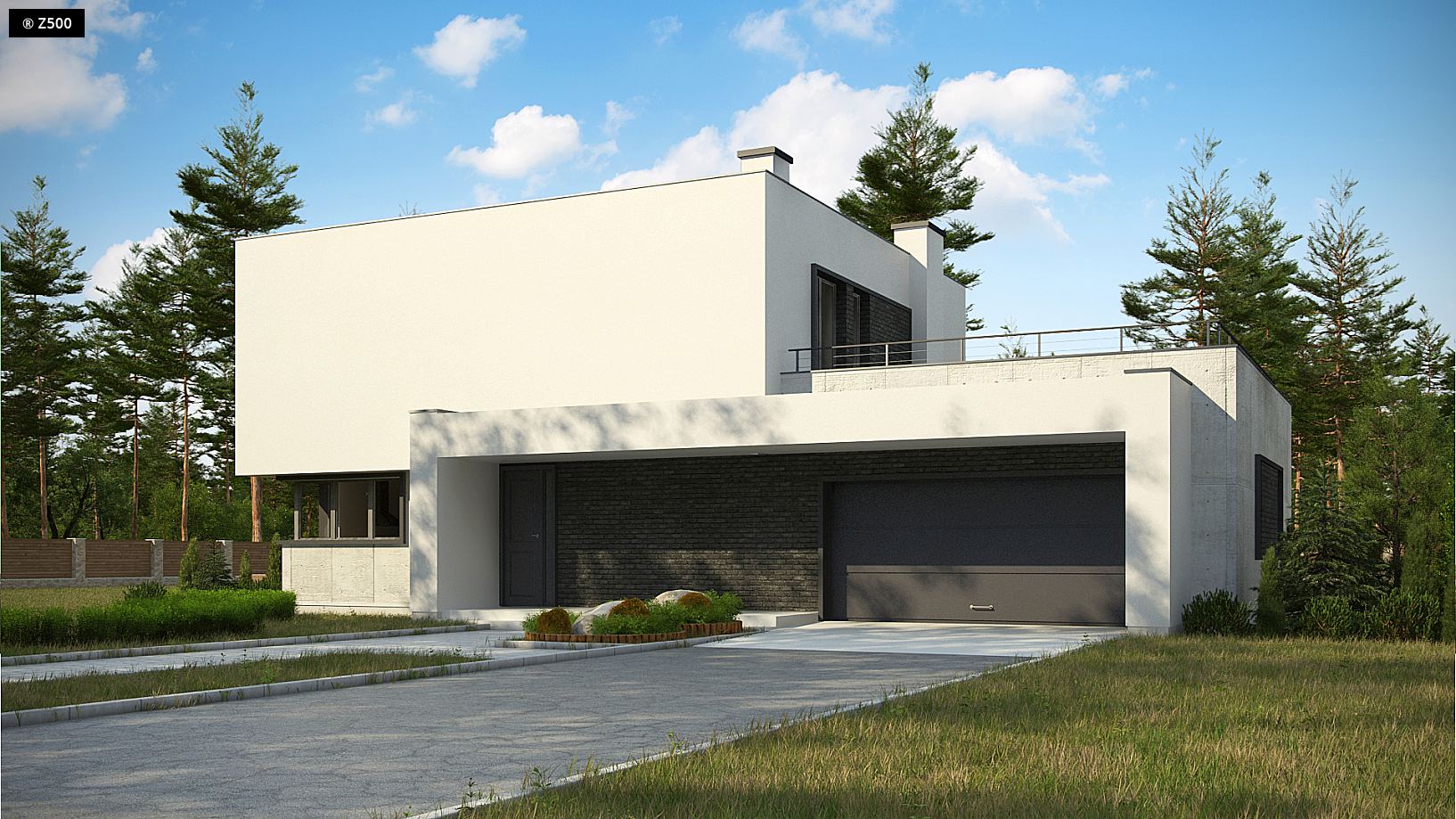 Zx130 Jest propozycją domu dla większej rodziny. Czysta forma, minimalistyczne kształty, nowoczesna bryła i współczesna architektura to główne zalety projektu Zx130. Materiały elewacyjne to beton architektoniczny, biały tynk, i ciemna płytka klinkierowa. 2 stanowiskowy garaż, pomieszczenie gospodarcze i schowek na narzędzia wydzielono w niemieszkalnej części domu. Wejście do środka prowadzi z kilku stron, a przeszklona część salonu dzienna wywołuje złudzenie, że górna bryła jest zawieszona w powietrzu. Całość budynku podzielono na część dzienną i nocną. Na parterze ulokowano przestronny salon, jadalnię i gabinet. Piętro to 4 pokoje. Każdy z nich posiada osobistą garderobę, a dodatkowo sypialnia rodziców wyposażono w łazienkę. Nad garażem znajduje się taras rekreacyjny, który sąsiaduje z dużym pokojem kąpielowym. Stanowi on urozmaicenie układu funkcjonalnego projektowanego budynku. Zx130 jest projektem zadedykowanym dla sporej rodziny lubiącej przestrzeń, wygodę i nowoczesny styl.