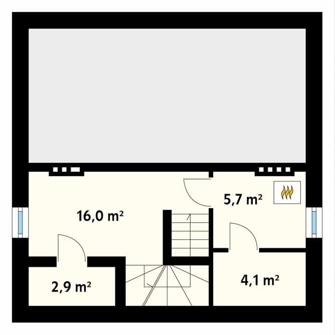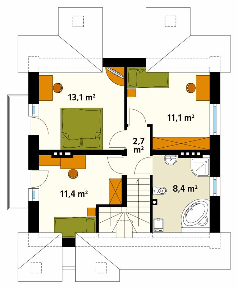 Niewielki, ale bardzo funkcjonalny dom przeznaczony dla 4-osobowej rodziny. Na parterze zaprojektowano salon z kominkiem oraz jadalnią i osobną kuchnią, zaś na poddaszu trzy wygodne sypialnie, z których dwie posiadają wyjście na balkon i łazienkę. W piwnicy zlokalizowano pomieszczenie gospodarcze i kotłownię. Istnieje możliwość całkowitego podpiwniczenia i zaprojektowania podziemnego garażu.