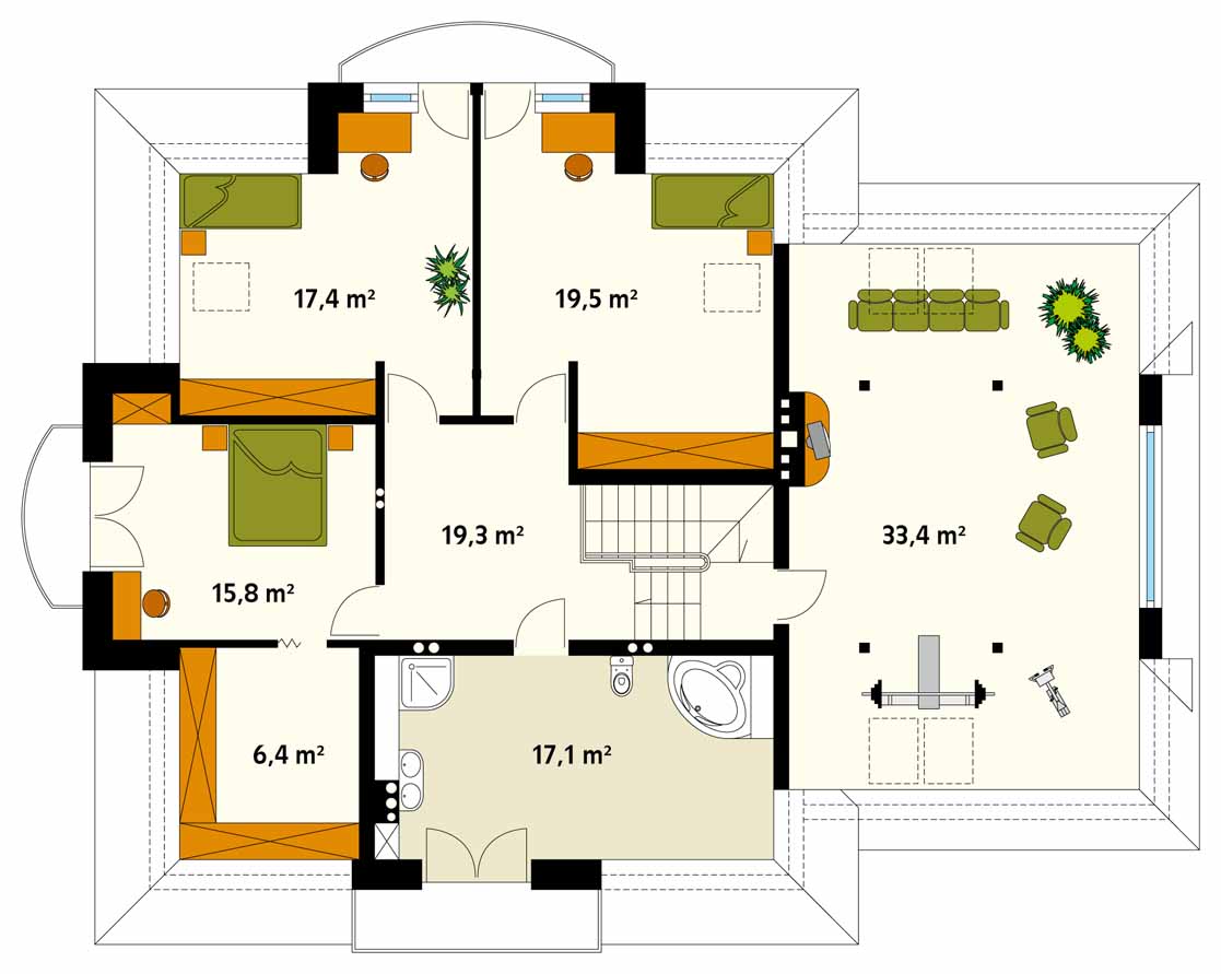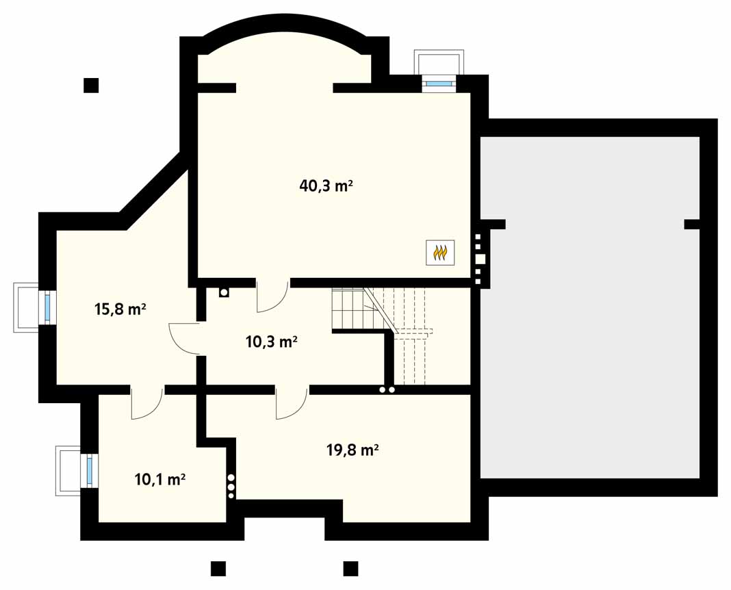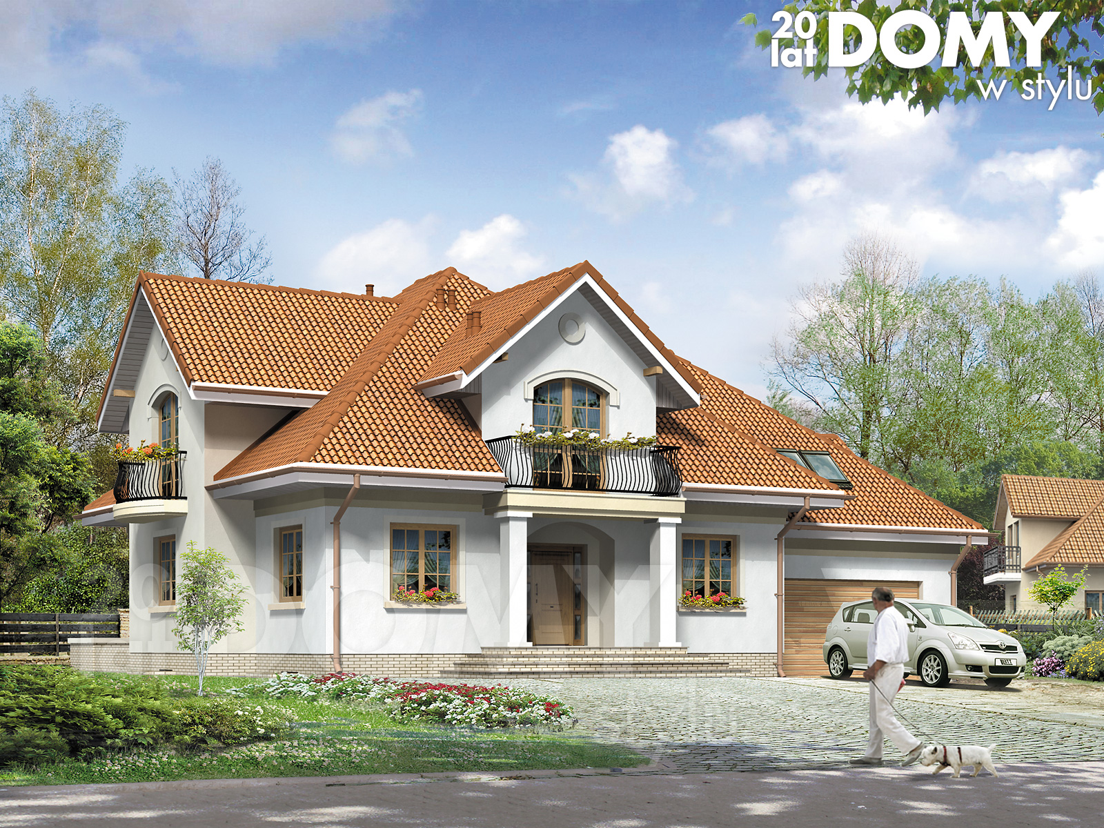 Przestronny, wygodny i reprezentacyjny dom jednorodzinny z użytkowym poddaszem. Układ funkcjonalny domu został zaprojektowany tak, aby zapewnić komfort przyszłym mieszkańcom. Na parterze w części dziennej zaplanowano kuchnię, jadalnię i duży salon. Dodatkowym atutem projektu jest obecność pokoju na parterze, który może pełnić funkcję gabinetu. Na poddaszu znajdują się trzy wygodne sypialnie, w tym jedna z garderobą oraz łazienka. Dzięki wykorzystaniu sporej przestrzeni nad garażem powstało dodatkowe pomieszczenie rekreacyjne. W ramach części gospodarczej domu zaprojektowano dwustanowiskowy garaż i piwnicę.