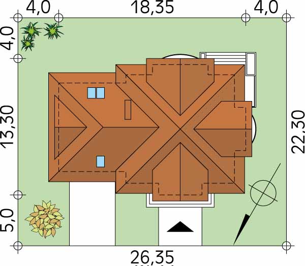 Dach: wielospadowy, nachylenie 40°, pokrycie z dachówki ceramicznej