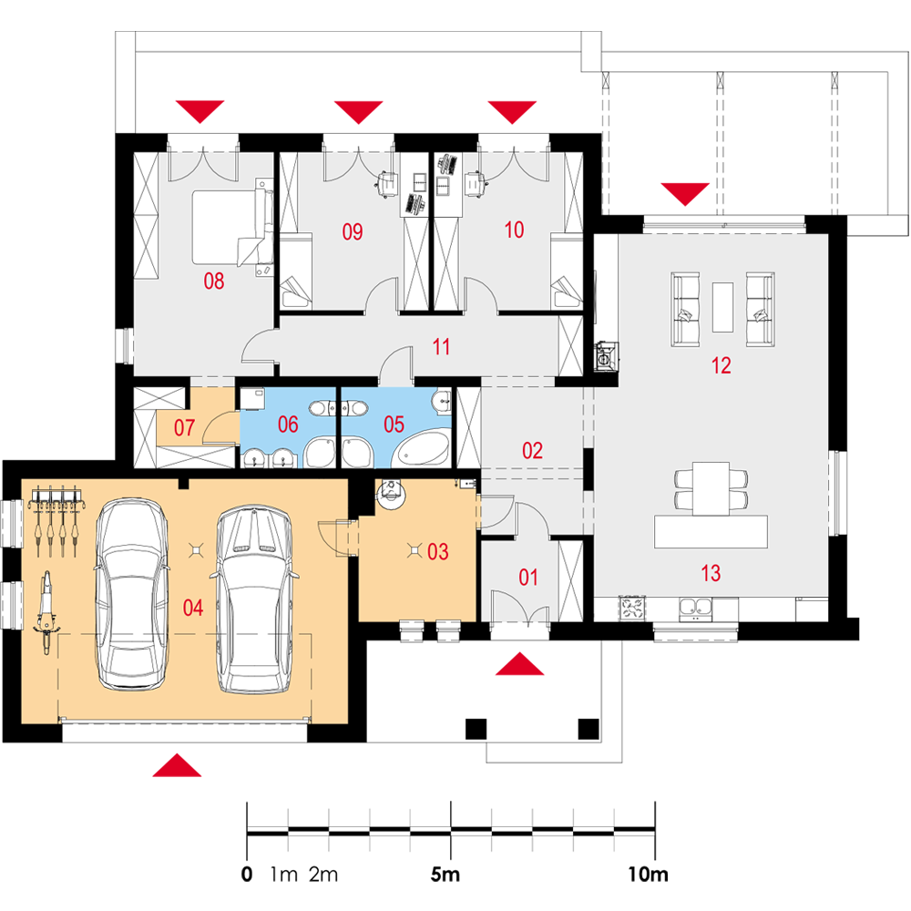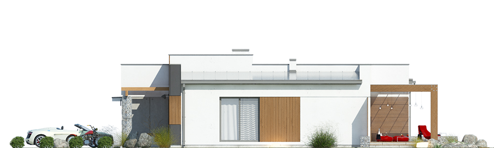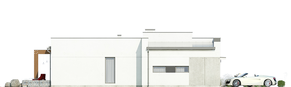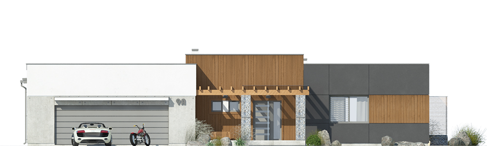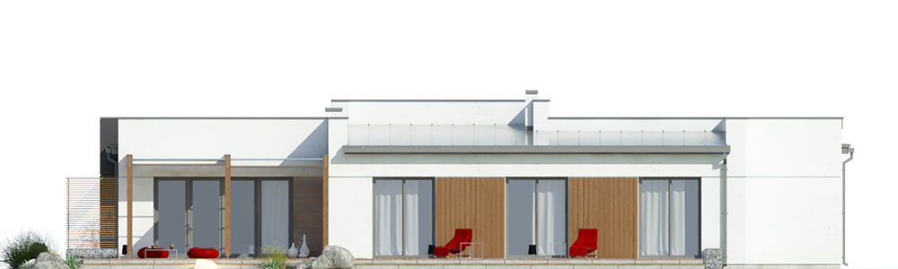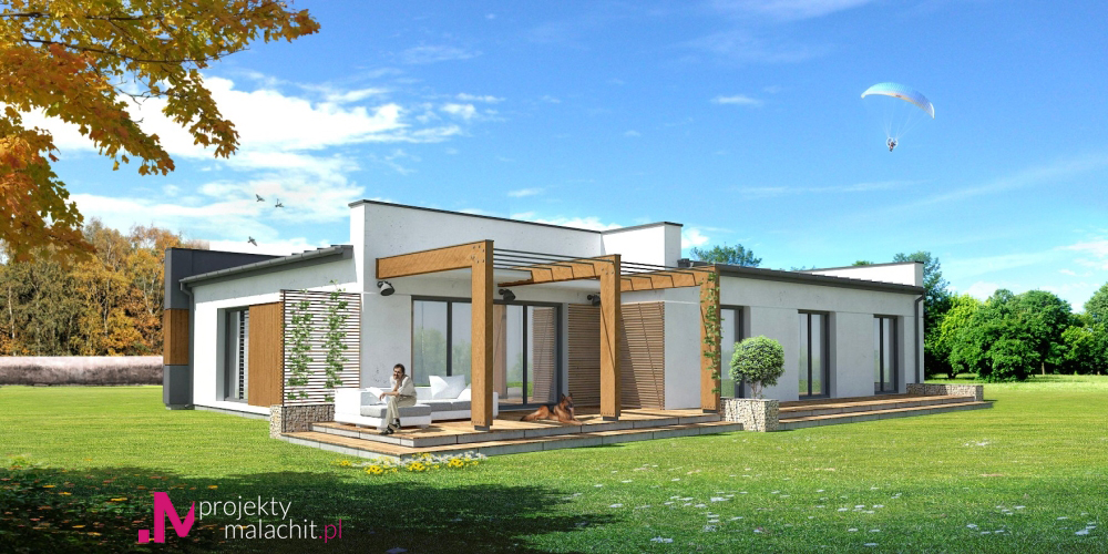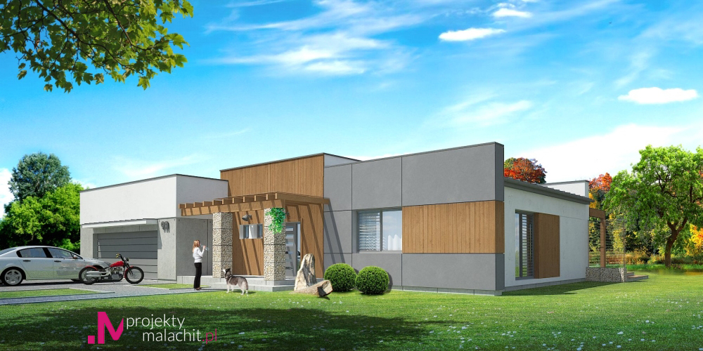 Dom jednorodzinny, wolnostojący, parterowy, z garażem dwustanowiskowym. Na układ funkcjonalny składają się salon z jadalnią i wyjściem na taras, 3 pokoje, garderoba, kuchnia, 2 łazienki, garaż, pomieszczenie gospodarcze.