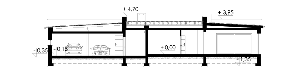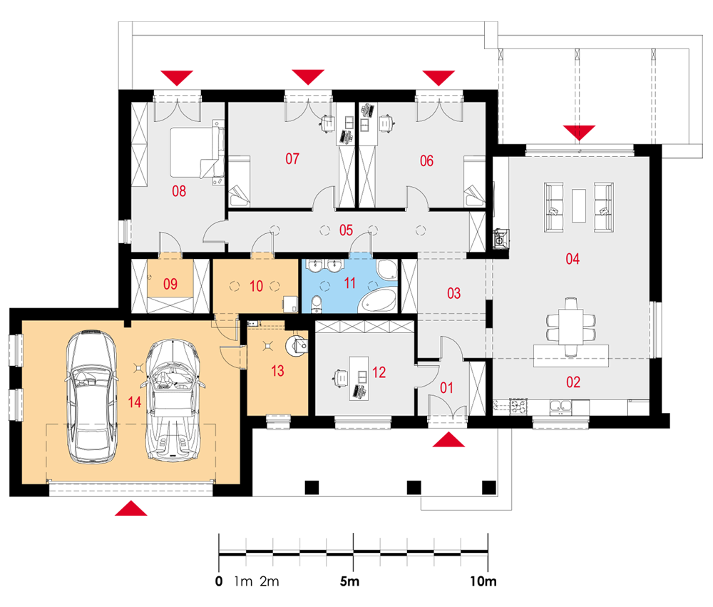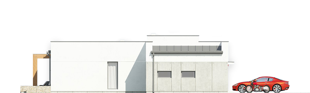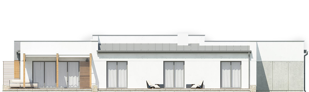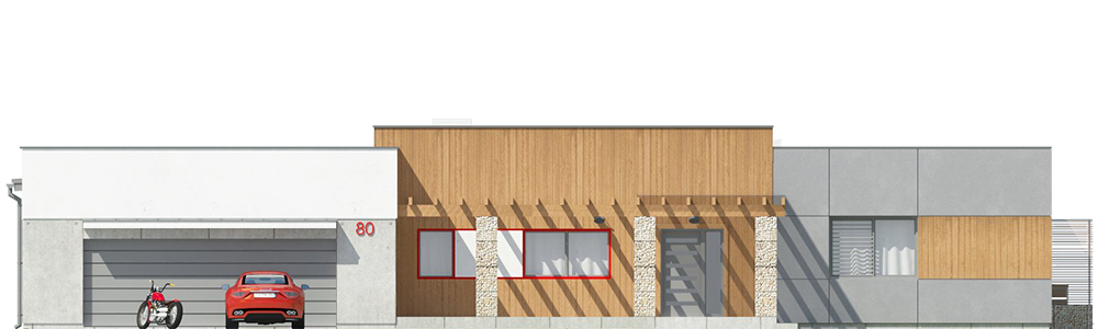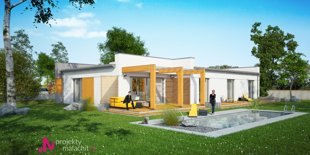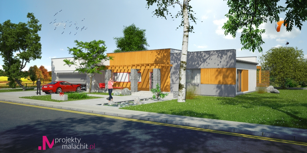 Dom jednorodzinny, wolnostojący, parterowy, z garażem dwustanowiskowym. Na układ funkcjonalny składają się salon z jadalnią i wyjściem na taras, cztery pokoje, garderoba, kuchnia, łazienka, pralnia, garaż, pomieszczenie gospodarcze.