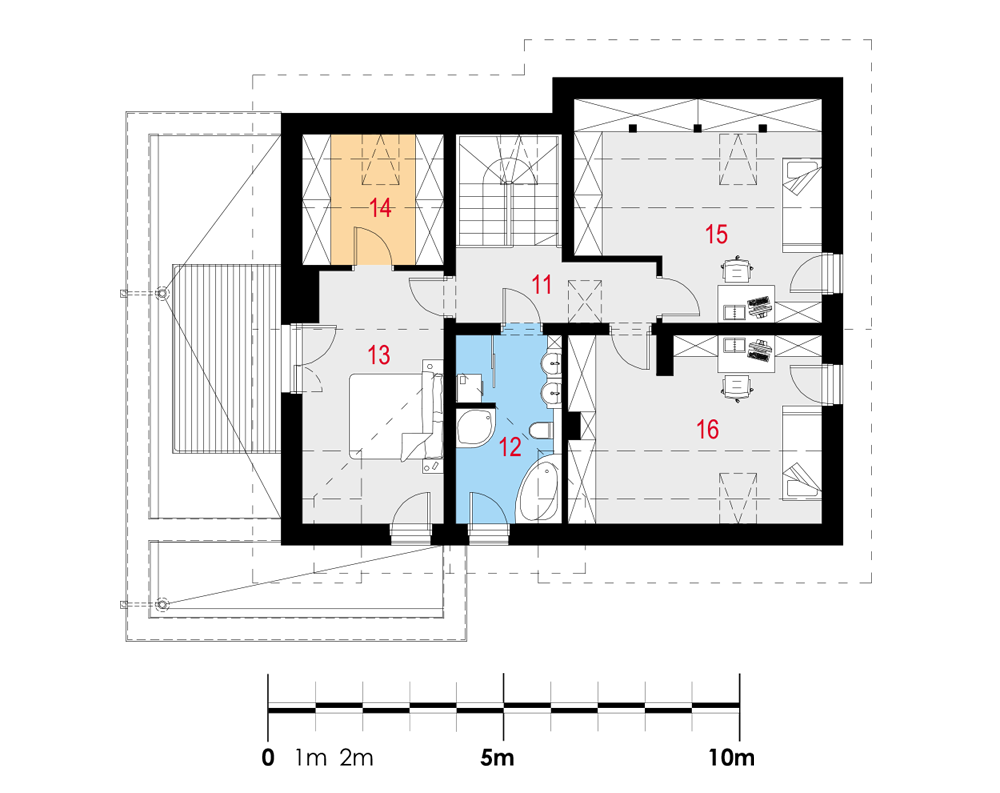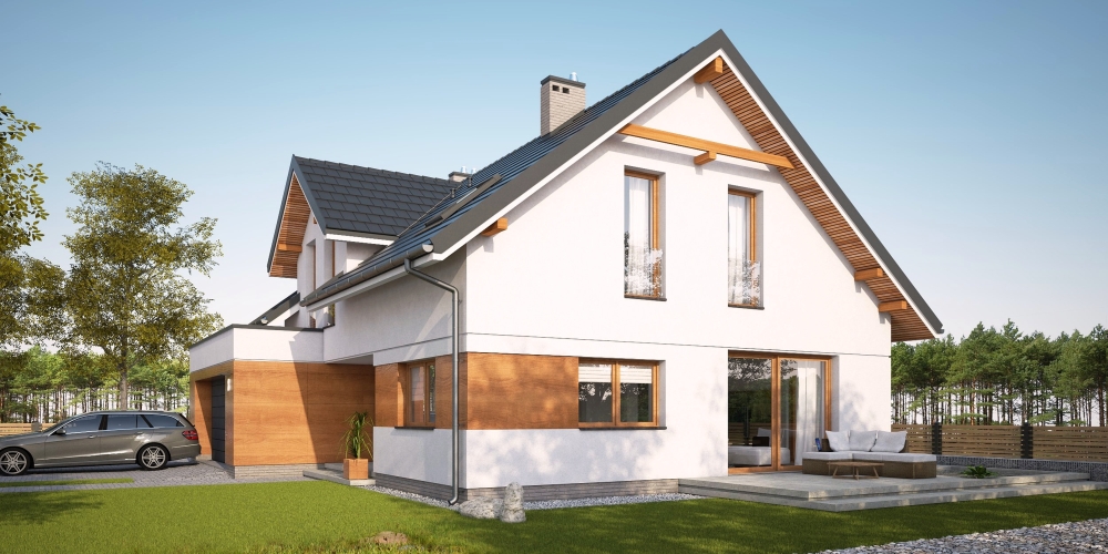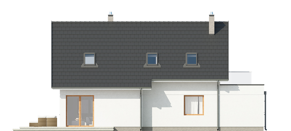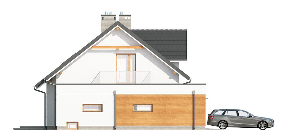 Nowoczesny dom jednorodzinny z dachem dwuspadowym i lukarną, wolnostojący, niepodpiwniczony z poddaszem użytkowym i garażem dwustanowiskowym. Nad częścią gospodarczą obszerny taras dostępny z poddasza. Na układ funkcjonalny składają się pokój dzienny z wyjściem na taras, kuchnia z jadalnią, cztery pokoje, dwie łazienki, garderoba, pomieszczenie gospodarcze, garaż. Z pokoju na poddaszu wyjście na taras nad garażem.