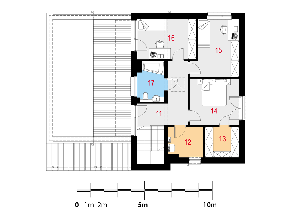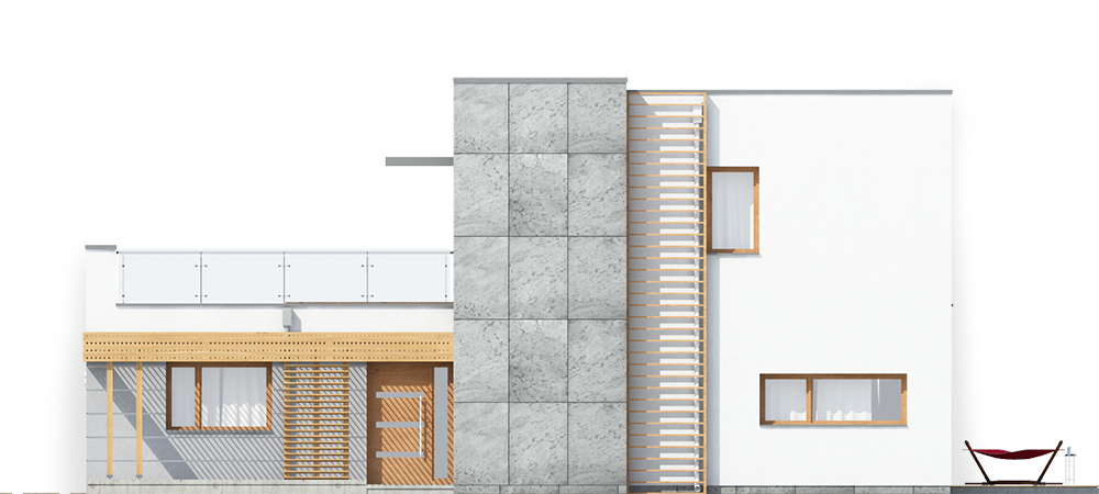 Nowoczesny piętrowy dom jednorodzinny z dachem płaskim, wolnostojący, niepodpiwniczony, dwukondygnacyjny z dużym garażem dwustanowiskowym. Na układ funkcjonalny składają się salon z wyjściem na taras, kuchnia z jadalnią, cztery pokoje, dwie łazienki, garderoba, garaż, dwa pomieszczenia gospodarcze, schowek pod schodami. Na parterze pokój może pełnić funkcję gabinetu usługowego. Nad częścią garażową przestronny taras.