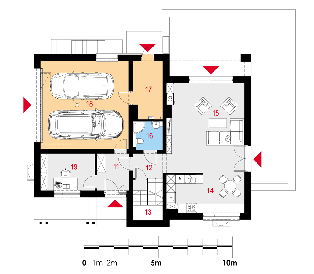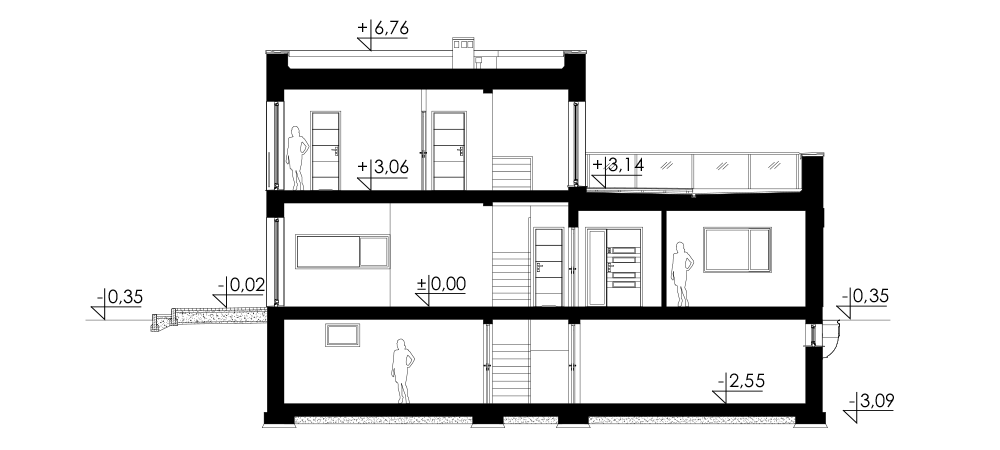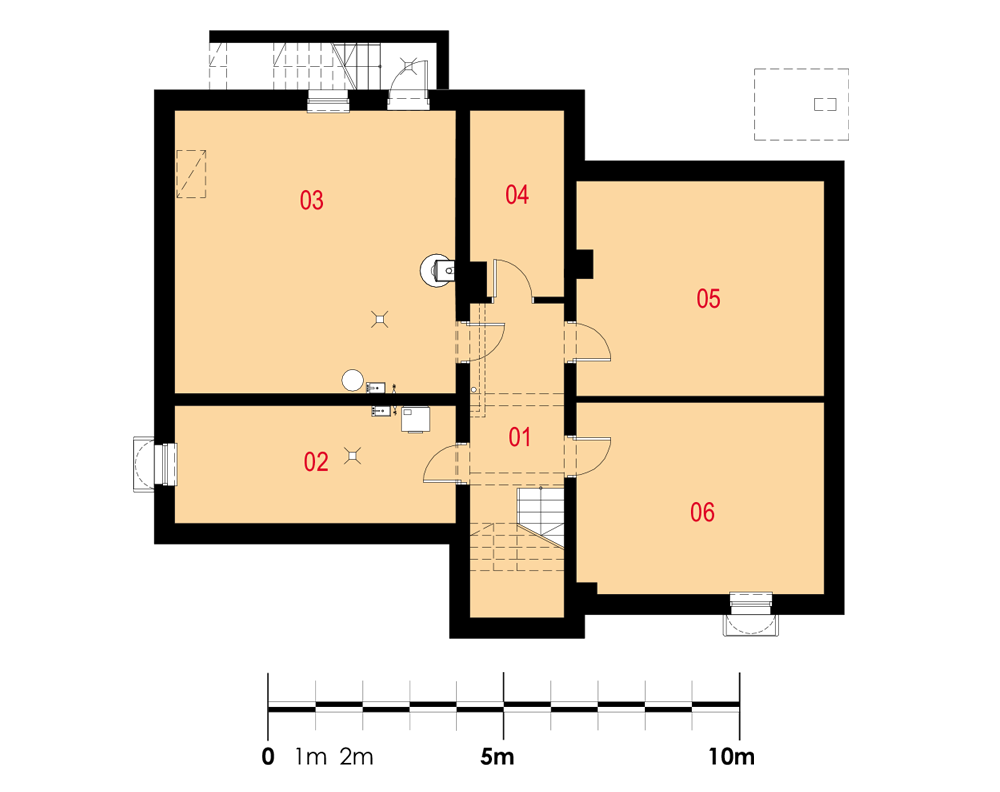 Nowoczesny piętrowy dom jednorodzinny z dachem płaskim, wolnostojący, podpiwniczony, dwukondygnacyjny z dużym garażem dwustanowiskowym. Na układ funkcjonalny składają się salon z wyjściem na taras, kuchnia z jadalnią, cztery pokoje, dwie łazienki, garderoba, garaż, cztery pomieszczenia gospodarcze w piwnicy, jedno na parterze oraz jedno na piętrze. Na parterze pokój może pełnić funkcję gabinetu usługowego. Nad częścią garażową przestronny taras.