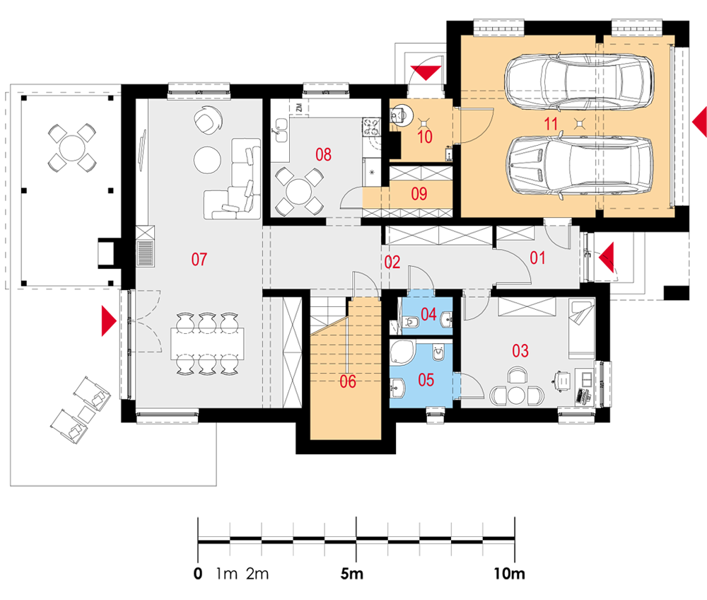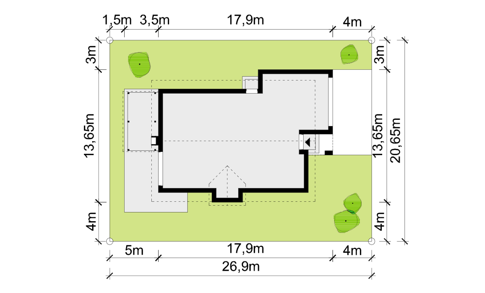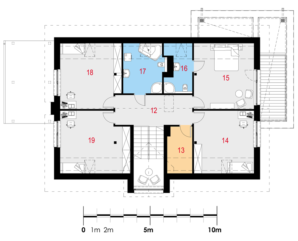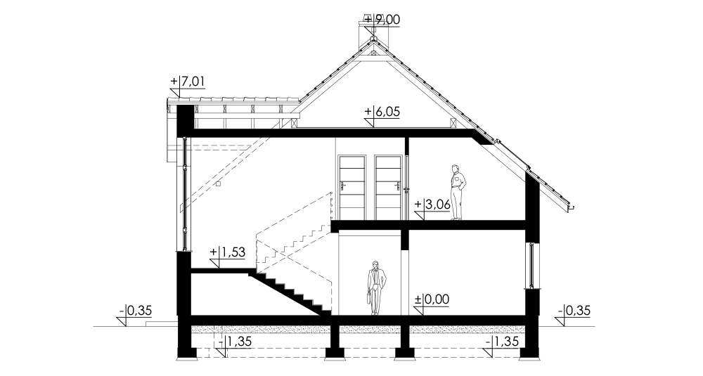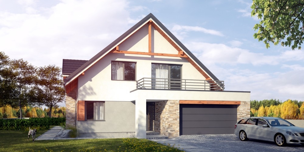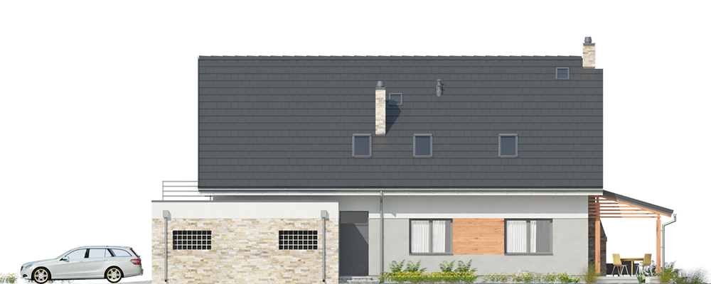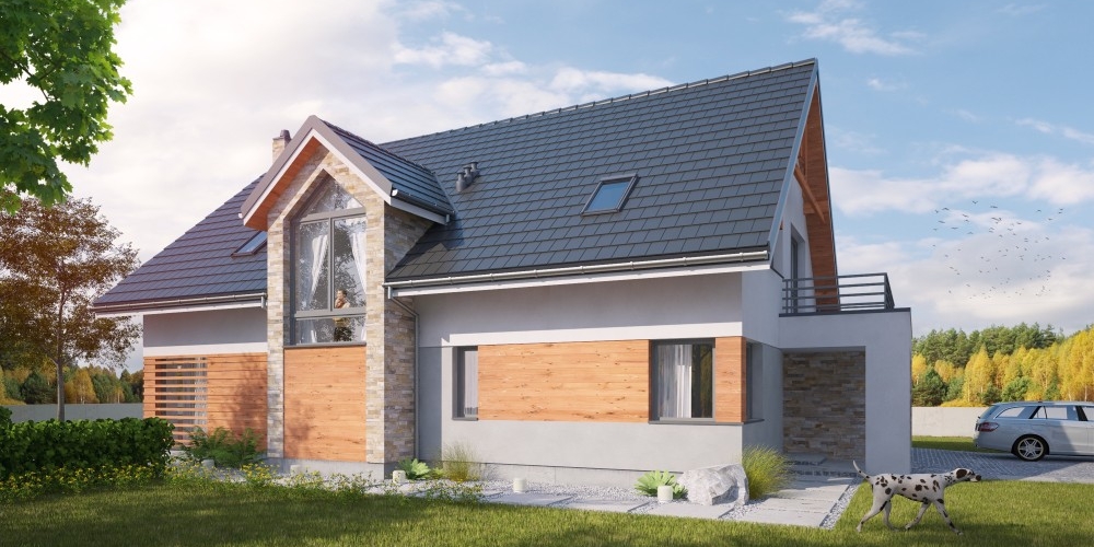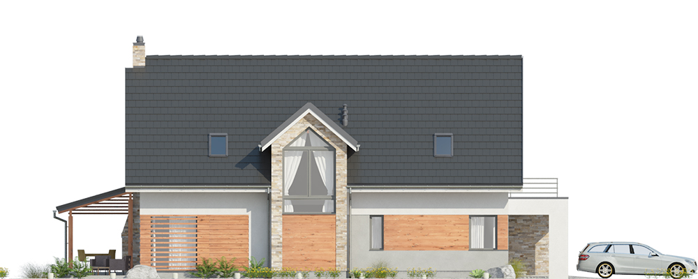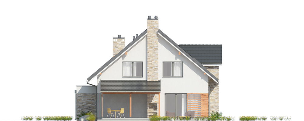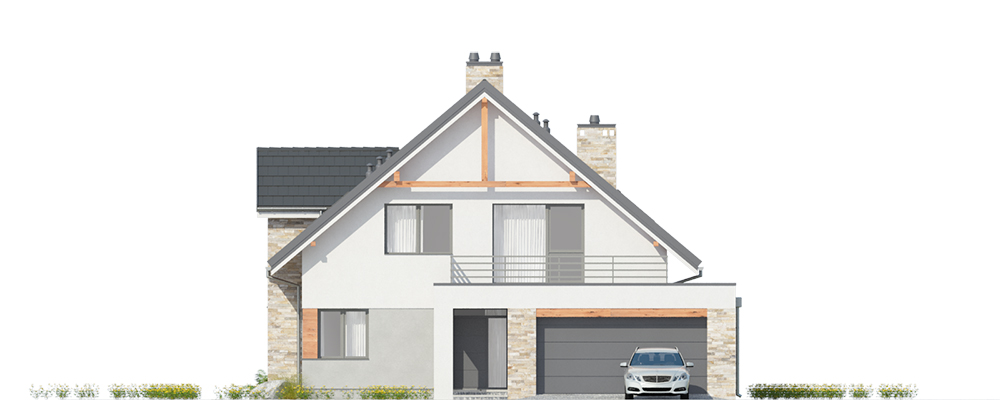 Duży dom jednorodzinny, wolnostojący, niepodpiwniczony z poddaszem użytkowym i garażem na dwa samochody, wysuniętym z bryły budynku o dachu płaskim. Na układ funkcjonalny składają się pokój dzienny z jadalnią i z wyjściem na taras, kuchnia, pięć pokojów, trzy łazienki, WC, garderoba, schowek, spiżarka, garaż, pomieszczenie gospodarcze.