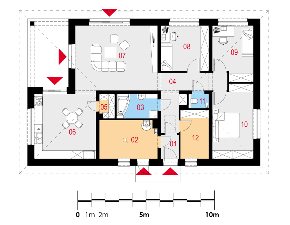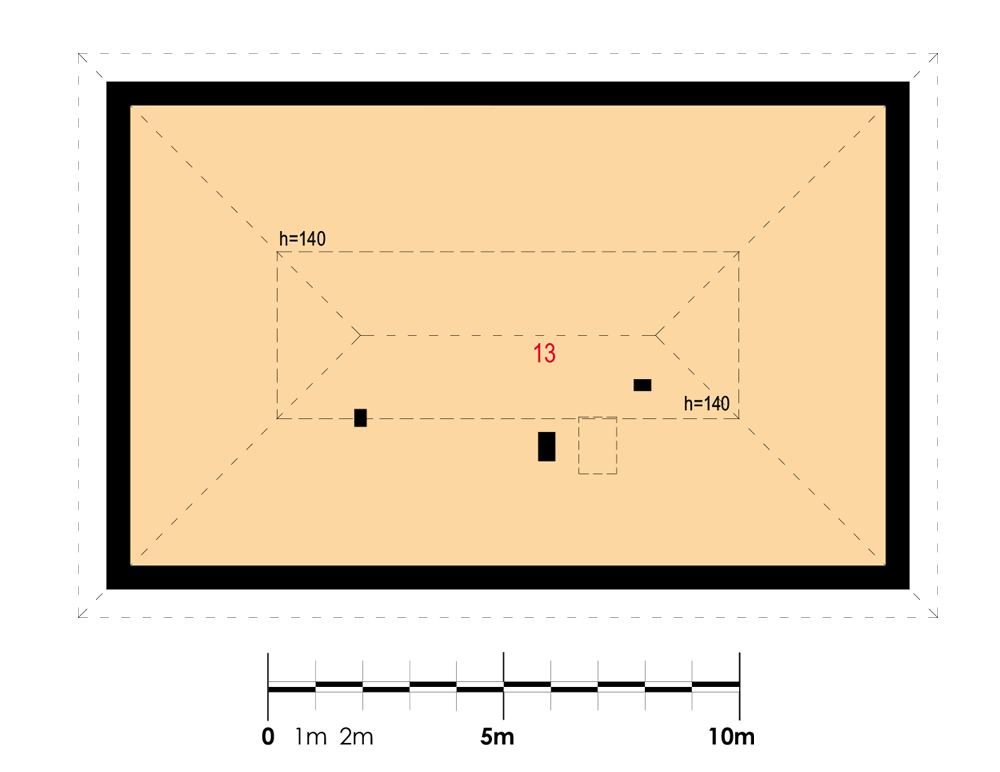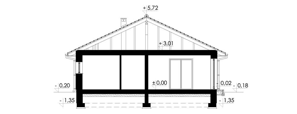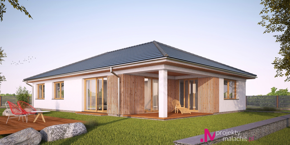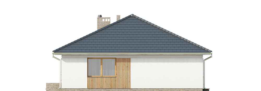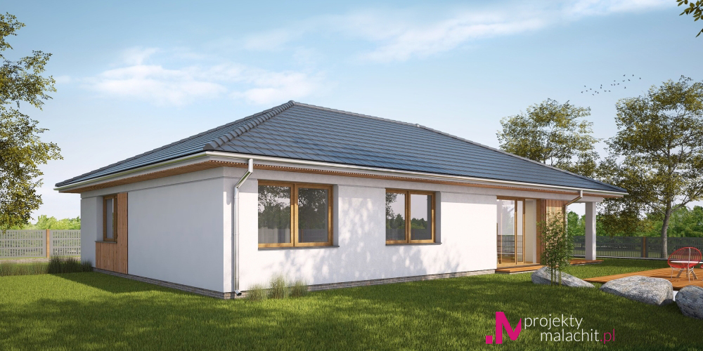 Prosty dom jednorodzinny, wolnostojący, z poddaszem nieużytkowym i dachem czterospadowym-kopertowym. Na układ funkcjonalny składają się pokój dzienny z wyjściem na taras, kuchnia z jadalnią i wyjściem na taras, trzy pokoje, łazienka, WC, garderoba, spiżarnia, pomieszczenie gospodarcze.