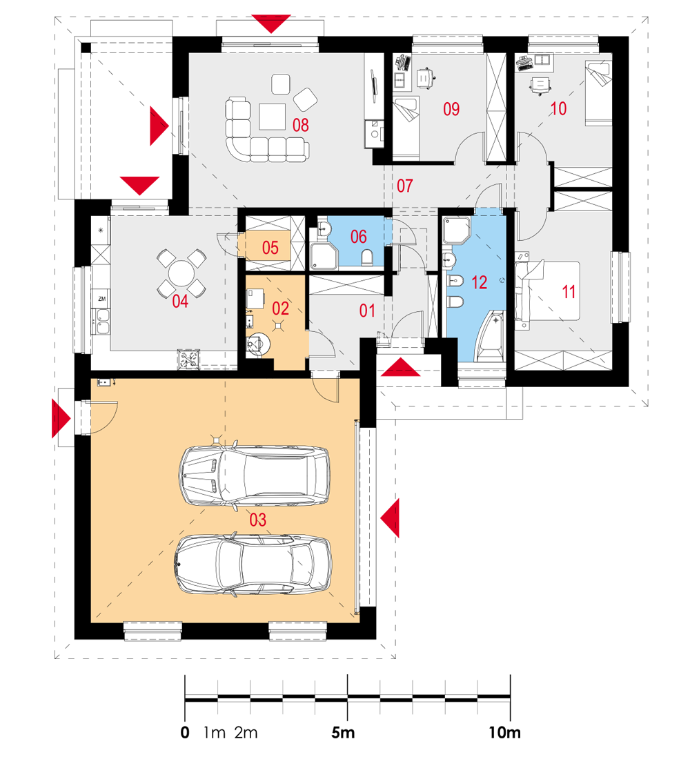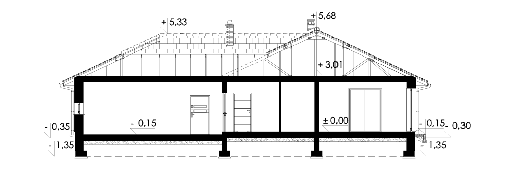 Prosty dom jednorodzinny, wolnostojący, z poddaszem nieużytkowym, dachem czterospadowym-kopertowym i garażem dwustanowiskowym. Na układ funkcjonalny składają się pokój dzienny z wyjściem na taras, kuchnia z jadalnią i wyjściem na taras, trzy pokoje, dwie łazienki, spiżarnia, garaż, pomieszczenie gospodarcze.