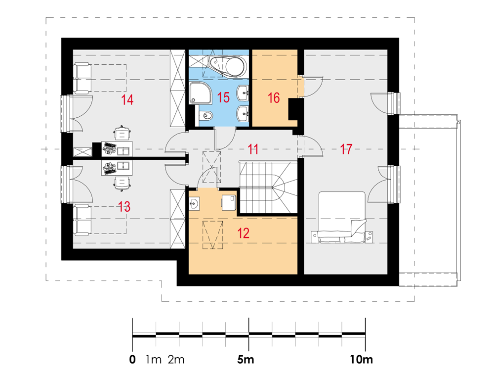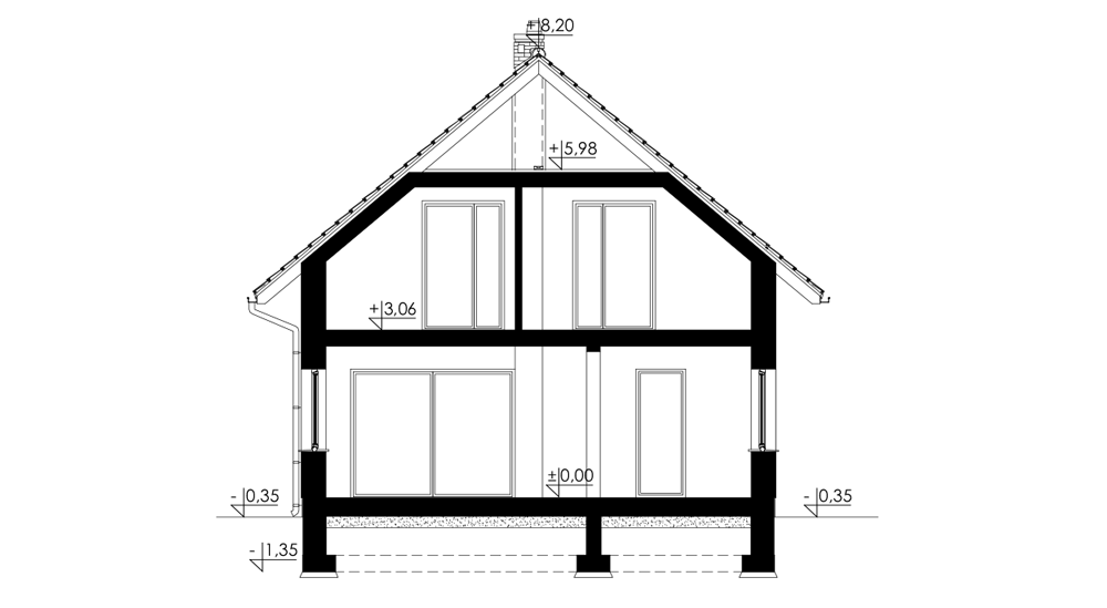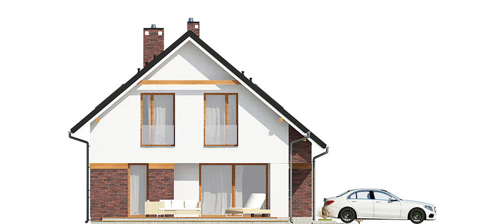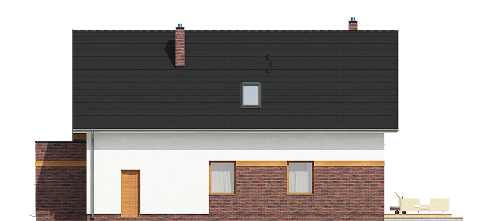 Dom jednorodzinny, wolnostojący, niepodpiwniczony z poddaszem użytkowym i garażem jednostanowiskowym. Na układ funkcjonalny składają się pokój dzienny, kuchnia z jadalnią, cztery pokoje, dwie łazienki, pralnia, garderoba, garaż, pomieszczenie gospodarcze.