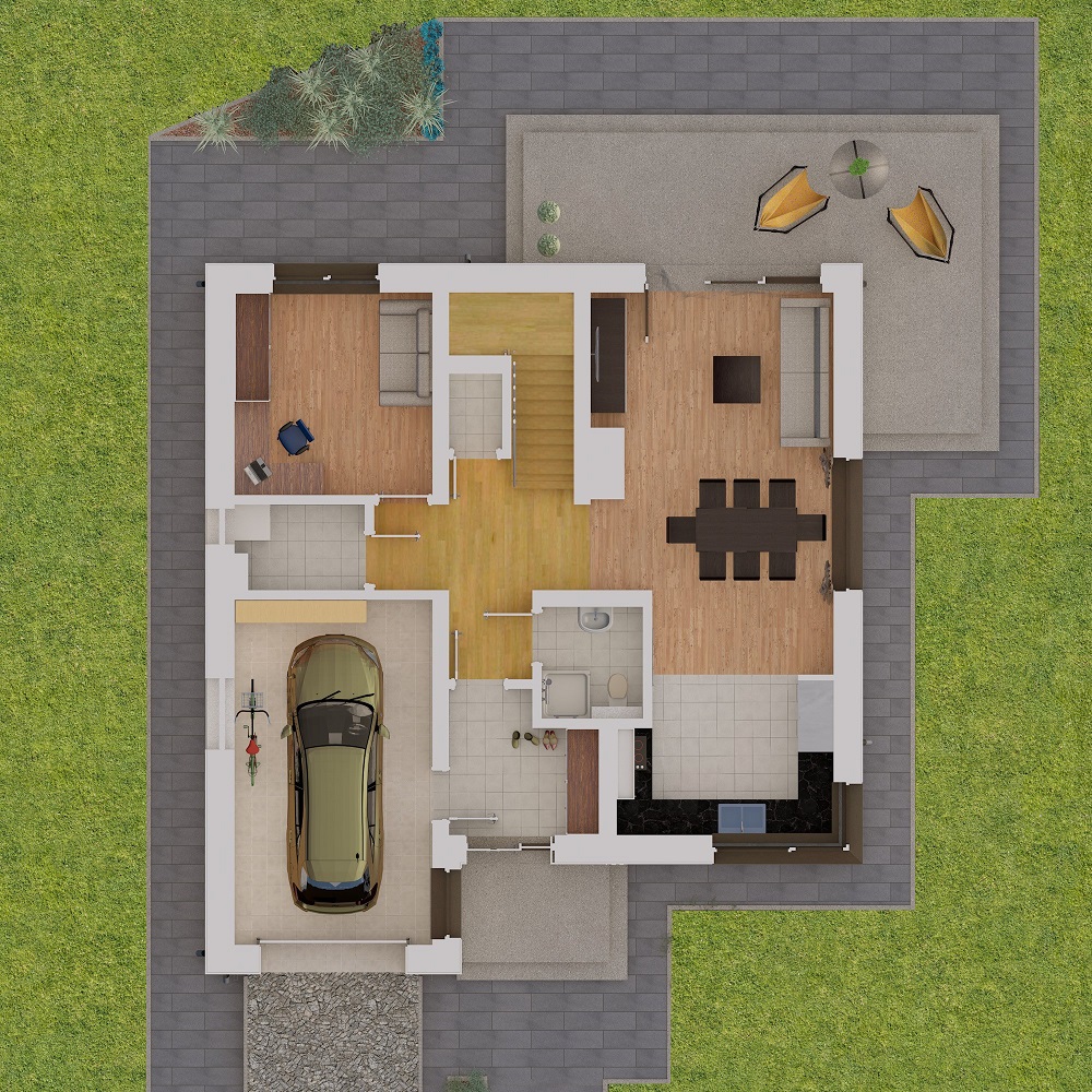 Wnętrze domu KOLORADO zostało zaprojektowane czytelnie i funkcjonalnie. Po wejściu do środka znajdujemy się wiatrołapie mieszczącym szafę ubraniową. Odpowiednio zaaranżowana szafa z pewnością pomieści odzież wierzchnią i obuwie zarówno domowników jak i gości. Po przejściu w głąb domu znajdujemy się w otwartej części dziennej. Składa się na nią kuchnia oraz przestronny salon z jadalnią, które zostały mocno doświetlone przez duże przeszklenia tarasowe.