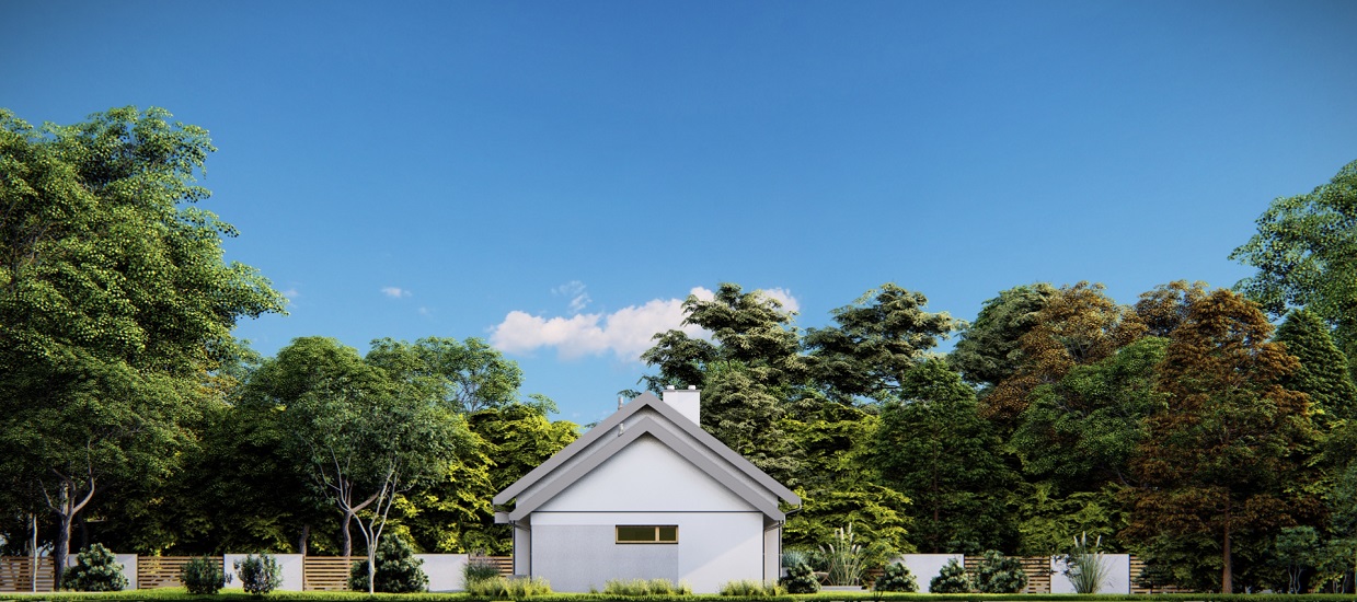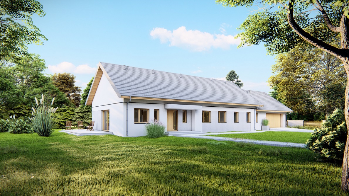 Dom zaplanowano tak, aby zapewnił maksymalny komfort użytkowania ale również był ekonomiczny w budowie, stąd właśnie proponuje się podłużną bryłę przekrytą dwuspadowym dachem, w konstrukcji z prefabrykowanych wiązarów drewnianych. Dzięki temu zabiegowi, dom można wybudować też znacznie szybciej.