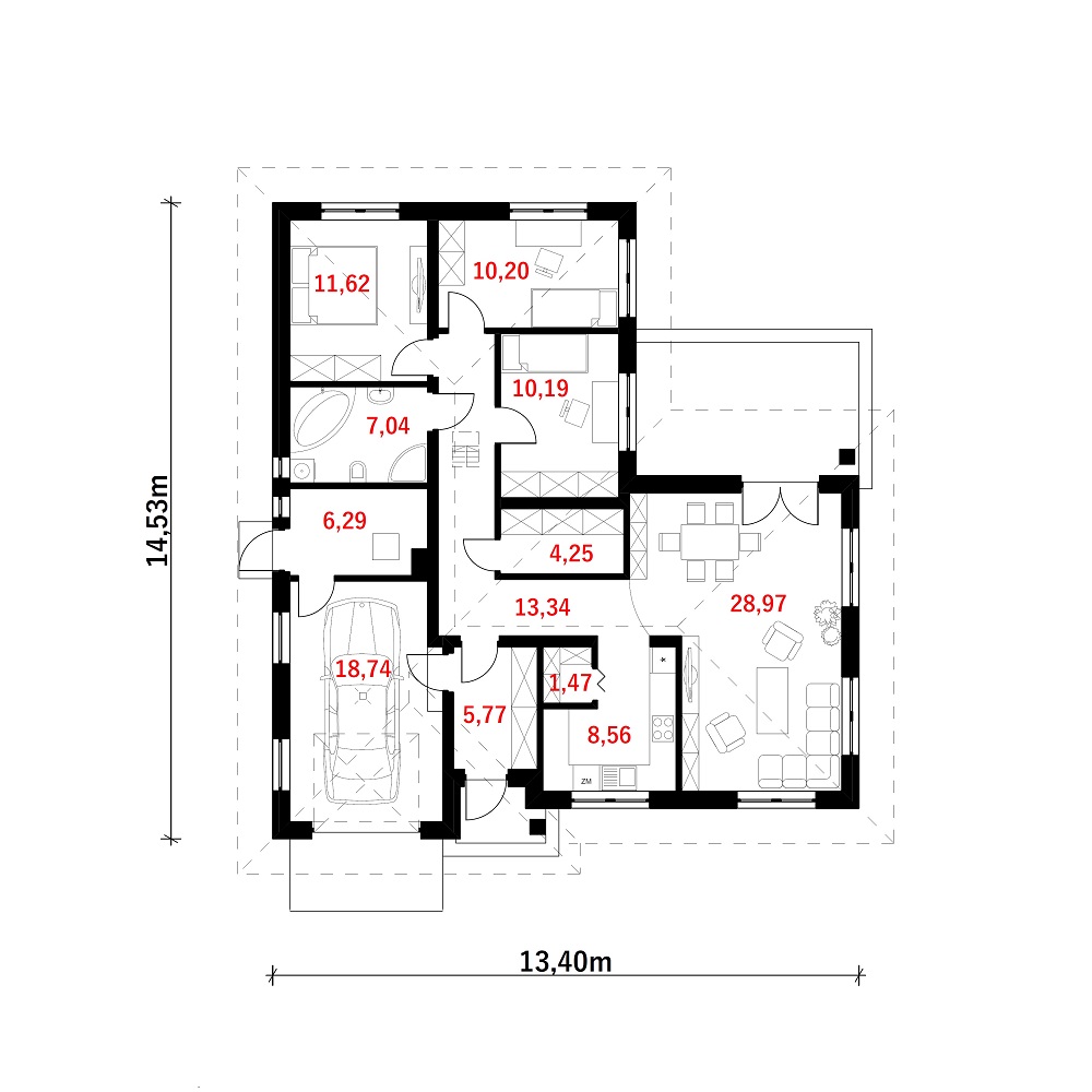 Kreta to przytulny dom parterowy przeznaczony dla 4 osobowej rodziny. Zwarta bryła budynku umożliwia ograniczenie kosztów budowy jak i eksploatacji. Niewątpliwym atutem jest również funkcjonalny układ pomieszczeń domu. W kompaktowej formie znalazły swoje miejsce przestronny salon, kuchnia ze spiżarnią, 3 pokoje oraz wygodna łazienka. Część gospodarczą domu stanowi obszerna garderoba, wbudowany garaż jednostanowiskowy, przez który domownicy mają dostęp do kotłowni. W domu tym znaleźć można wszystko co potrzebne na co dzień do ekonomicznego wygodnego i życia.