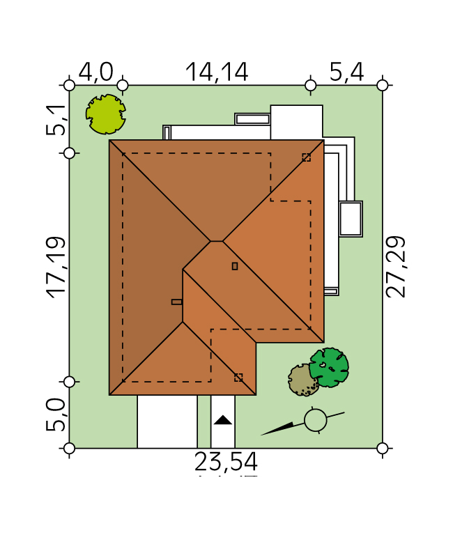 Dach: wielospadowy, nachylenie 25°, pokrycie z dachówki ceramicznej