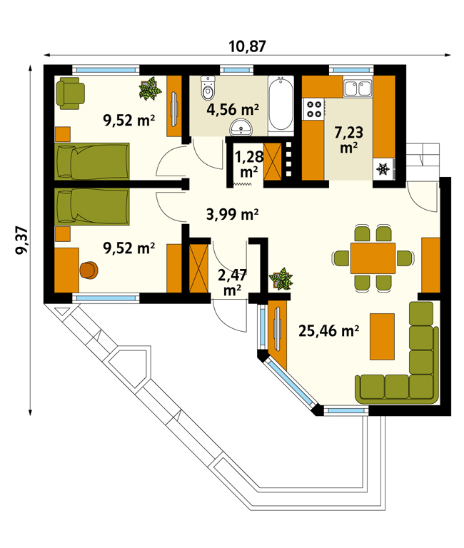 Mały dom jednorodzinny z zagospodarowanym poddaszem, przeznaczony dla 2 – 3-osobowej rodziny. Pomimo swojej niewielkiej powierzchni daje wiele możliwości aranżacji wnętrza. Na parterze zaprojektowano salon z wydzieloną jadalnią, kuchnię, łazienkę i dwie sypialnie. Pomieszczenia na poddaszu mogą zostać zaaranżowane w dowolny sposób według preferencji i potrzeb. Przestronny zadaszony taras jest dużym atutem projektu.