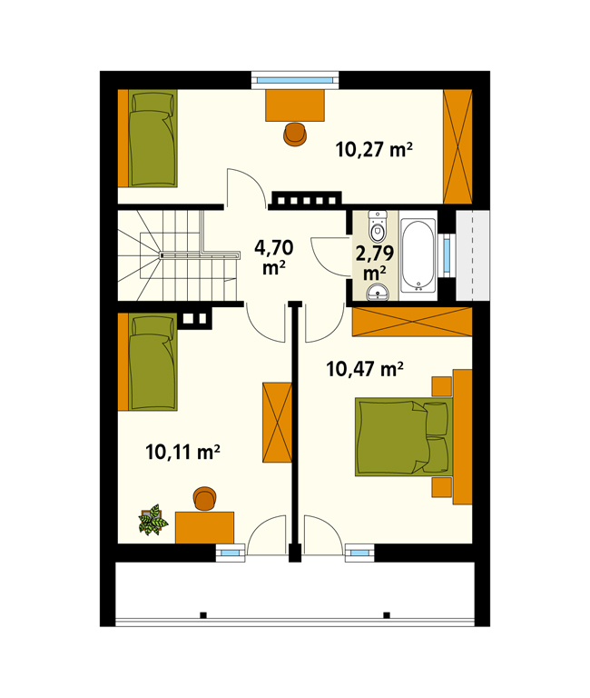 Propozycja dla osób, które pragną cieszyć się urokami mieszkania we własnym domu. Niewielki, ale funkcjonalny dom z ciekawą bryłą, który sprosta potrzebom 4-osobowej rodziny. Warto zwrócić uwagę na duży zadaszony taras, praktyczne pomieszczenie gospodarcze usytuowane tuż przy wiatrołapie, duży balkon dostępny z obu sypialni oraz kominek w salonie. To dom tani w budowie i ekonomiczny w utrzymaniu.
