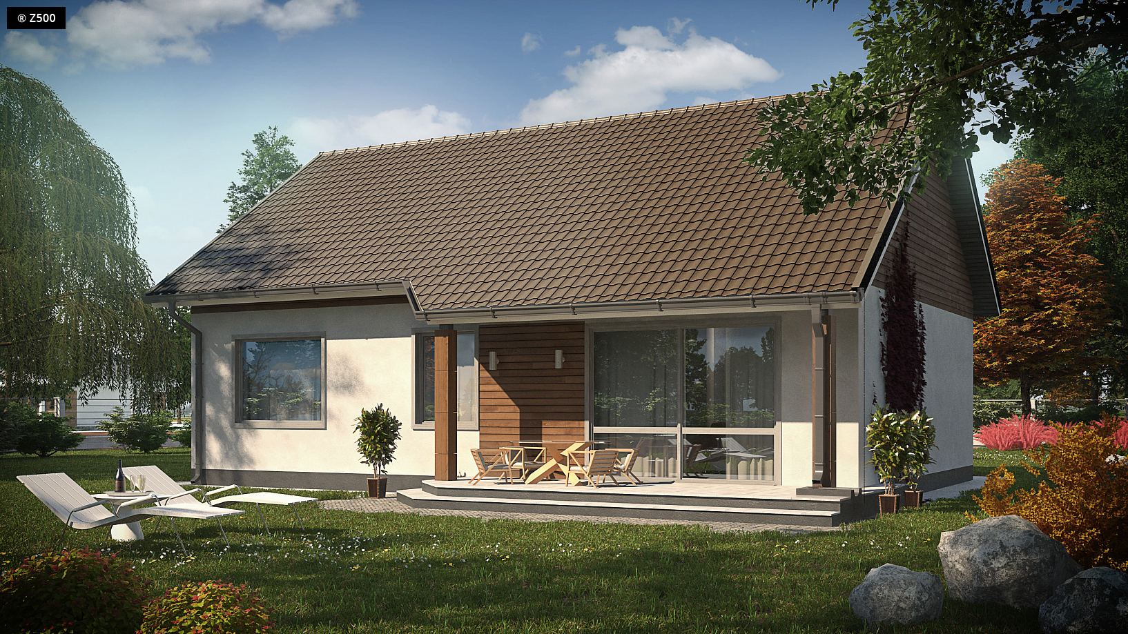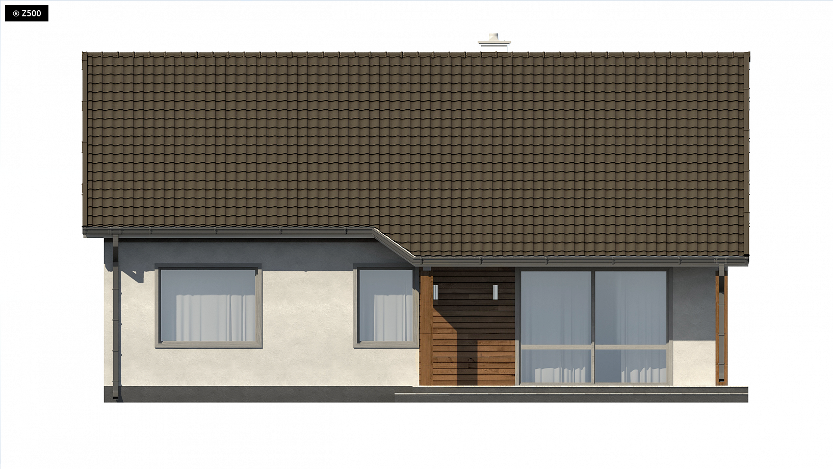 Projekt Z7 jest niewielkim i tanim w realizacji domem parterowym z dachem dwuspadowym. Prosta współczesna bryła, pozwoli na szybką i ekonomiczną budowę. Wzbogacenie elewacji drewnianymi elementami doda mu dodatkowego uroku, a tym samym wzbogaci walory estetyczne.Na parter wchodzimy poprzez zadaszone wejście, prosto do sieni, skąd dalej wchodzimy do holu. Stanowi on ciąg komunikacyjny pomiędzy poszczególnymi pomieszczeniami. Parter możemy podzielić na dwie strefy, dzienną i sypialną. W jednej znajdują się trzy sypialnie oraz spora łazienka, natomiast w drugiej salon połączony z jadalnią i kuchnią oraz pomieszczenie gospodarcze. Z salonu mamy wyjście na zadaszony taras, który może być miłym miejscem na spędzenie wieczoru. Przeszklone duże drzwi zapewnią widok na ogród, a tym samym jedność z otoczeniem zewnętrznym.Dom spodoba się wszystkim tym którzy szukają niewielkiego, funkcjonalnego domku parterowego, który mimo swych niewielkich rozmiarów posiada wiele miejsca na przestronne szafy i zaspokaja wszystkie niezbędne potrzeby.