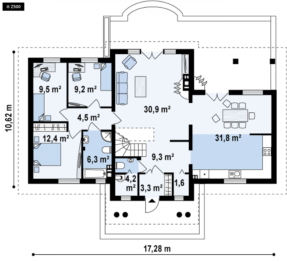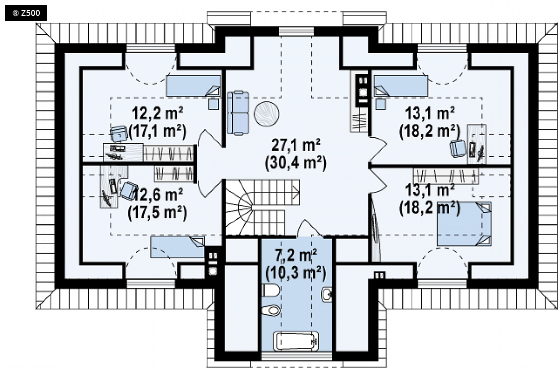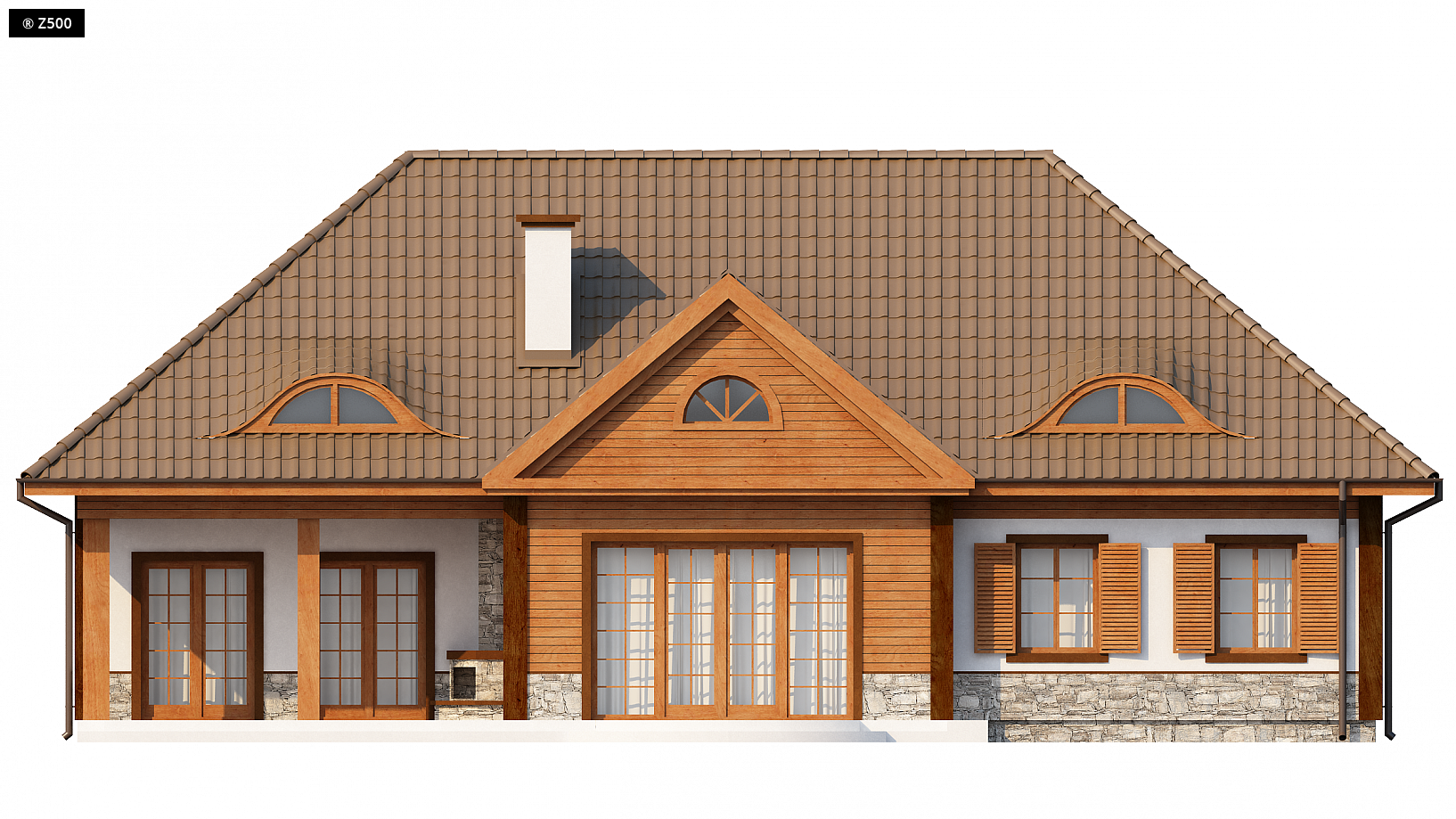 Z20 to projekt domu z komfortowo rozplanowanym poddaszem, stylizowany na wzór dworku ziemiańskiego. Doskonale wkomponuje się w krajobraz podmiejski.Założenie domu oparte jest na pionowej osi z centralnie zlokalizowanym wejściem, schodami i strefą reprezentacyjną salonu.Kuchnia połączona z jadalnią posiada wyjście na zadaszony taras. Obok kuchni przewidziano spiżarnię. Istnieje możliwość powiększenia jadalni lub wykonania „ogrodu zimowego” przez zabudowę podcienia . W lewym skrzydle domu wydzielono strefę nocną: trzy wygodne sypialnie oraz sporą łazienkę. Poddasze można zagospodarować w drugim etapie inwestycji. Możliwość aranżacji wnętrza jest dowolna. Można tu urządzić przestrzenne studio, miejsce do pracy lub wygospodarować dodatkowe 4 pokoje z łazienką.Foremna bryła, drewniane elementy wykończenia elewacji oraz okiennice to propozycja dla wielbicieli klasyki. Charakter budynku dopełniają subtelne okna typu "wole oczko".