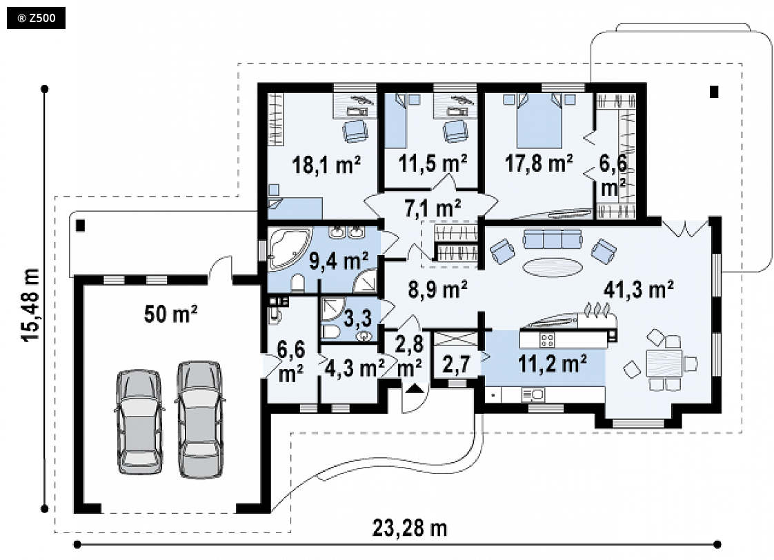 Projekt Z21 to kompleksowy dom, zawierający w swoim wnętrzu prawie wszystko, czego można oczekiwać od klasycznego domu parterowego. Bryła na planie prostokąta, z połączonym, wspólnym dachem,garażem na 2 auta wykończona została dzięki subtelnym detalom jak: dobrana kolorystyka, delikatne poziome bonie czy wykusz od frontu. Na większej działce dom prezentuje się jak gustowna rezydencja.Wnętrze dzieli się na strefy: dzienną, nocną i gospodarczą. Z głównego holu dostępna jest odizolowana część nocna domu z trzema fajnymi sypialniami i łazienką. Dodatkowo 'master bedroom' posiada własną pokaźną garderobę. Część dzienna to olbrzymi salon z kominkiem w jadalni i wyjściem na taras, połączony z częściowo otwartą kuchnią, która posiada spiżarkę. Można zrezygnować z wydzielenia kuchni wtedy uzyskujemy 52m2 otwartej przestrzeni. Taras jest w większej części solidnie zadaszony i może stanowić przedłużenie salonu czy letnią jadalnię. Istnieje możliwość zabudowy podcienia celem powiększenia powierzchni wypoczynkowej wewnątrz.Zaplecze gospodarcze domu to pomieszczenie techniczne z piecem oraz garaż dwustanowiskowy z wyjściem na ogród. W projekcie przewidziano także miejsce na szafy wnękowe oraz garderobę. Dużą łazienkę można podzielić na dwie mniejsze tak, aby jedna z nich dostępna była z pokoju. W miarę potrzeb, w kolejnym etapie inwestycji, istniej możliwość zagospodarowania strychu.