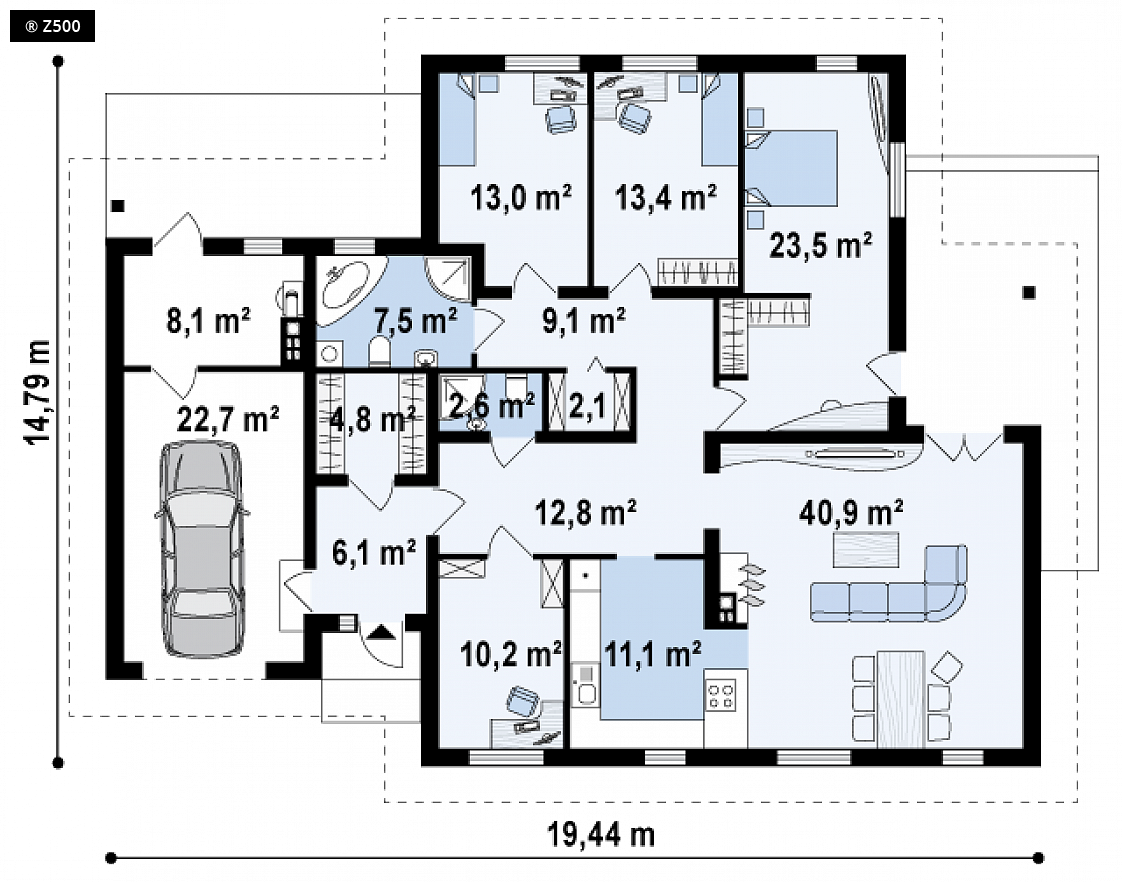 Projekt Z22 jest domem parterowym z bocznym garażem. Wykończenie elewacji impregnowanym drewnem oraz elementami kamiennymi nadają budynkowi indywidualny charakter.Wnętrze wyraźnie podzielono na dwie strefy. Z głównego holu dostępna jest część dzienna z kuchnią, korytarz prowadzący do części nocnej, pokój, mała toaleta oraz schowek- spiżarka. Pokój gościnny można przeznaczyć na domowe biuro z bezpośrednim wejściem przez sień. Część dzienną tworzy salon z aneksem kominkowym i jadalnią oraz wyjściem na taras. Kuchnia w zależności od preferencji użytkowników może być zamknięta lub otwarta. Z sieni możliwe jest przejście do garażu i garderoby. Garaż przewiduje także dodatkową powierzchnię na pomieszczenie gospodarcze lub magazynek z wyjściem na ogród. Z22 to projekt funkcjonalnego domu parterowego. Spodoba się wszystkim tym, którzy cenią sobie komfort użytkowania pomieszczeń na jednym poziomie.