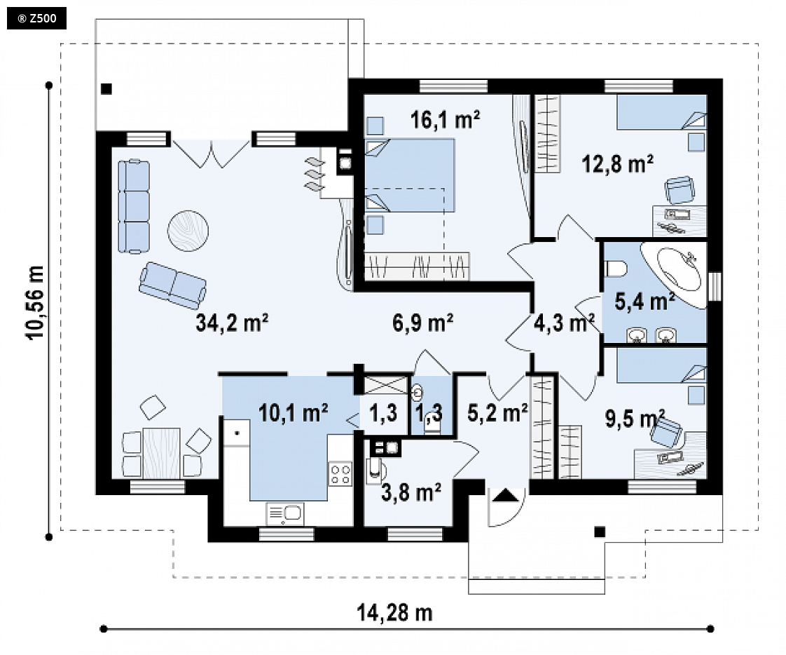 Projekt Z23 to tani w budowie oraz ekonomiczny w eksploatacji dom. Szybkość w budowie zapewnia wiązarowa konstrukcja dachu stanowiąca jednocześnie przykrycie pomieszczeń na parterze (strop drewniany nieużytkowy). Projekt oparty jest na założeniu domu parterowego o stosunkowo prostej bryle, a zarazem atrakcyjnej architektonicznie formie.Od frontu, bryłę budynku urozmaica ciekawy podcień wejściowy, natomiast od strony ogrodu zaprojektowano podcień częściowo osłaniający taras przed deszczem. Ciekawym rozwiązaniem tego projektu jest wykończenie elewacji elementami z klinkieru lub kamienia łamanego (opcja).Przestrzeń we wnętrzu została podzielona na dwie części: „dzienną” - w postaci salonu z jadalnią z wyjściem na taras i kuchnię ze spiżarką, oraz na część „nocna” – składającą się z trzech sypialni, gdzie jedna z nich ew. może być gabinetem. Optymalny rozkład pomieszczeń przewiduje także miejsca na szafy wnękowe.