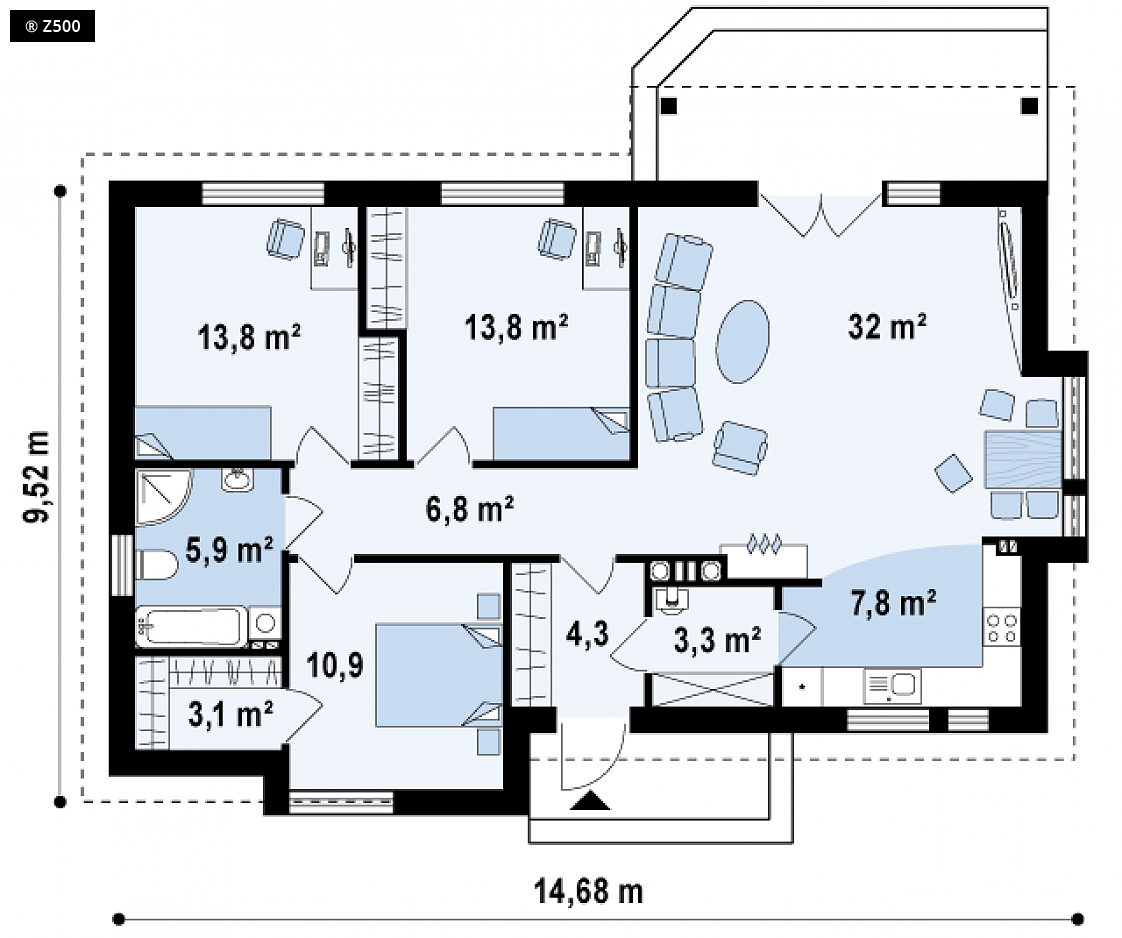 Z93 to zgrabny, funkcjonalny dom parterowy dla 4-osobowej rodziny. Prostą bryłę z dwuspadowym dachem urozmaicają dwa wykusze - jeden w kuchni, drugi w głównej sypialni. Okładziny z ciemnego drewna na elewacjach, szara stolarka oraz ciekawe detale architektoniczne nadają nowoczesny wygląd. Nad wejściem zaprojektowano ażurową formę w lekkiej stalowej konstrukcji. Bogaty program użytkowy rozwiązano na poziomie parteru. Strefa dzienna to przestronny salon z aneksem telewizyjnym i wyjściem na zadaszony taras. Kuchnię zaprojektowano w kompozycji otwartej z możliwością całkowitego oddzielenia od salonu. Z sieni można dostać się do kuchni przez pomieszczenie gospodarcze, omijając salon. Może ono także pełnić funkcję spiżarni. Jadalnia została zlokalizowana w wykuszu z dużym oknem. Strefę nocną wydzielono w lewym skrzydle domu. Składają się na nią 3 komfortowe sypialnie oraz wygodna łazienka z oknem i miejscem na pralkę. Główna sypialnia posiada własna garderobę.
