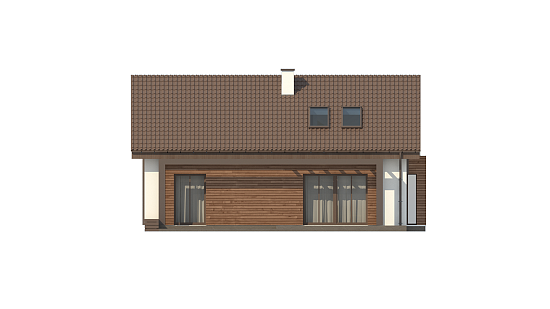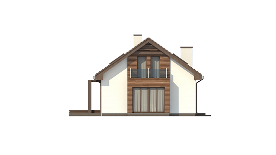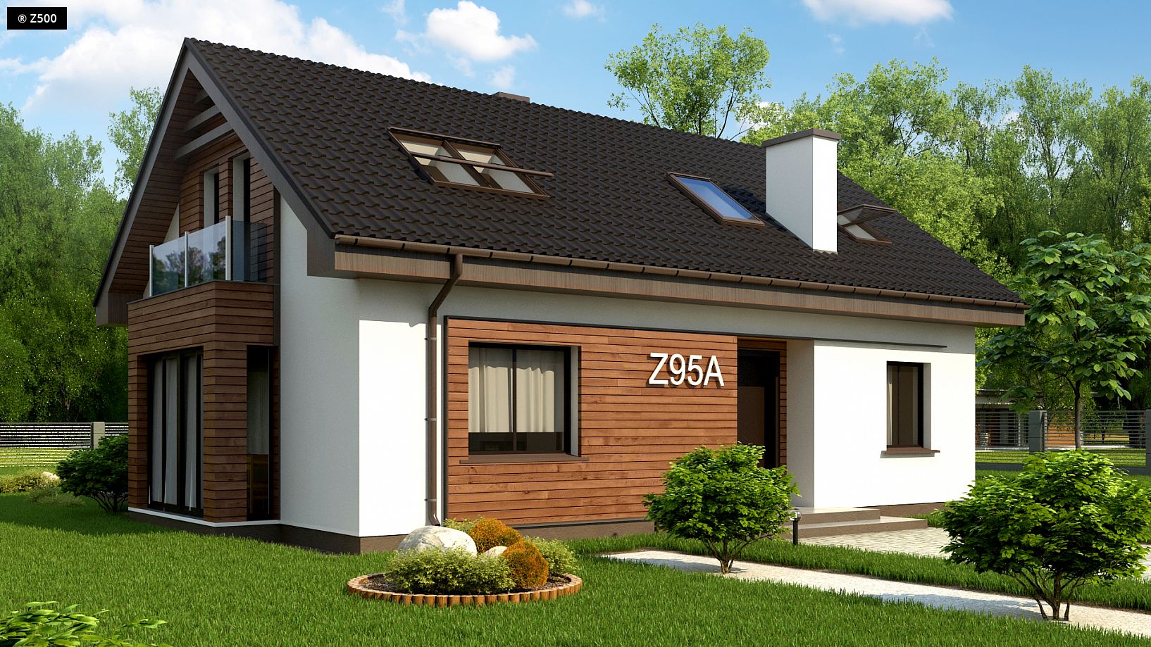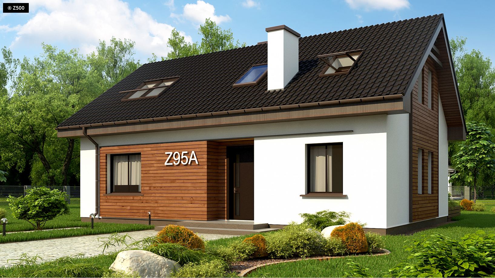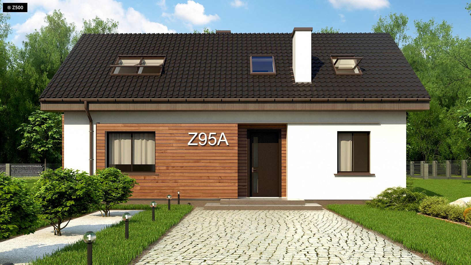 Z95 A to projekt domu o powierzchni użytkowej niecałych 110 m2. Prosty dach dwuspadowy bez dodatkowego zadaszenia nad wejściem jak w wersji podstawowej, jest niedrogi w budowie. Wejście zostało delikatnie cofnięte i osłonięte aby deszcz nie przeszkadzał nam w poszukiwaniu kluczy. Elewacja jest prosta i surowa. Została wykończona jasnym kolorem, w większości użyto białego tynku, jasnego drewna i ciemnych obramowań. Taras od strony ogrodu zadaszono pergolą z ciemnego drewna, prowadzą na niego wyjścia z salonu i z gabinetu. W parterze znajduje się sień a z niej przejście do dużego pomieszczenia gospodarczego z piecem na paliwo stałe. Można tam okno zamienić na drzwi, dzięki czemu uzyskamy wyjście na zewnątrz. Z pomieszczeniem gospodarczym sąsiaduje łazienka z miejscem przeznaczonym na pralkę. Doświetlono ją oknem aby było widniej. Ustawny gabinet zaprojektowano na płaszczyźnie zbliżonej do kwadratu aby wielbiciele przemeblowań mieli pole do popisu… Wyjście na taras stanowi dodatkowy atut. Pod schodami znajduje się schowek z przeznaczeniem na środki czystości, odkurzacz, szczotki czy choinkę. Lewa część domu to strefa dzienna - z przestronną kuchnią i bogato doposażoną spiżarką. Wydzielona część jadalna w wykuszu celowo została umiejscowiona oddzielnie aby podkreślić odrębność jadalni. Kominek umieszczony centralnie, więc będzie cieszył nasze oczy z każdego miejsca w salonie. Duże przeszklenia z wyjściem na taras podkreślają okazałość pomieszczenia. Poddasze użytkowe składa się z trzech sypialni. Jedna z nich posiada prywatną łazienkę i garderobę. Pozostałe dwie mogą być pokojami dla dzieci. Z każdego z pokoi prowadzi wyjście na niewielki balkon umiejscowiony nad wykuszem. Wnętrza doświetlono oknami dachowymi oraz oknami szczytowymi. Projekt dedykowany jest dla osób lubiących tradycyjny ale prosty i nowoczesny styl.