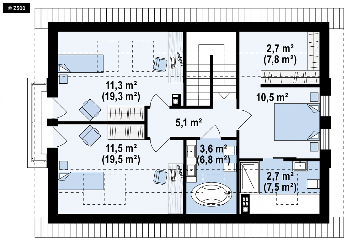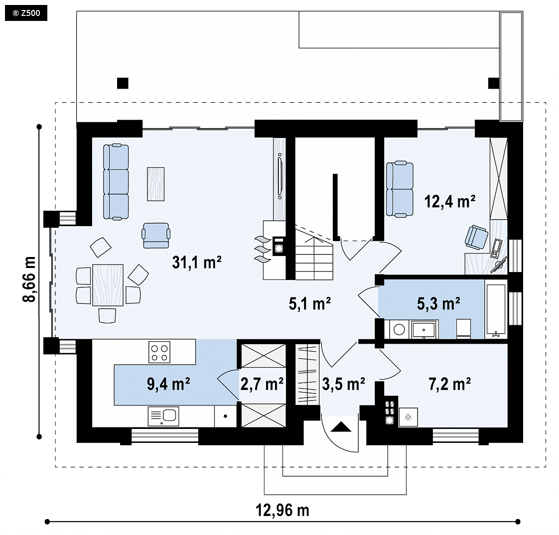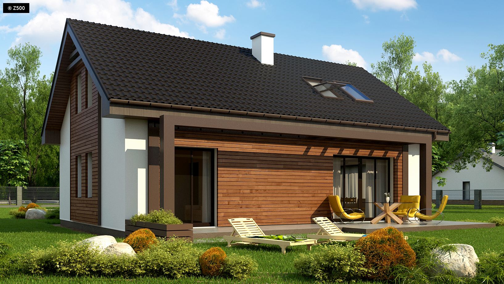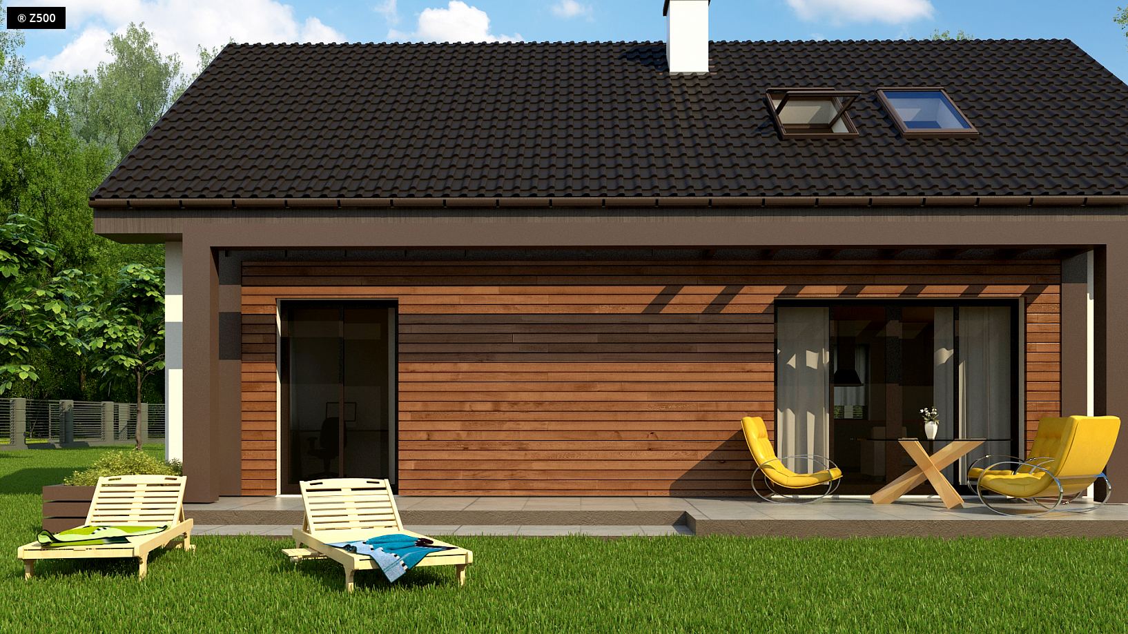 Z95 A to projekt domu o powierzchni użytkowej niecałych 110 m2. Prosty dach dwuspadowy bez dodatkowego zadaszenia nad wejściem jak w wersji podstawowej, jest niedrogi w budowie. Wejście zostało delikatnie cofnięte i osłonięte aby deszcz nie przeszkadzał nam w poszukiwaniu kluczy. Elewacja jest prosta i surowa. Została wykończona jasnym kolorem, w większości użyto białego tynku, jasnego drewna i ciemnych obramowań. Taras od strony ogrodu zadaszono pergolą z ciemnego drewna, prowadzą na niego wyjścia z salonu i z gabinetu. W parterze znajduje się sień a z niej przejście do dużego pomieszczenia gospodarczego z piecem na paliwo stałe. Można tam okno zamienić na drzwi, dzięki czemu uzyskamy wyjście na zewnątrz. Z pomieszczeniem gospodarczym sąsiaduje łazienka z miejscem przeznaczonym na pralkę. Doświetlono ją oknem aby było widniej. Ustawny gabinet zaprojektowano na płaszczyźnie zbliżonej do kwadratu aby wielbiciele przemeblowań mieli pole do popisu… Wyjście na taras stanowi dodatkowy atut. Pod schodami znajduje się schowek z przeznaczeniem na środki czystości, odkurzacz, szczotki czy choinkę. Lewa część domu to strefa dzienna - z przestronną kuchnią i bogato doposażoną spiżarką. Wydzielona część jadalna w wykuszu celowo została umiejscowiona oddzielnie aby podkreślić odrębność jadalni. Kominek umieszczony centralnie, więc będzie cieszył nasze oczy z każdego miejsca w salonie. Duże przeszklenia z wyjściem na taras podkreślają okazałość pomieszczenia. Poddasze użytkowe składa się z trzech sypialni. Jedna z nich posiada prywatną łazienkę i garderobę. Pozostałe dwie mogą być pokojami dla dzieci. Z każdego z pokoi prowadzi wyjście na niewielki balkon umiejscowiony nad wykuszem. Wnętrza doświetlono oknami dachowymi oraz oknami szczytowymi. Projekt dedykowany jest dla osób lubiących tradycyjny ale prosty i nowoczesny styl.