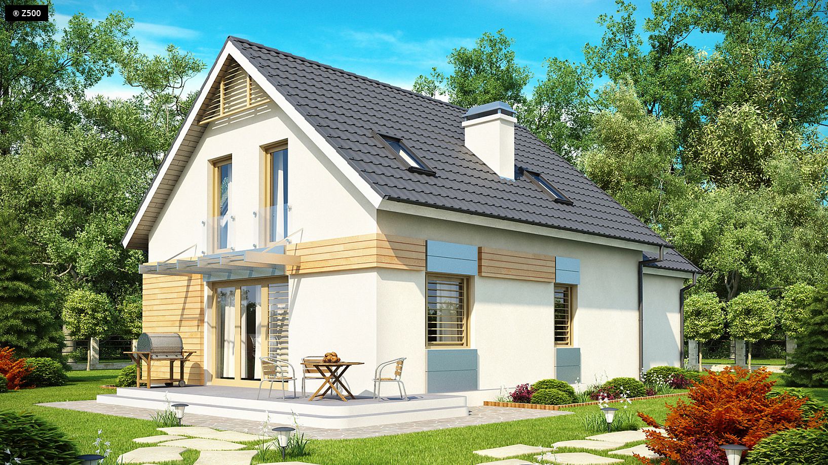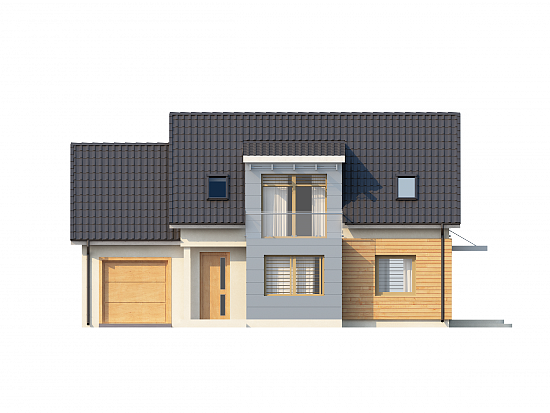 Z126 to zgrabny dom jednorodzinny z poddaszem użytkowym oraz bocznym garażem, zaprojektowany dla 5,6-osobowej rodziny. Elewacje utrzymane w jasnej, stonowanej kolorystyce wraz z nowoczesnymi elementami wykończenia nadają mu nowoczesnego wyglądu. Wyjątkowy charakter podkreśla ciekawy wykusz wykończony szarą blachą. W wysuniętej przed front części zaplanowano przestronną kuchnię z oknem skierowanym na strefę wejściową. Otwarta część dzienna z kominkiem łączy salon, jadalnię. Dla większego komfortu kuchnię można całkowicie wydzielić. Z salonu prowadzi wyjście na duży, zadaszony taras. Na parterze znalazły również miejsce: pomieszczenie gospodarcze, kotłownia, spore wc z prysznicem. Do części nocnej na poddaszu prowadzą wygodne schody ze spocznikiem. Zaprojektowano tu cztery komfortowe pokoje oraz ogólnodostępną łazienkę. Sypialnia nad garażem posiada własną pojemną garderobę. Do głównej sypialni przynależy niewielki taras nad wykuszem.