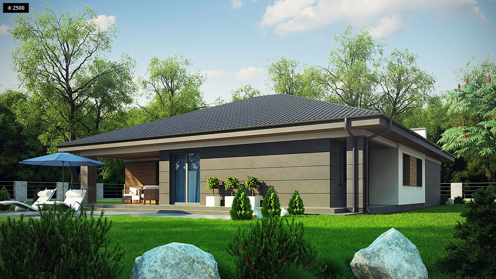 Z379 to tradycyjny dom parterowy z dachem wielospadowym o powierzchni do 140 m2 urzekający połączeniem nowoczesności i klasyczności. Zaprojektowano go na planie kostki z wysuniętym garażem jednostanowiskowym oraz z pomieszczeniem gospodarczym. Jasna kolorystyka elewacji, beżowy tynk z poziomym boniowaniem i jasne drewno przemawia nawet do najbardziej wymagających osób. Dom znakomicie doświetlono z każdej strony aby jego pomieszczenia były widne i radosne. Zaletą garażu jest to, iż z łatwością można zrobić z niego garaż 2 stanowiskowy przenosząc pomieszczenie gospodarcze w miejsce garderoby i łazienki sypialni master bedroom. Budynek podzielono na 2 oddzielne części. Z prawej - dzienna - salon z jadalnią, zaś od frontu aneks z wyspą kuchenną oraz praktyczną spiżarką. W salonie połączonym z gustowną jadalnią centralnie umieszczono kominek w celu podtrzymania ciepła domowego ogniska. Znajduje się tam również wyjście na zadaszony taras – centrum naszego letniego relaksu i wypoczynku. Z lewej - nocna - 4 pokoje, z czego jeden z prywatną garderobą i łazienką. Pokoje możemy przeznaczyć jako sypialnie dla dzieci, gabinet do pracy lub inne potrzebne pomieszczenie. Aranżacja zależy od indywidualnych potrzeb i pomysłów właścicieli. Projekt Z379 przeznaczony jest dla rodziny z dwojgiem lub trojgiem dzieci.