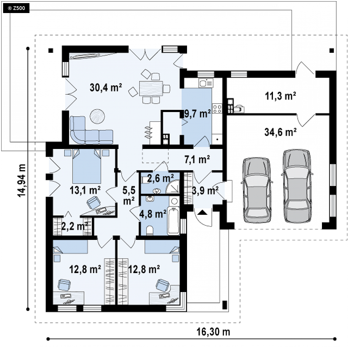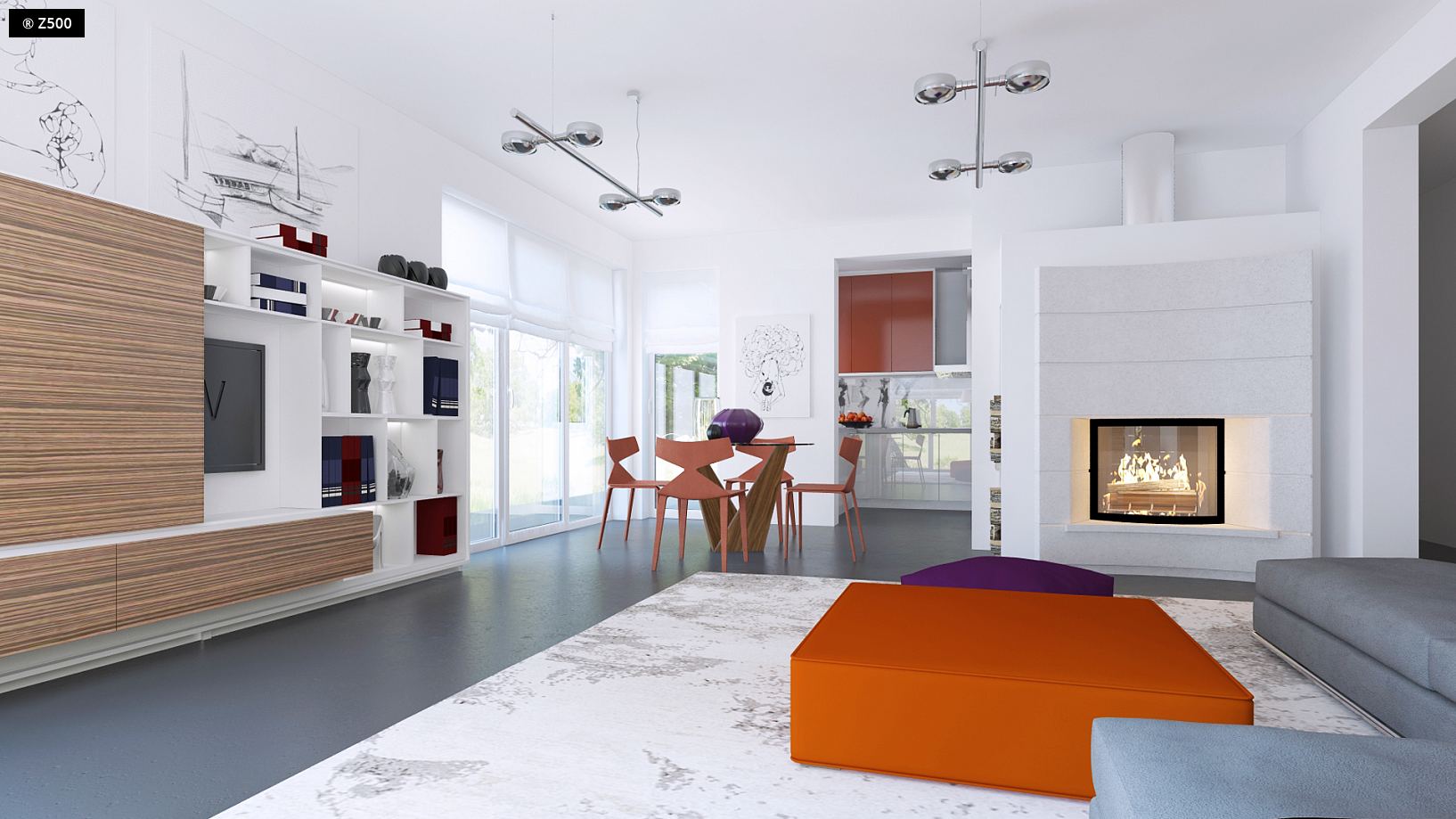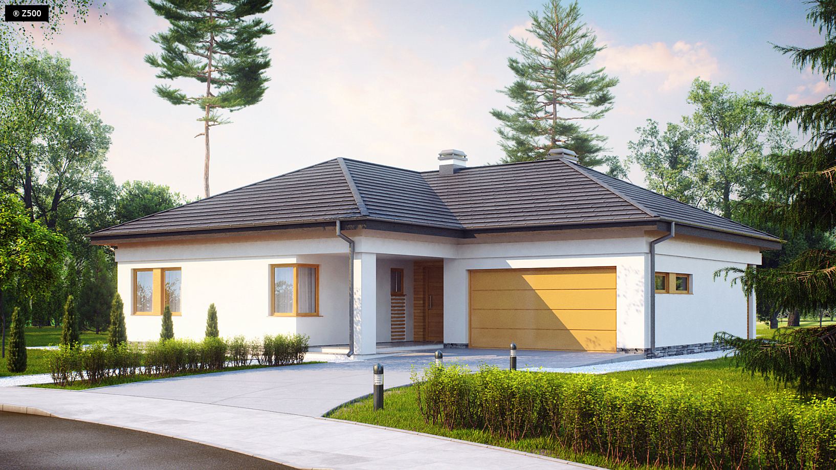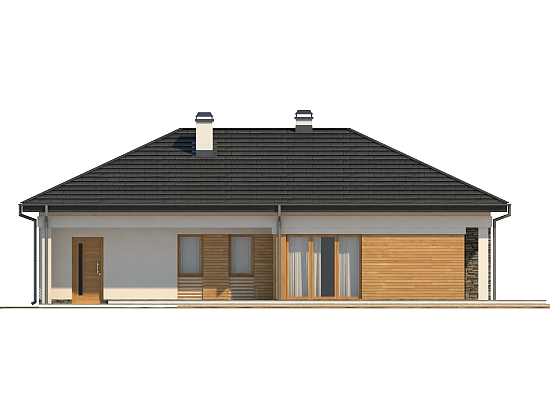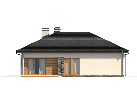 Projekt Z204 to funkcjonalny dom o programie użytkowym rozwiązanym w obrębie parteru. Prostą bryłę urozmaicono wysuwając lewe skrzydło przed front. Okładziny z drewna i kamienia na elewacjach nadają mu nowoczesny charakter. Atutem jest dwustanowiskowy garaż oraz obszerne pomieszczenie gospodarcze dostępne także z ogrodu. Strefy reprezentacyjna oraz nocna są wyraźnie wydzielone, co zapewnia domownikom wygodę i komfort użytkowania. Strefa dzienna to przestronny salon z kominkiem i wyjściem na zadaszony taras, połączony z jadalnią oraz kuchnią. Jest tu także miejsce na podręczną spiżarkę oraz niewielką łazienkę z prysznicem. W części nocnej zaprojektowano trzy wygodne sypialnie oraz dużą łazienkę z oknem. Sypialnia gospodarzy z dużymi oknami balkonowymi została wyposażona dodatkowo w funkcjonalną garderobę. Z204 to projekt domu parterowego z poddaszem nieużytkowym, które ze względu na dość wygodną wysokość można zaadaptować na dodatkowe pomieszczenia.