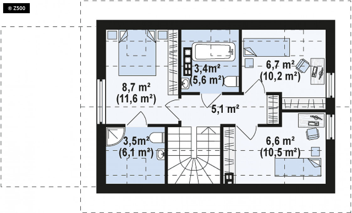 Projekt Z227 to piętrowy dom z dwuspadowym dachem i jednostanowiskowym garażem, którego zaletą jest bezpośrednie przejście do domu. Efektowne wykończenie elewacji, poprzez wkomponowanie drewnianych elementów oraz okładziny z płytek podkreśla jego wyjątkowy charakter. Wnętrze domu jest wygodne i funkcjonalne, podzielone na strefy. Parter to część dzienna domu, znajduje się tu przestronny salon połączony z jadalnią i kuchnią. Z pokoju dziennego jest możliwość wyjścia na taras. W lewej części domu zlokalizowano duże pomieszczenie gospodarcze, oraz WC. Piętro to strefa wypoczynkowa z trzema wygodnymi, obszernymi sypialniami i dwoma łazienkami. Jedna z Sypialni posiada własną prywatna łazienkę dostępną tylko z pokoju. Z227 to idealna propozycja dla osób lubiących innowacyjne rozwiązania. Dom łączy w sobie najlepsze cechy domu jednorodzinnego: jest praktyczny w użytkowaniu i nietypowy w wyglądzie.