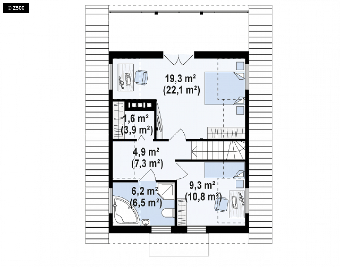 Z30 to przytulny i funkcjonalny dom z poddaszem użytkowym i dwuspadowym dachem. Główną zaletą projektu jest przestronna,zadaszona weranda. Pozwoli to domownikom przebywać na świeżym powietrzu nawet mimo niesprzyjajacej pogody. Narożnie usytuowany komin umożliwi podłączenie kominka również na tarasie. Prosta, zwarta bryła oraz nieskomplikowana konstrukcja wpłyną na niskie koszty budowy. Strefa parteru to salon z częściowo otwartą kuchnią, wydzielonym niewielkim pomieszczeniem gospodarczym, pokój oraz wygodna łazienka z oknem. Na poddaszu zlokalizowano dwie sypialnie oraz dużą łazienkę z garderobą. Lukarny w dachu umożliwiają optymalne wykorzystanie powierzchni poddasza. Z większego pokoju dostępny jest także obszerny zadaszony taras. Z30 występuje zarówno w wersji letniskowej jak i całorocznej. Duża powierzchnia zadaszonych tarasów sprzyja kontaktom z naturą, dlatego dom idealnie sprawdzi się w otoczeniu przyrody.