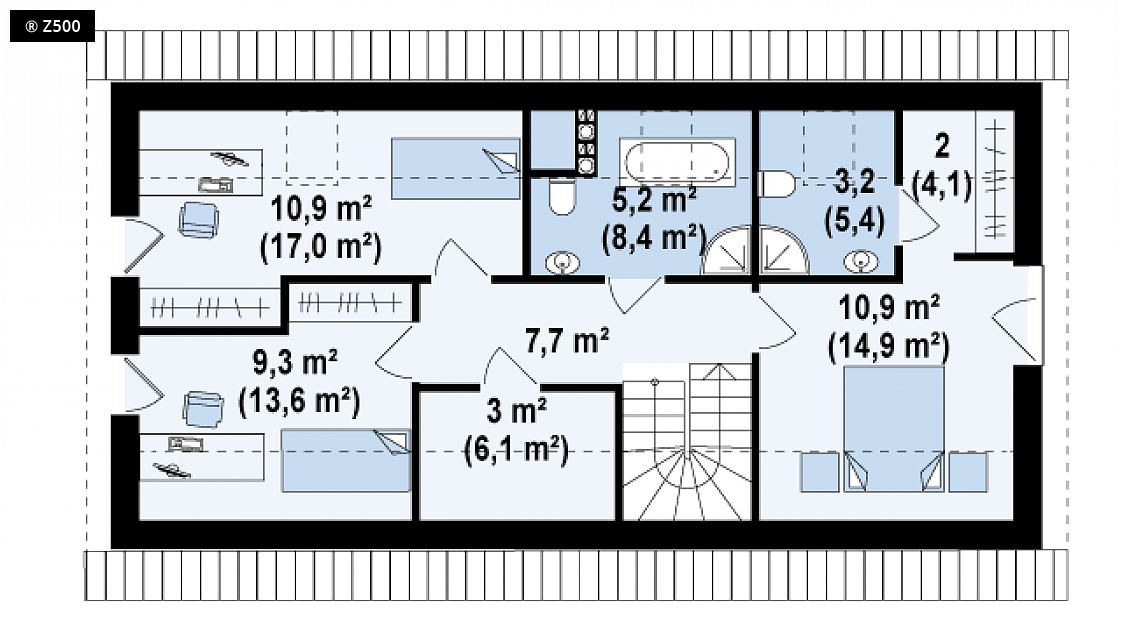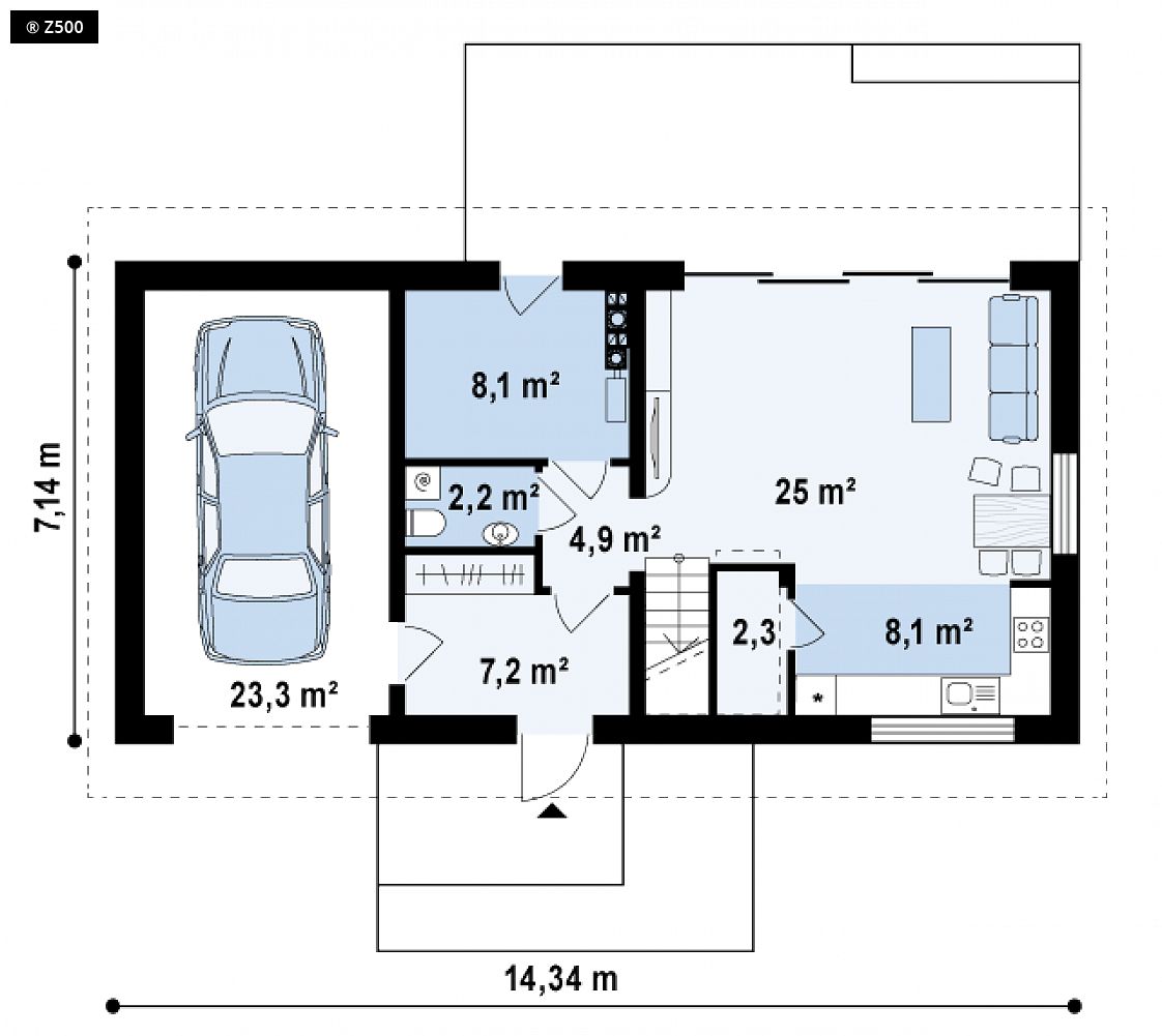 Z232 z kolekcji Sagitta to zapowiedź trendu wychodzącego naprzeciw zapotrzebowaniu na domy małe, ekonomiczne, tanie w budowie i utrzymaniu. Zwarta bryła, przemyślany i sprawdzony od lat układ funkcjonalny to serce tego wyjątkowego domu. Duże pomieszczenie gospodarcze z własnym wyjściem od strony ogrodu pomieści piec oraz wiele niezbędnych narzędzi.Z pomieszczenia gospodarczego można zrobić pokój gościnny a samo p.g. przenieść do garażu. W ten sposób można łatwo zyskać dodatkowy pokój. Intymnie ulokowany WC może pełnić również rolę pralni, w ten sposób wszystkie prace domowe można wykonywać na jednej kondygnacji. Miejscem odpoczynku jest dobrze doświetlony od strony południowej salon z jadalnią. Kuchnię ze spiżarką można wydzielić całkowicie np. przesuwnymi drzwiami z matowym szkłem, dzięki czemu spora ilość światła z salonu i jadalni wpłynie do jej wnętrza. Poddasze mieści 3 sypialnie z czego jedna master bedroom może posłużyć jako sypialnia dla rodziców z własną łazienka i garderobą.