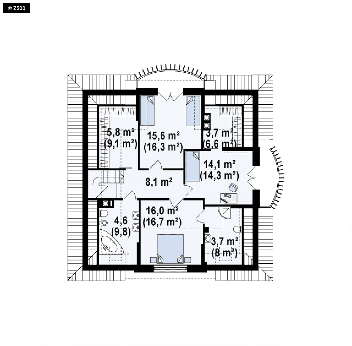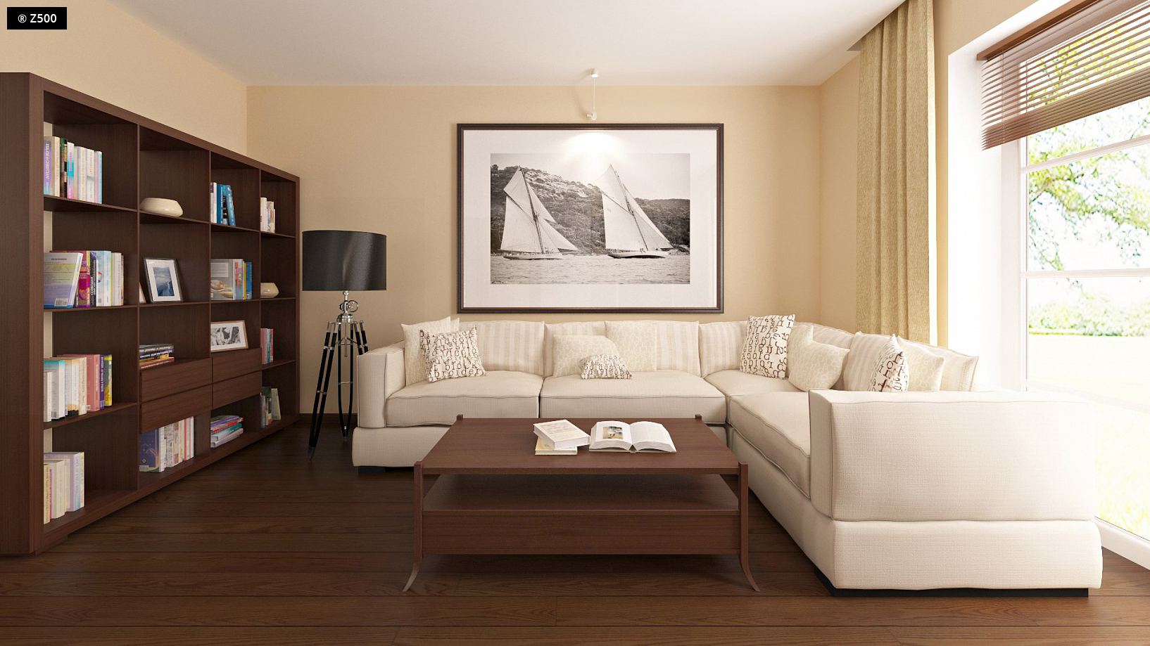 Z18 wykonano na rzucie zbliżonym do kwadratu. Wygląd zewnętrzny łączy klasykę ze współczesnymi rozwiązaniami. Kopertowy dach, lukarny, imponujący półokrągły taras, jak również klasyczne słupy podpierające podcień czynią dom dostojnym i eleganckim. Z holu głównego wchodzimy na schody oraz do pokoju gościnnego, który może pełnić rolę gabinetu. Hol wejściowy wtapia się w pokój dzienny tworząc jednoprzestrzenne wnętrze. W pokoju dziennym wydzielono aneks wypoczynkowy kominkowy i telewizyjny. Komin zaprojektowano tak, aby była możliwość usytuowania na zadaszonym tarasie kominka zewnętrznego. Przy kuchni przewidziano małą, ale wygodną spiżarkę oraz miejsce do spożywania posiłków. Na poddaszu istnieje możliwość wygospodarowania nawet 3 sypialni z garderobami oraz dwóch łazienek. Dwie sypialnie na poddaszu posiadają balkony, z widokiem na ogród.