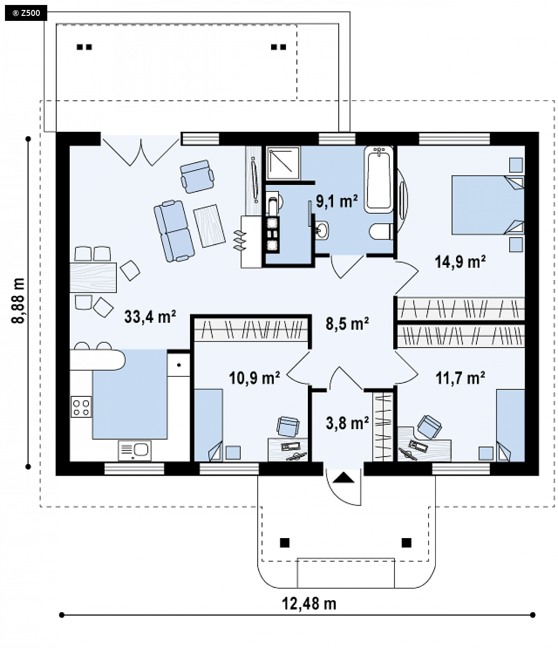 Z61 to niewielki lecz wyjątkowo wygodny projekt domu. Prosta konstrukcja i dwuspadowy dach sprawiają, że dom jest tani i łatwy w budowie. Tradycyjny, delikatny styl domu doskonale komponuje się z każdym otoczeniem. Prosta budowa pozwala na maksymalne wykorzystanie przestrzeni. Na szczególną uwagę w projekcie zasługuje praktyczne i funkcjonalne rozmieszczenie pomieszczeń. Wygodne połączenie kuchni i salonu znacznie powiększa całe pomieszczenie. Bogate przeszklenia naturalnie doświetlają ciepłe wnętrze. Centralnie usytuowany kominek ogrzeje cały dom i stworzy wyjątkowy klimat zimą. Z61 to projekt dla osób, które cenią sobie wygodę i komfort mieszkania. Dzięki prostej konstrukcji, dom jest tani i szybki w budowie. Niewielkie wymiary sprawiają, ze dom doskonale sprawdzi się także jako wygodny domek letniskowy.