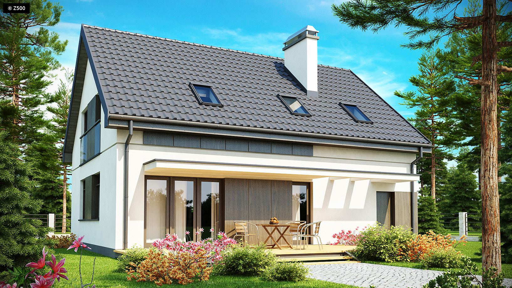 Projekt Z183 to elegancka propozycja domu o prostej bryle z dachem dwuspadowym. Okładzina z paneli włókno cementowych nadaje mu niepowtarzalnego uroku. Charakterystycznymi elementami domu są poziome zadaszenia zarówno strefy wejściowej jak i części tarasowej. Mały ale funkcjonalny, z centralnie zaprojektowaną klatką schodową, którą doświetla dodatkowo okno połaciowe. Na parterze znajduje się garaż wbudowany w bryłę budynku i spora kotłownia. Zaletą tego projektu jest pojedynczy komin co obniża koszty budowy i powoduje mniejsze straty ciepła. W części parterowej znajduje się część dzienno-rekreacyjna z dużym tarasem. Zaprojektowano dom z małą ilością komunikacji, z trzema sypialniami na poddaszu gdzie znajdują się też dwie garderoby i dwie łazienki. Z183 to idealna propozycja dla wszystkich szukających domu o wysmakowanej formie i funkcjonalnych rozwiązaniach.