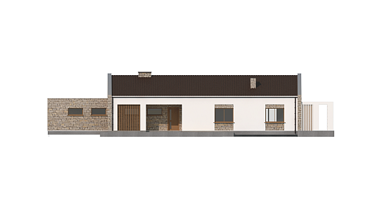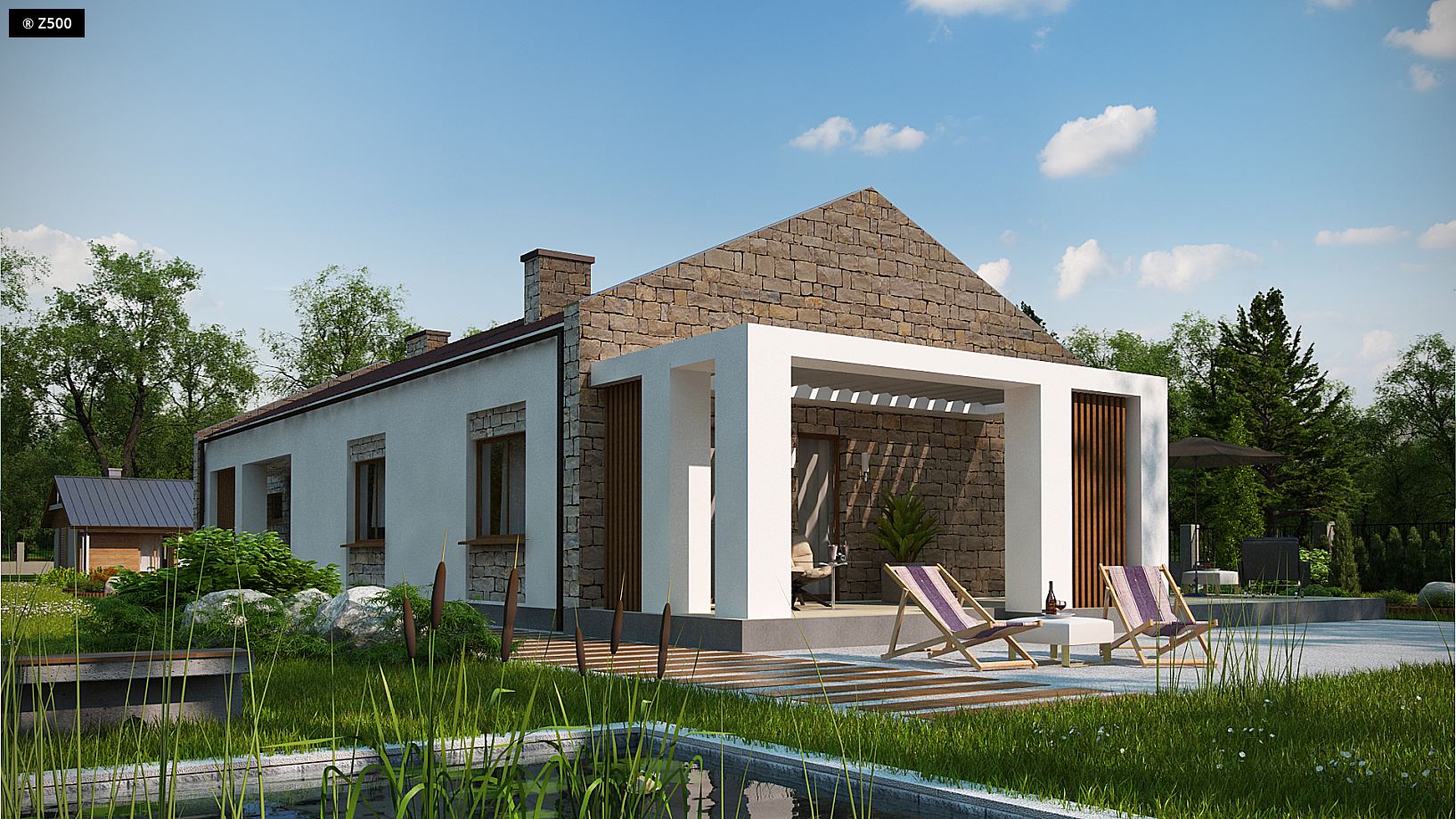 Drugi z serii domów Z500 projektowanych z myślą o wąskiej działce. Spiritus movens,czyli architekt, stworzył ów projekt będąc zainspirowanym stylem toskańskim, nie zaś spirytusowym, co może wywoływać mylne skojarzenia werbalne. J Elewacja to surowy, aczkolwiek ciepłej barwy kamień połączony z subtelnym drewnem i ośnieżonym białym tynkiem. W dwustanowiskowym garażu pomyślano o dostatecznej ilości miejsca aby nie odczuwać braku piwnicy. Pomieszczenie gospodarcze stanowi ogniwo łączące garaż z wiatrołapem, korytarzem i resztą domu. Duży salon, doświetlony z 3 stron świata zapowiada długie i szczęśliwe życie w komfortowych warunkach, bez obawy, że pojawi się czwarta, niemile widziana „Wróżka Północy” i rzuci zaklęcie burzące harmonię życia w Z314… Dwa tarasy osłonięte pergolami dodają szczyptę sielanki do opisywanego obrazu bajkowości… Całość pomieszczeń można gustownie zaaranżować podkreślając funkcjonalność podziału pomieszczeń na strefę dzienną i nocną domu. Kuchnia pozostaje w sąsiedztwie salonu i części jadalnej. Natomiast część nocna domu, to czarująco urządzona łazienka i trzy pokoje, z których każdy może stać się godną sypialnią „Śpiącej Królewny”.