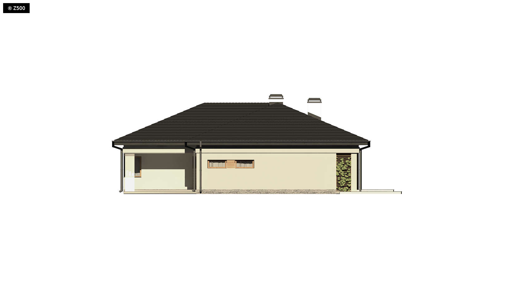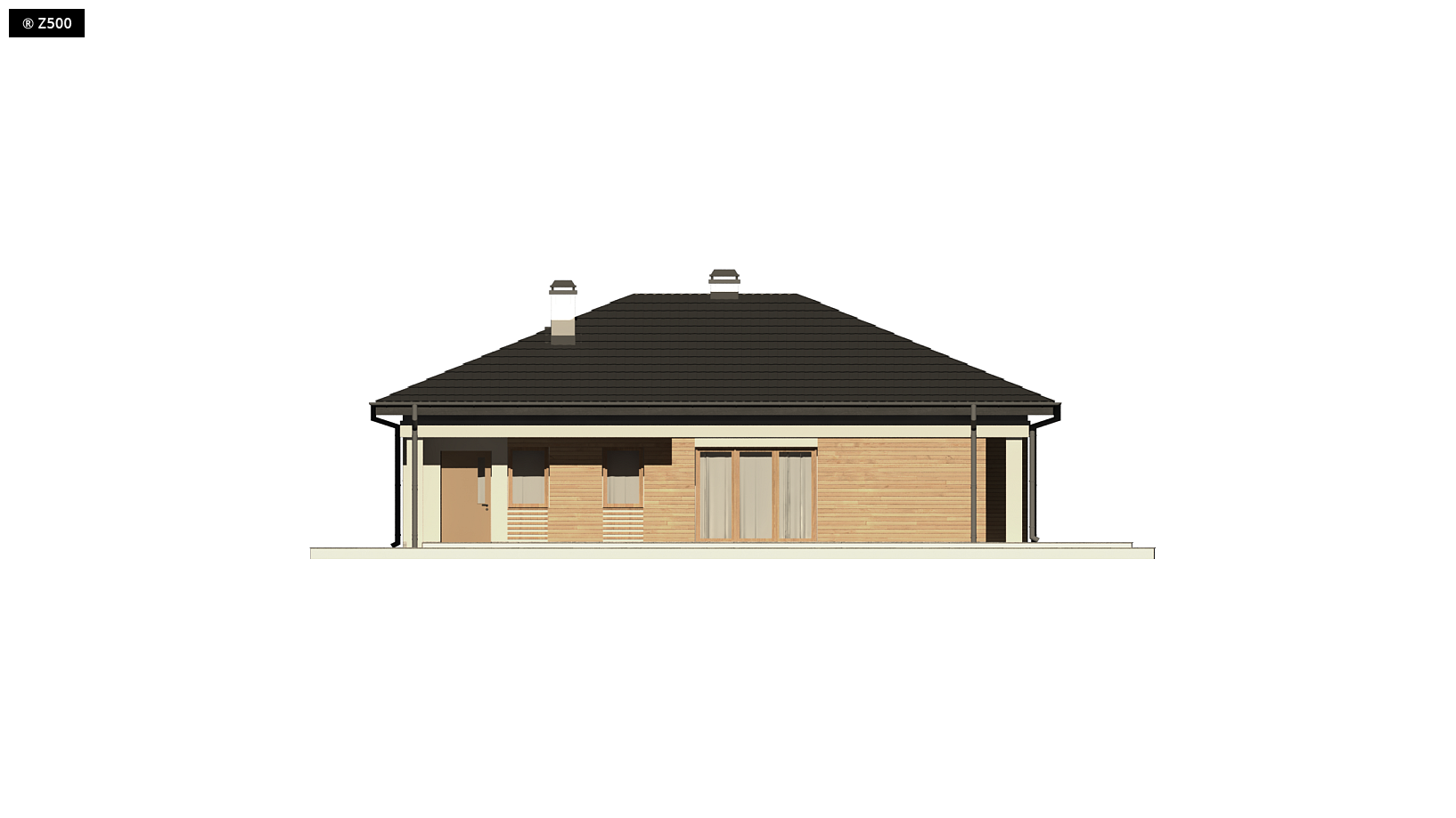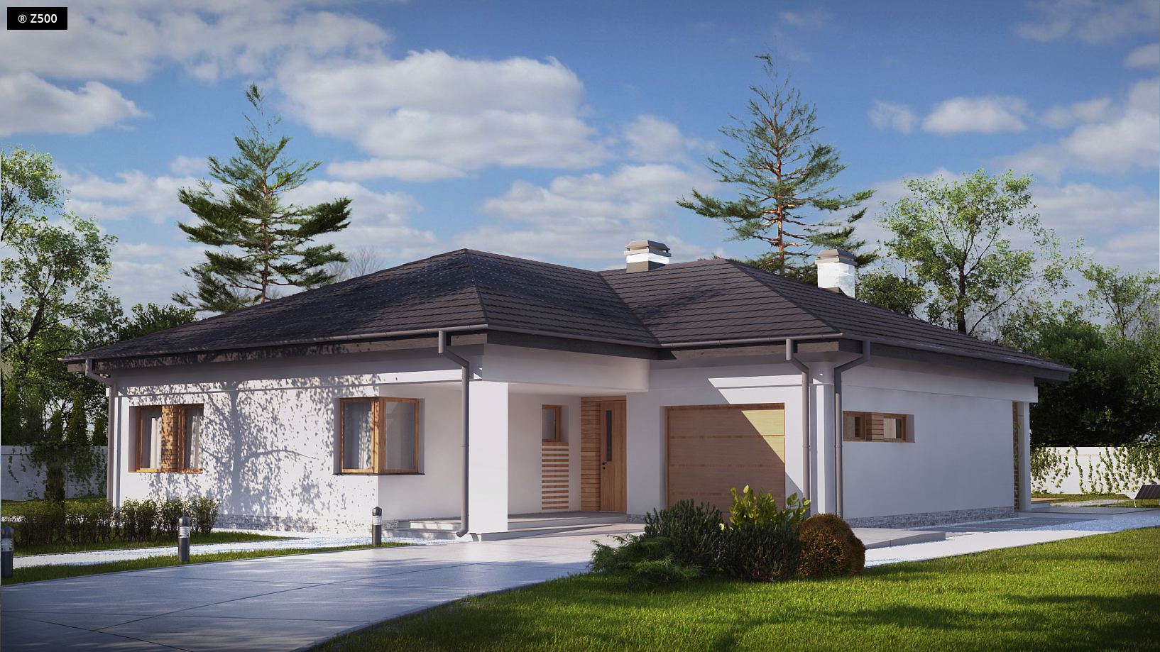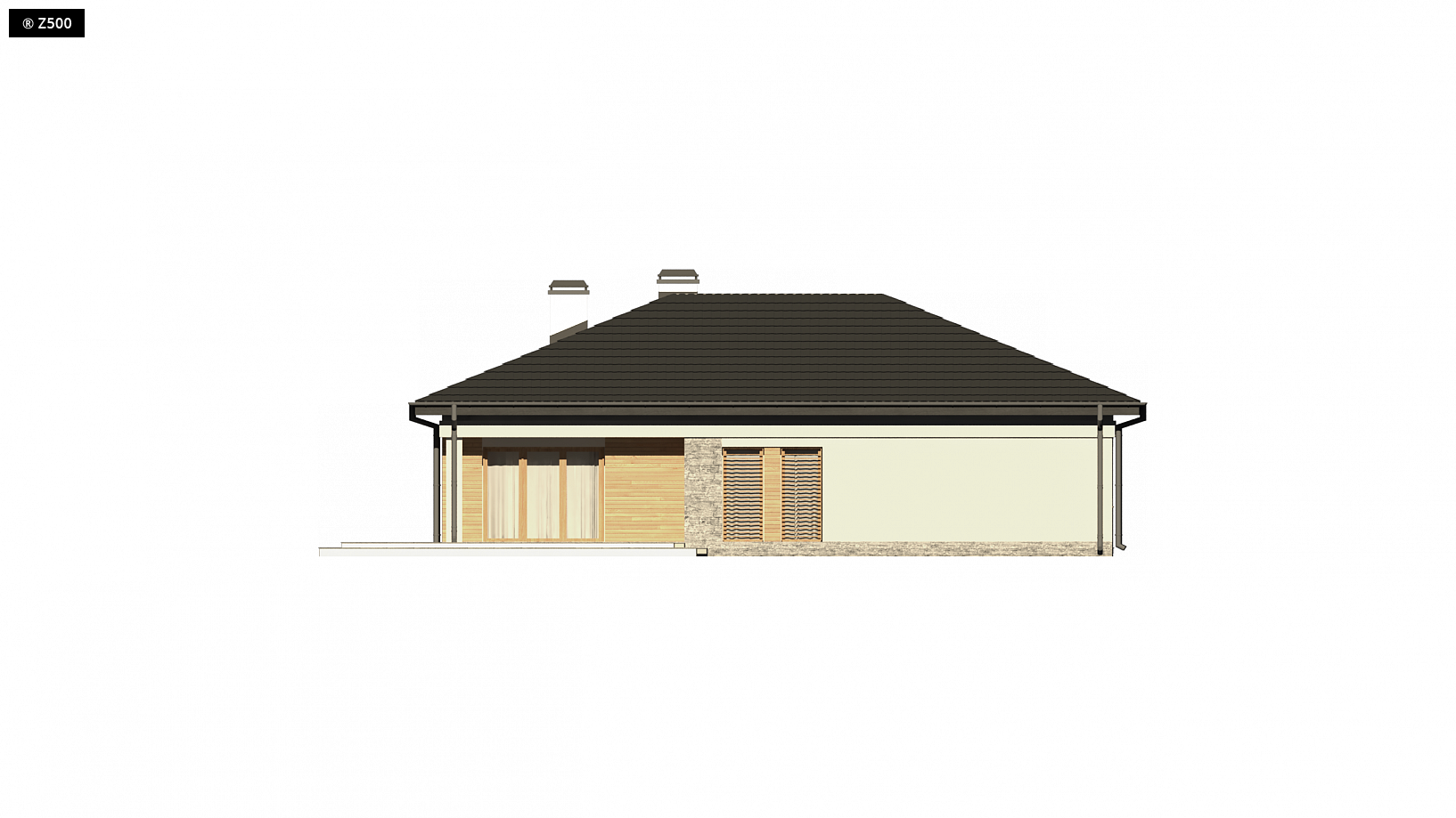 Projekt Z204 GP to funkcjonalny dom o programie użytkowym rozwiązanym w obrębie parteru. Prostą bryłę urozmaicono wysuwając lewe skrzydło przed front. Okładziny z drewna i kamienia na elewacjach nadają mu nowoczesny charakter. Atutem jest garaż oraz obszerne pomieszczenie gospodarcze dostępne także z ogrodu. Strefy reprezentacyjna oraz nocna są wyraźnie wydzielone, co zapewnia domownikom wygodę i komfort użytkowania. Strefa dzienna to przestronny salon z kominkiem i wyjściem na zadaszony taras, połączony z jadalnią oraz kuchnią. Jest tu także miejsce na podręczną spiżarkę oraz niewielką łazienkę z prysznicem. W części nocnej zaprojektowano trzy wygodne sypialnie oraz dużą łazienkę z oknem. Sypialnia gospodarzy z dużymi oknami balkonowymi została wyposażona dodatkowo w funkcjonalną garderobę. Z204 GP to projekt domu parterowego z poddaszem nieużytkowym, które ze względu na dość wygodną wysokość można zaadaptować na dodatkowe pomieszczenia.