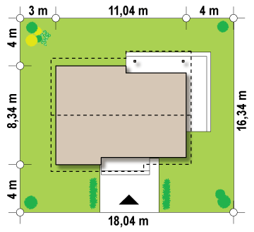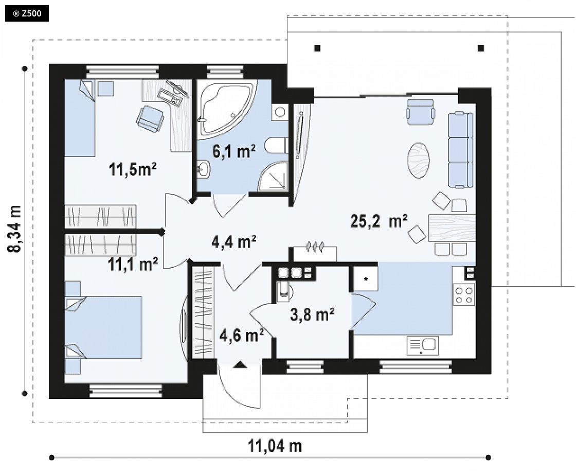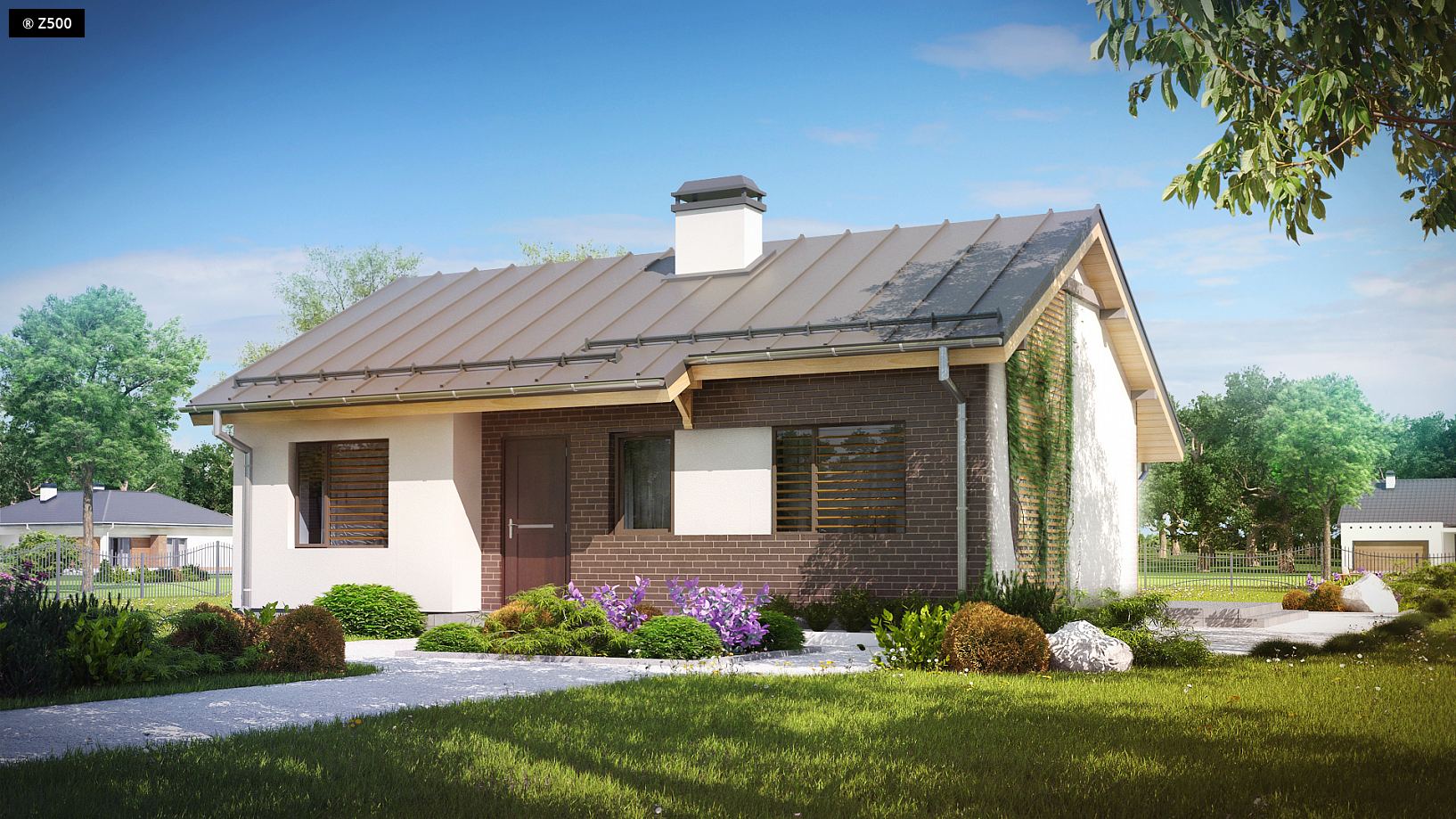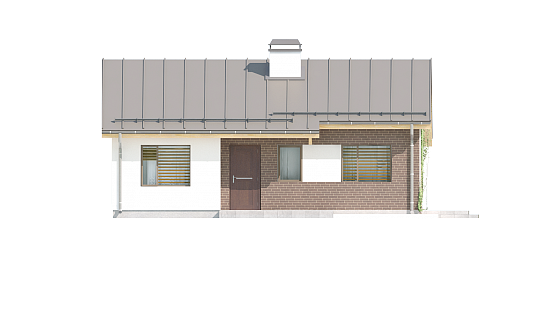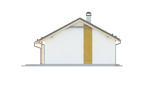 Projekt Z262 jest małym domem parterowym, zgrabnym i zwartym w formie. Dużą zaletą projektu jest oszczędna, prosta bryła z dwuspadowym dachem, co umożliwia szybką i tanią realizację. Przez zadaszone wejście wchodzimy do sporej sieni z miejscem na szafy. Stąd jest możliwość przejścia, przez pomieszczenie gospodarcze, do części dziennej, którą tworzy jasny, przestronny salon połączony jednoprzestrzennie z jadalnią i kuchnią. Z salonu jest możliwość bezpośredniego wyjścia na taras. Centralnie zlokalizowany hol jest łącznikiem pomiędzy poszczególnymi pomieszczeniami budynku. Lewa cześć domu to strefa nocna, znajdują się tu dwie wygodne sypialnie i duża łazienka z miejscem na wannę. Z262 to wyjątkowy i jednocześnie skromny dom, który wkomponuje się w każdy krajobraz i typ działki. Jest on doskonały dla osób ceniących funkcjonalne rozmieszczenie pomieszczeń na jednym poziomie i niewielkiej powierzchni