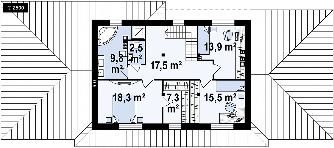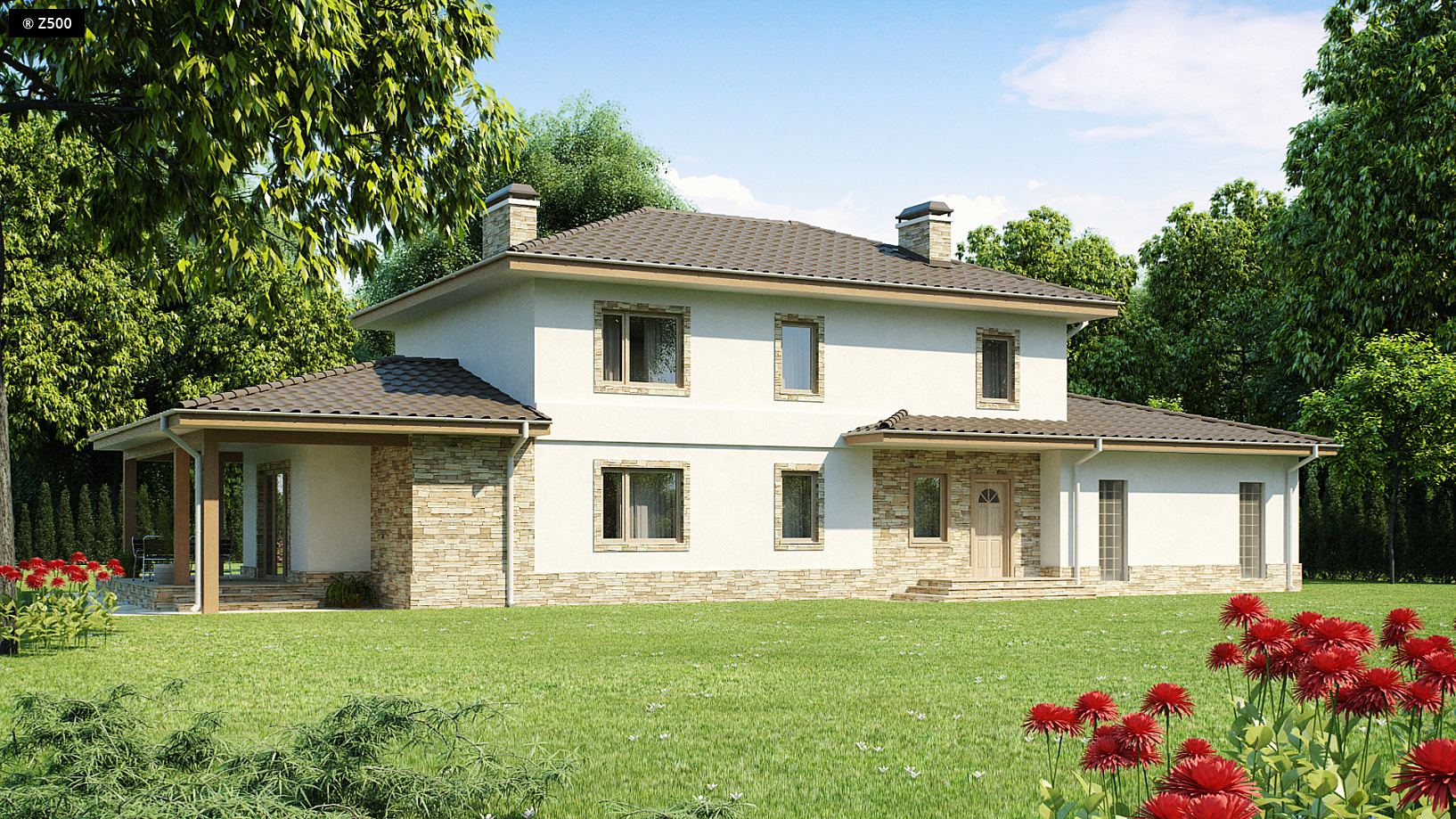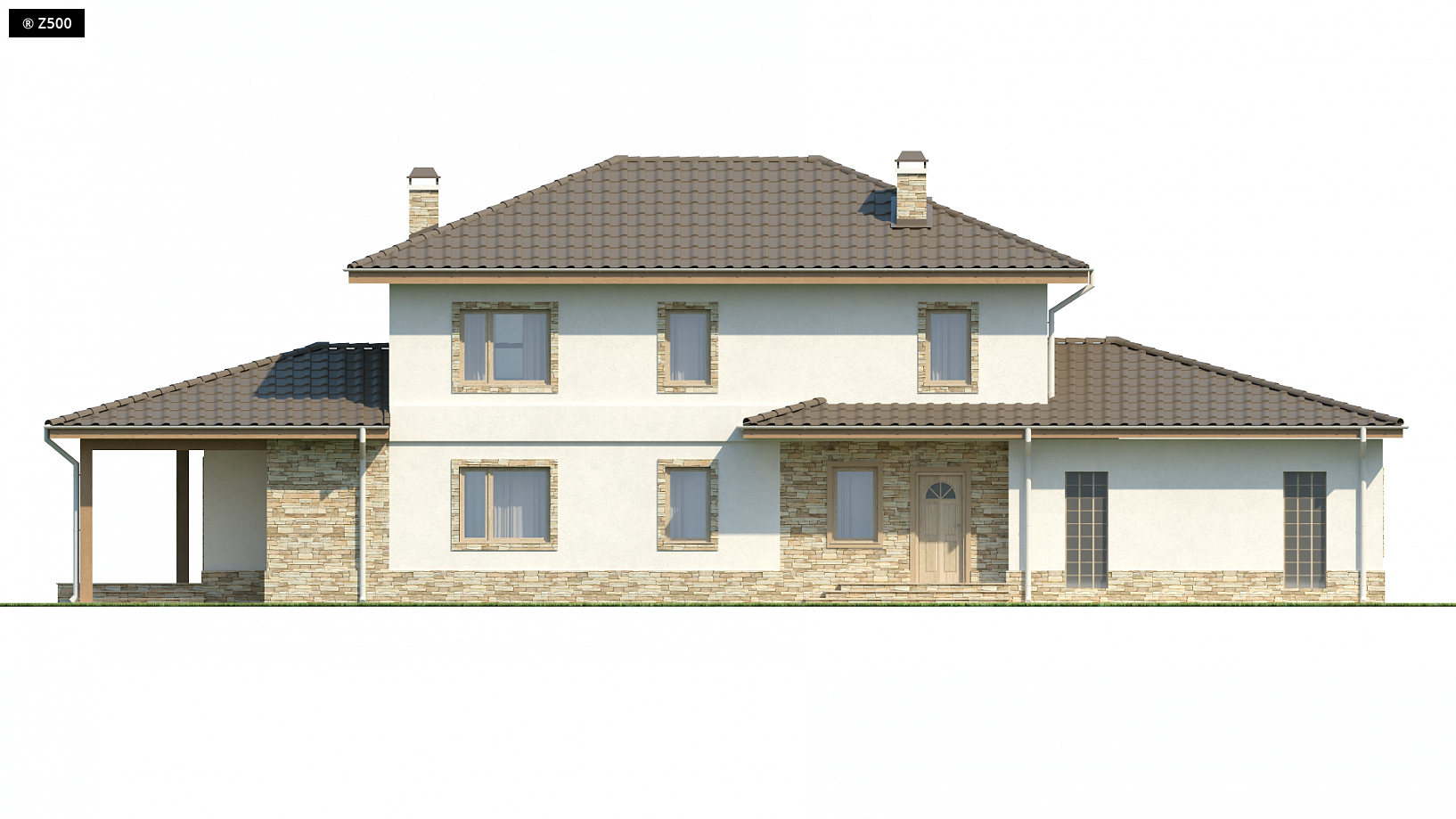 Z74 to projekt domu piętrowy z bogatym układem funkcjonalnym. Bryła budynku, rozbudowana w części parterowej, podzielona jest na część dzienną z tarasem i intymna strefę z przejściem do garażu Na parterze w skrzydle stanowiącym część dzienną budynku znajduje się salon z kompleksem jadalnym oraz kuchnia ze spiżarnią. Kuchnie zaprojektowano jako pół-otwartą wydzieloną podwyższonym bufetem. W salonie duże, przeszklone drzwi zapewniają doświetlenie i możliwość wyjścia na taras i do ogrodu. Przeciwne skrzydło domu to obszerny pokój z garderobą, WC, łazienka z wanną i kotłownia z wyjściem na zewnątrz. W tej części domu zlokalizowano także duży garaż na dwa auta z pomieszczeniem gospodarczym. Piętro to trzy sypialnie z oknami w ścianach bocznych i miejscami na wnękowe szafy oraz dwie łazienki połączone holem.