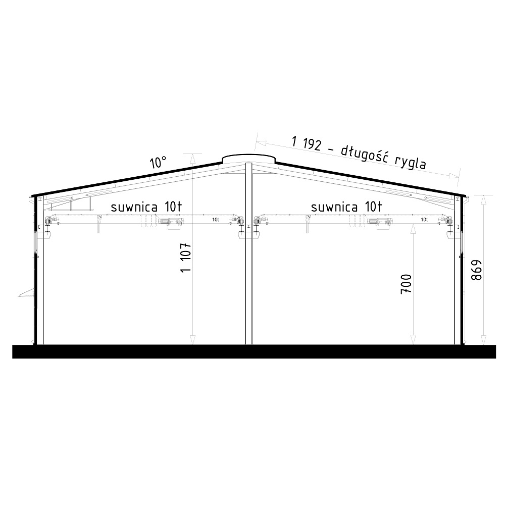 Dodatkowym i niewątpliwym atutem proponowanej hali jest możliwość wykorzystania zaprojektowanego transportu podwieszonego. Konstrukcja hali została przystosowana do wykorzystania dwóch suwnic natorowych, o udźwigu 10 ton każda. Suwnice umieszczone są w obu nawach hali i poruszają się wzdłuż dłuższego jej boku. Wysokość prześwitu od posadzki do belki suwnicy to 7,00m, która może nieznacznie różnić się (+/-) w zależności od modelu suwnicy lub dostawcy. Dzięki takiemu rozwiązaniu hala może znaleźć swoje zastosowanie również tam gdzie prowadzona działalność ma charakter przemysłowy lub ciężki (betoniarnie, zakłady prefabrykacji, tartaki czy kamieniarnie).